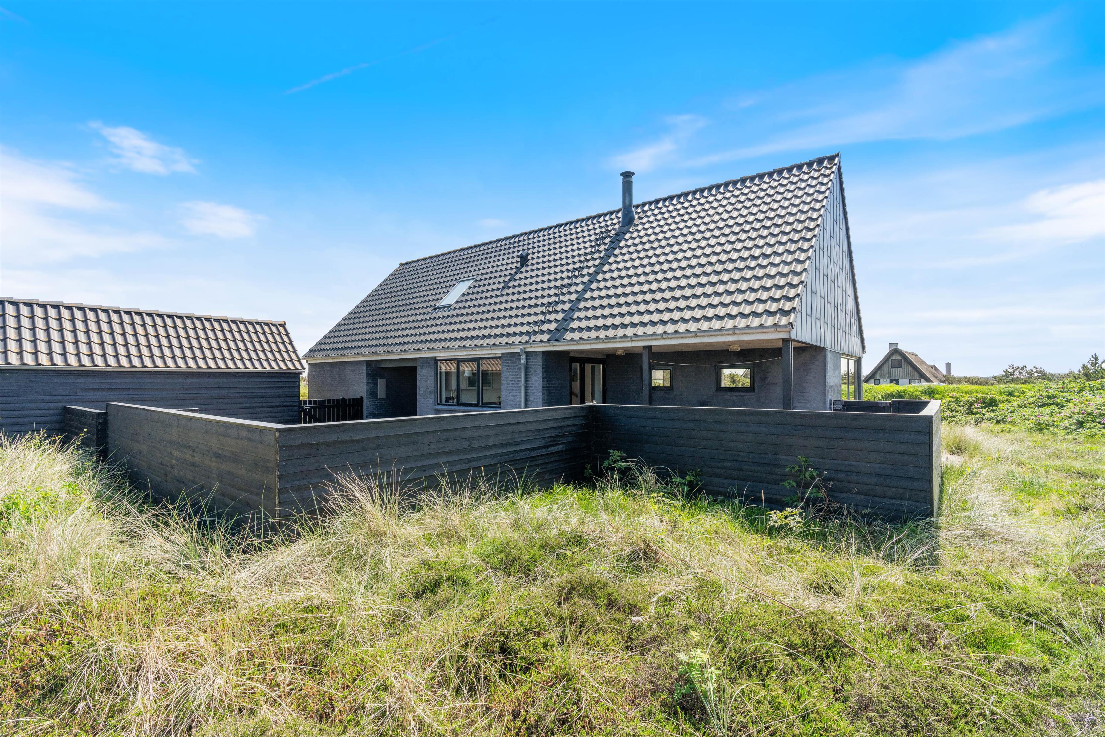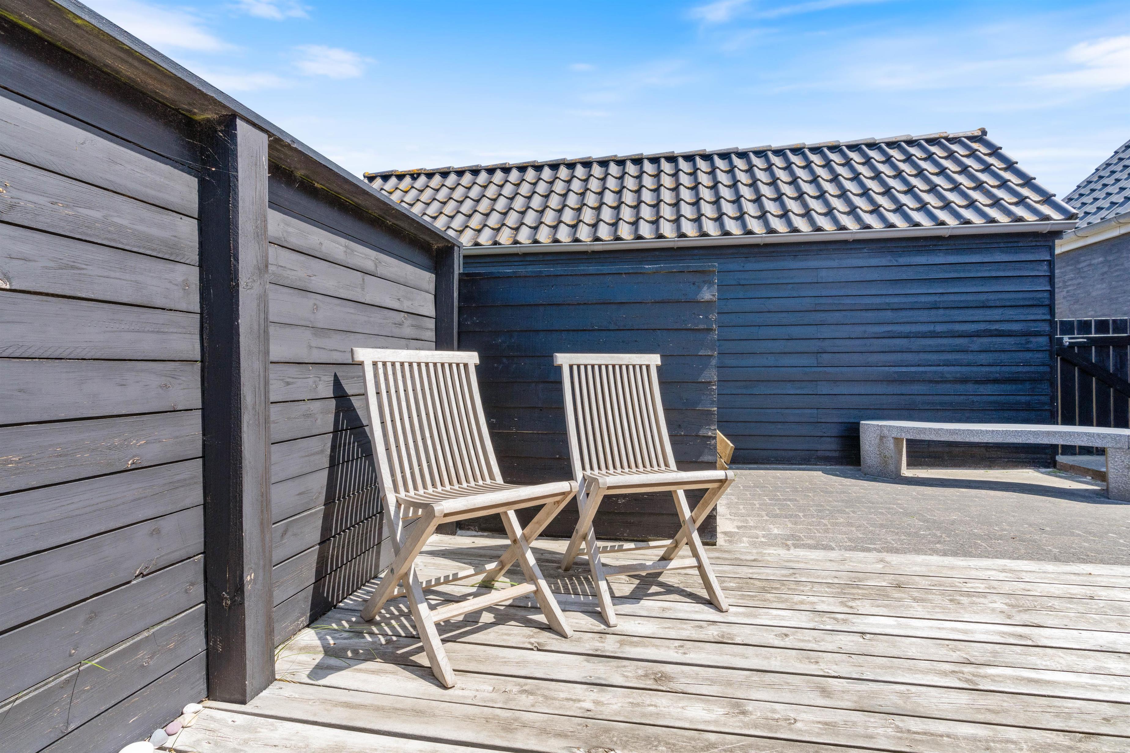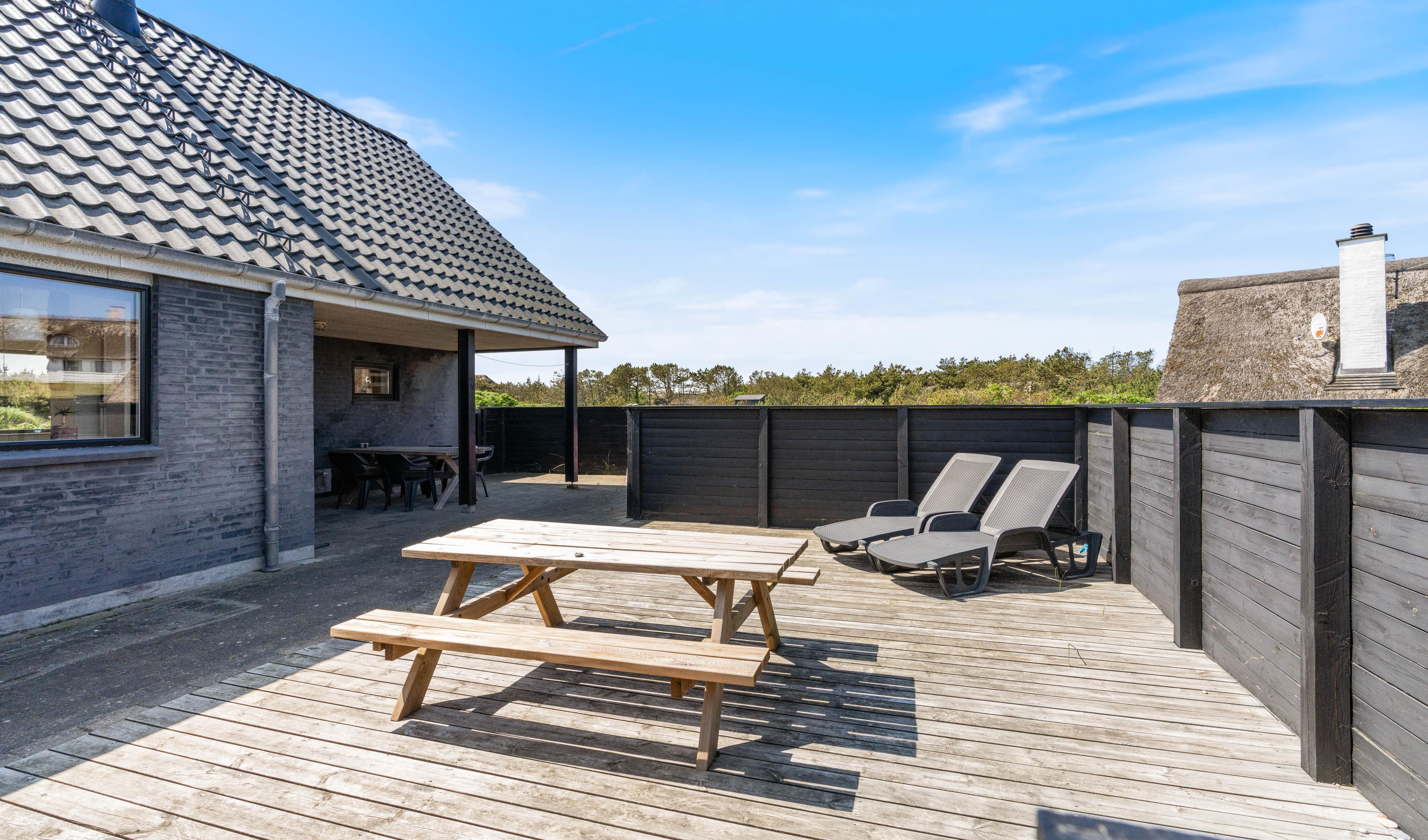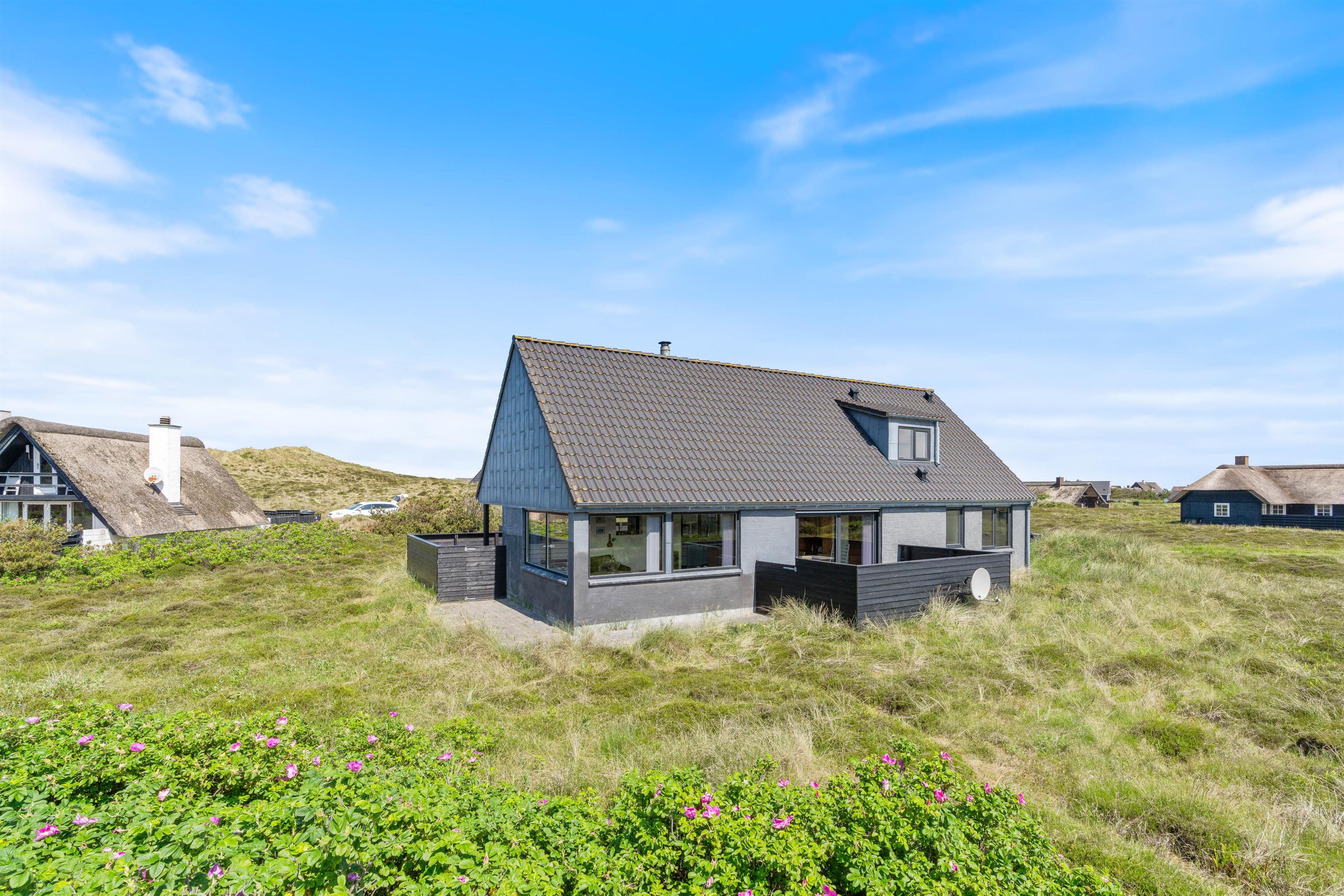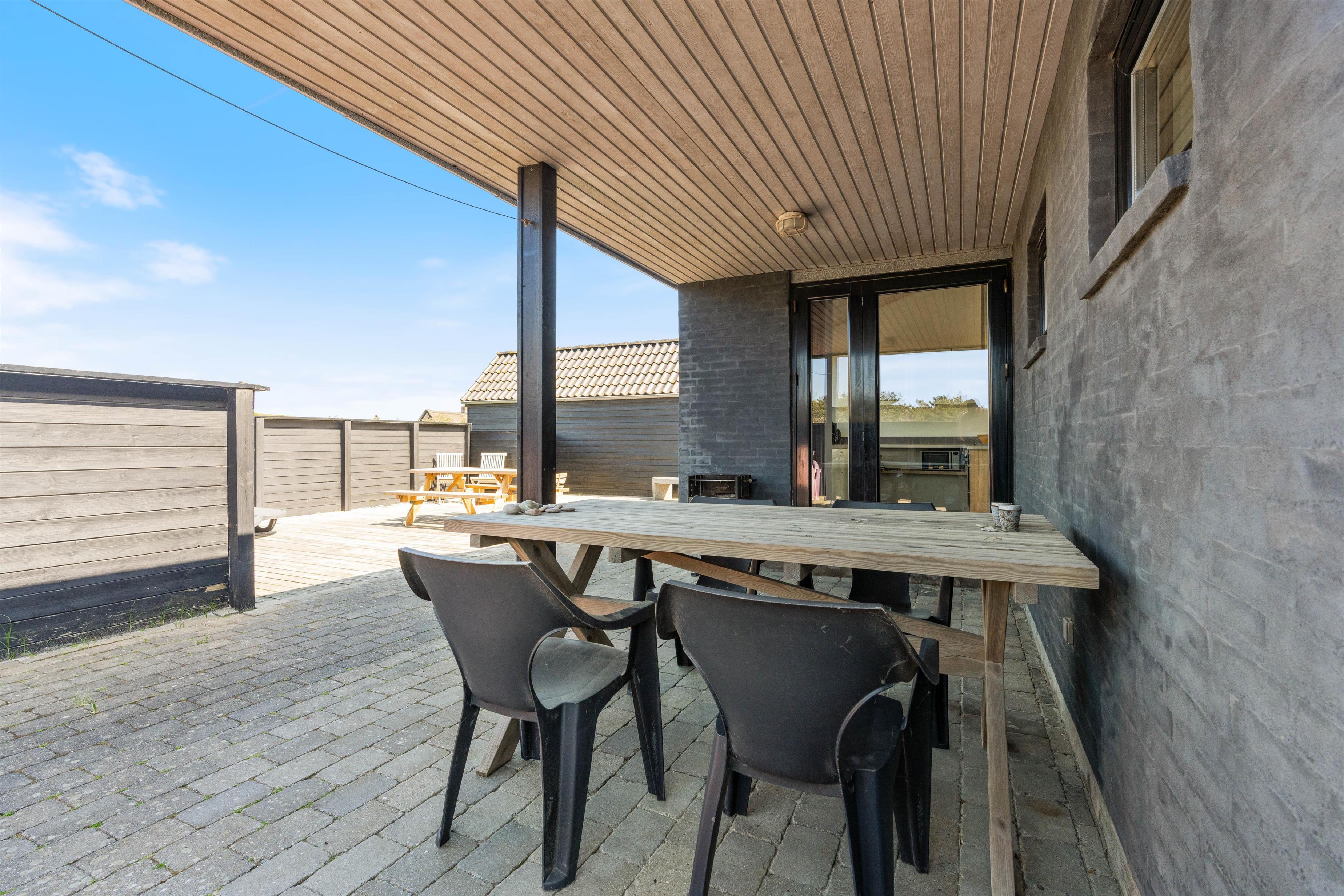 Der er flere gode terrasser til huset samt en carport til bilen. En lukket terrasse mod syd, ideel til små børn og til en hund. Mod nordvest er der en skøn delvist overdækket terrasse, som også lukket. Alt i alt masser af skønne lækroge rundt omkring. Huset ligger i skønne omgivelser på den lyngklædte naturgrund, hvor der også forefindes et gyngestativ til de yngste feriegæster. Der er kun 400 m til Vesterhavet og store fredede arealer ligger blot få hundrede meter fra huset både mod syd og nord og giver mulighed for gode traveture i den fantastiske natur.