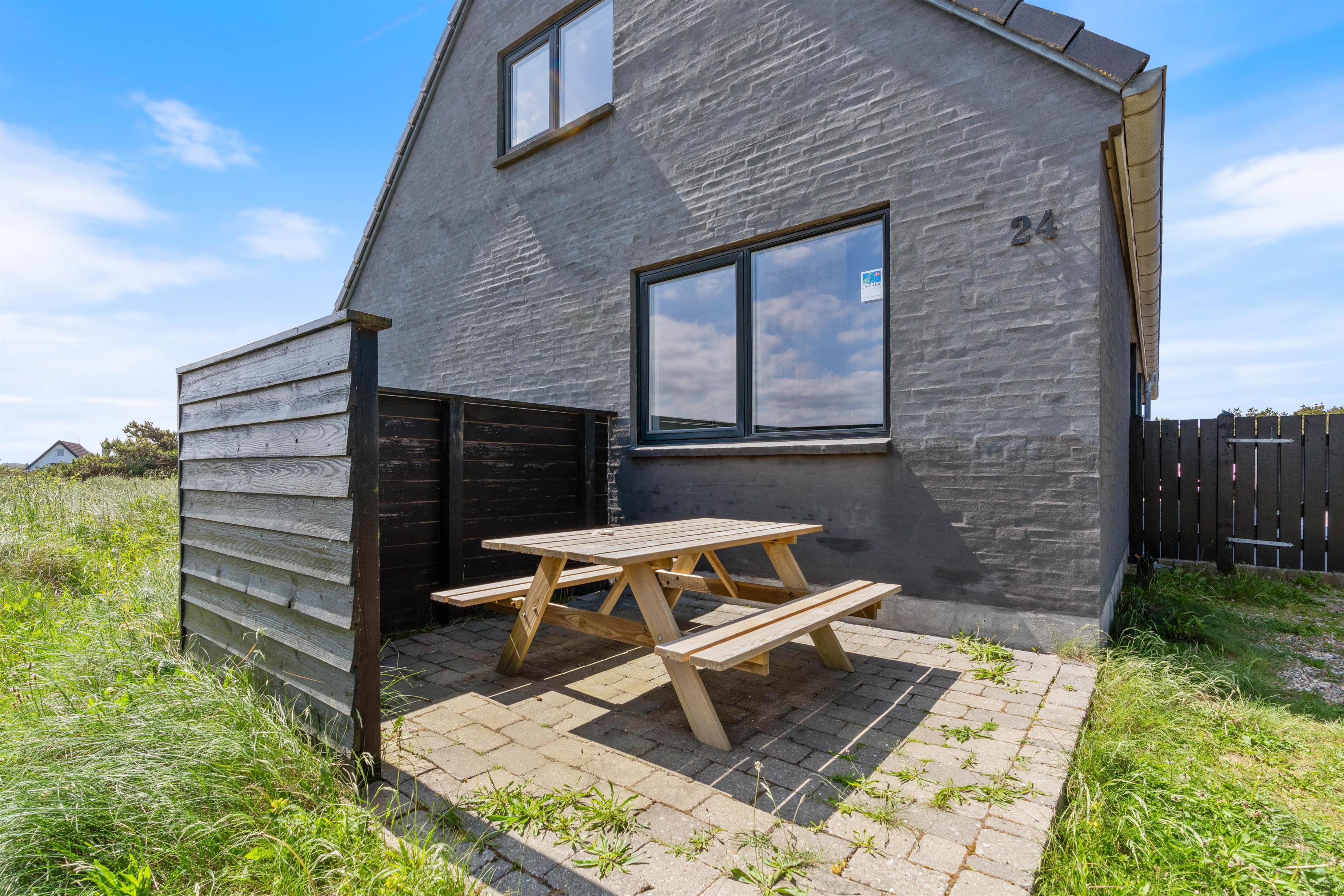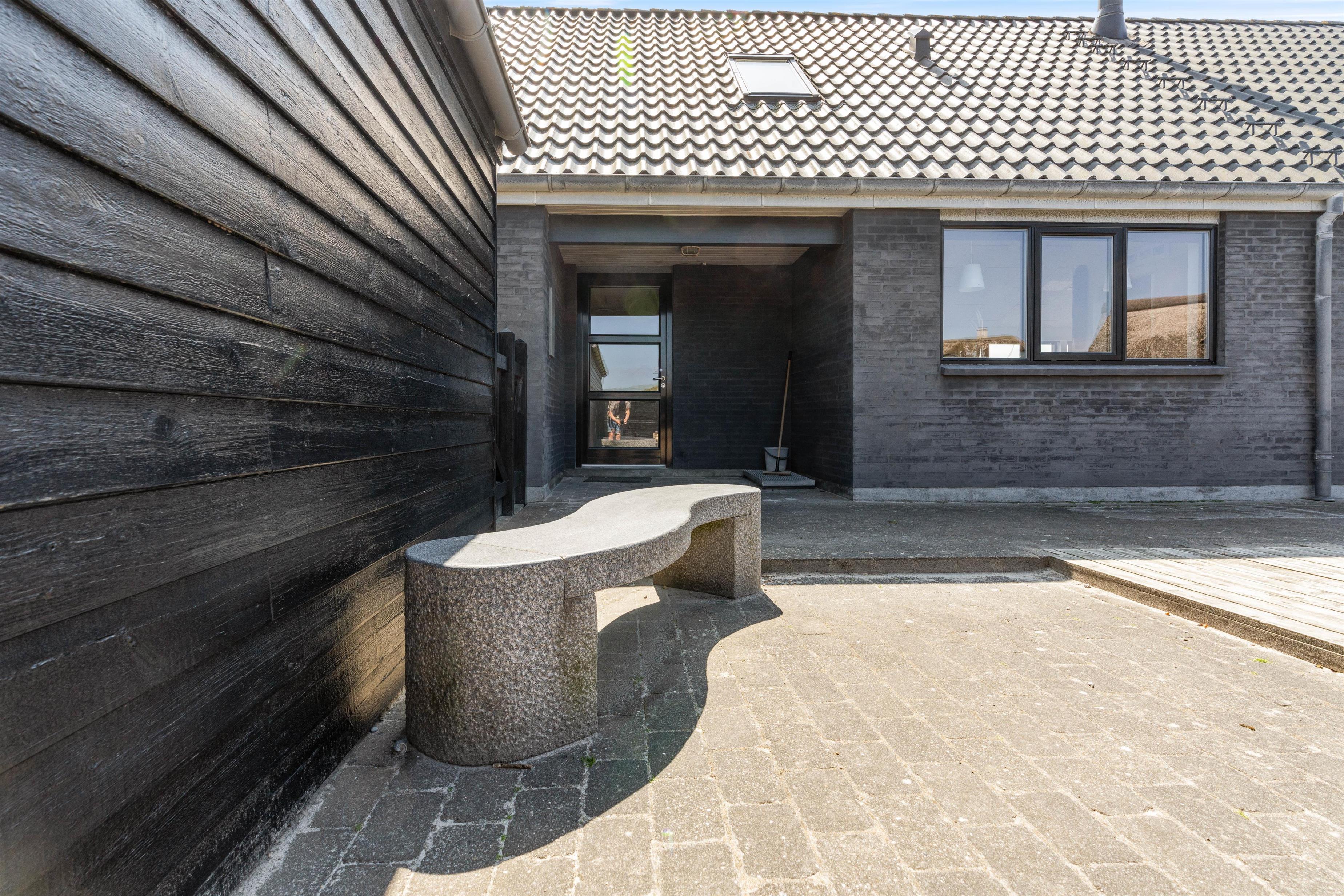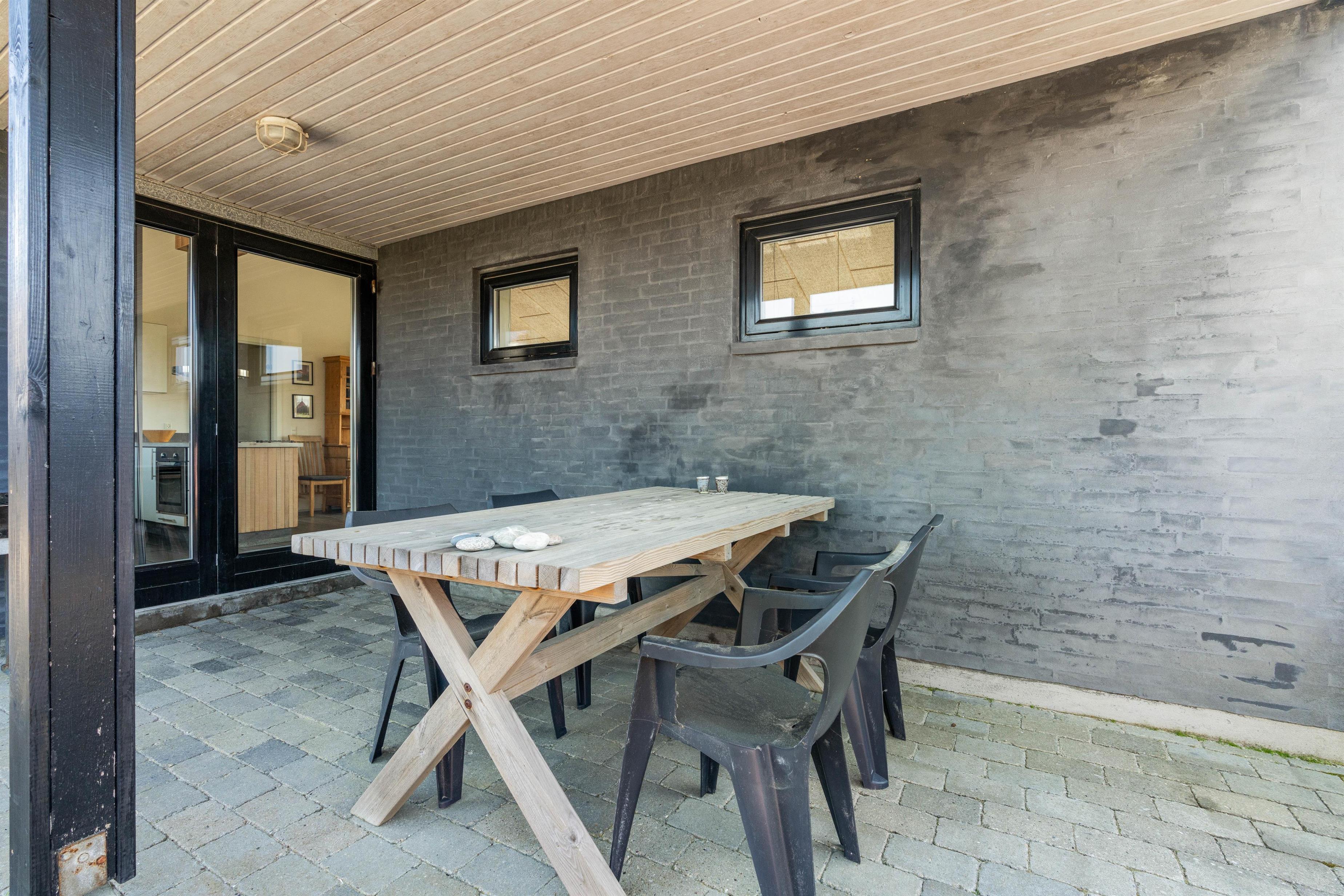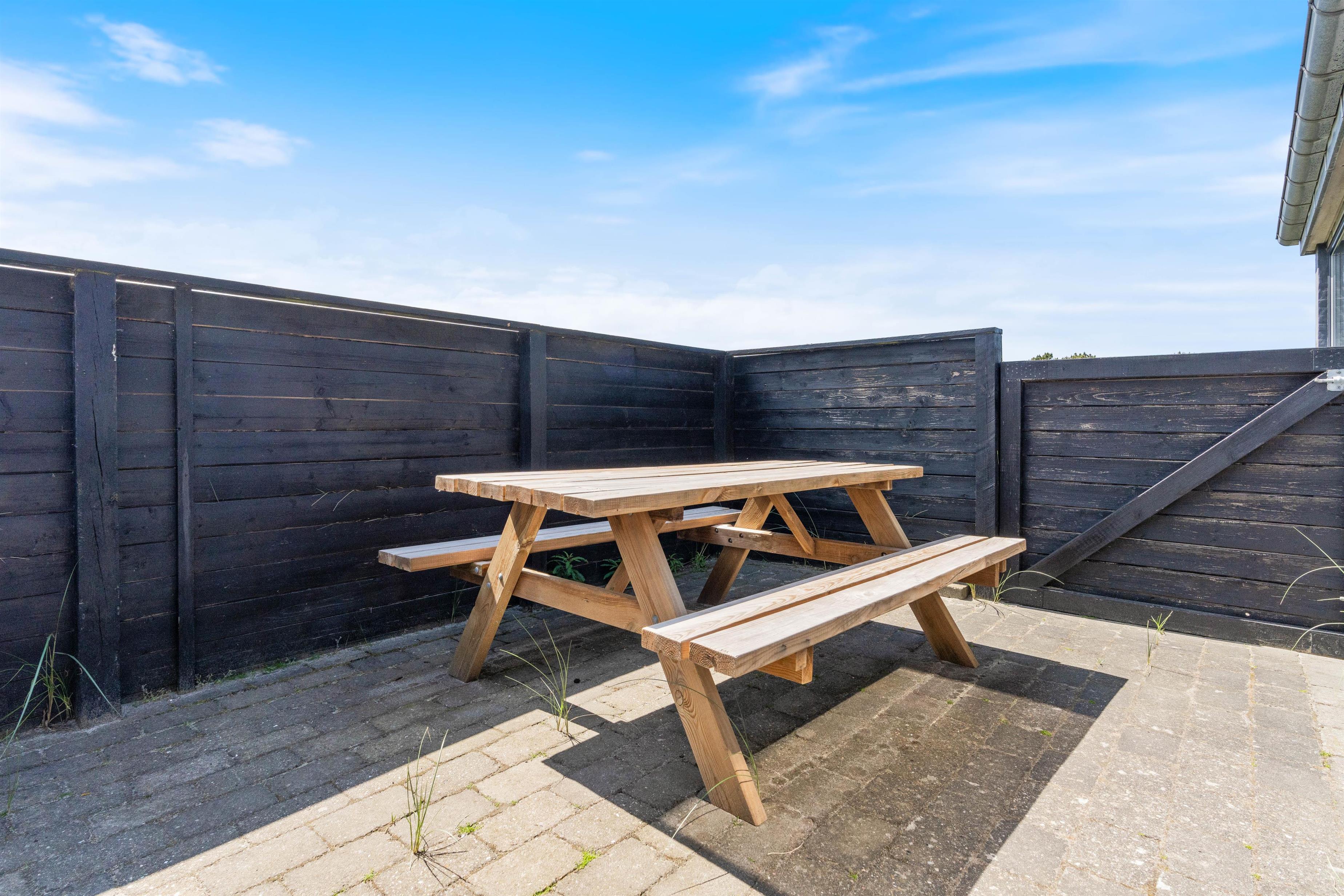 Der er flere gode terrasser til huset samt en carport til bilen. En lukket terrasse mod syd, ideel til små børn og til en hund. Mod nordvest er der en skøn delvist overdækket terrasse, som også lukket. Alt i alt masser af skønne lækroge rundt omkring. Huset ligger i skønne omgivelser på den lyngklædte naturgrund, hvor der også forefindes et gyngestativ til de yngste feriegæster. Der er kun 400 m til Vesterhavet og store fredede arealer ligger blot få hundrede meter fra huset både mod syd og nord og giver mulighed for gode traveture i den fantastiske natur.