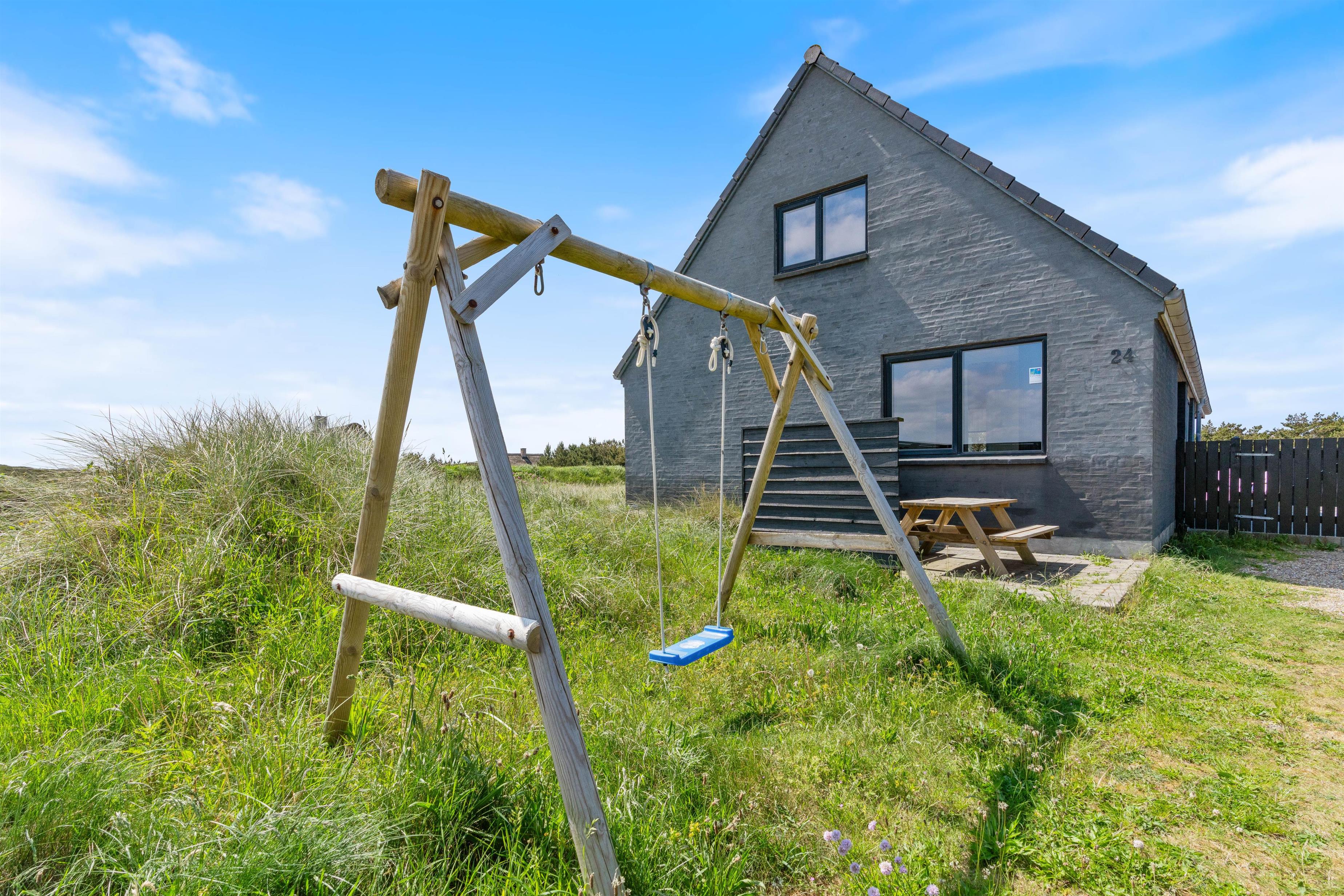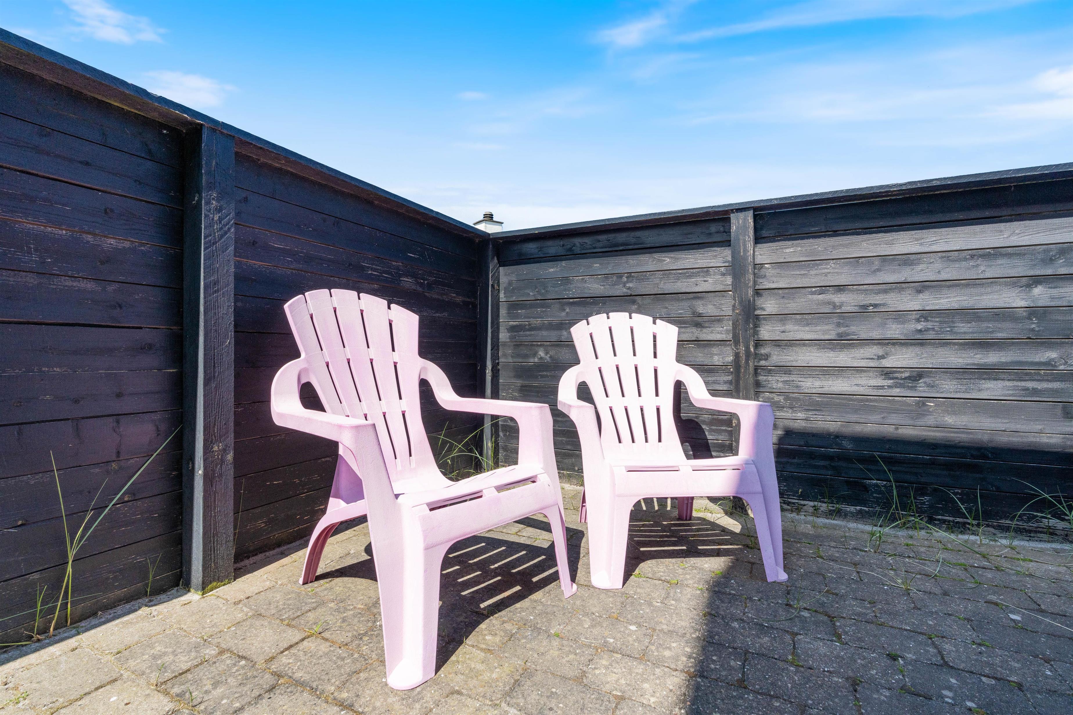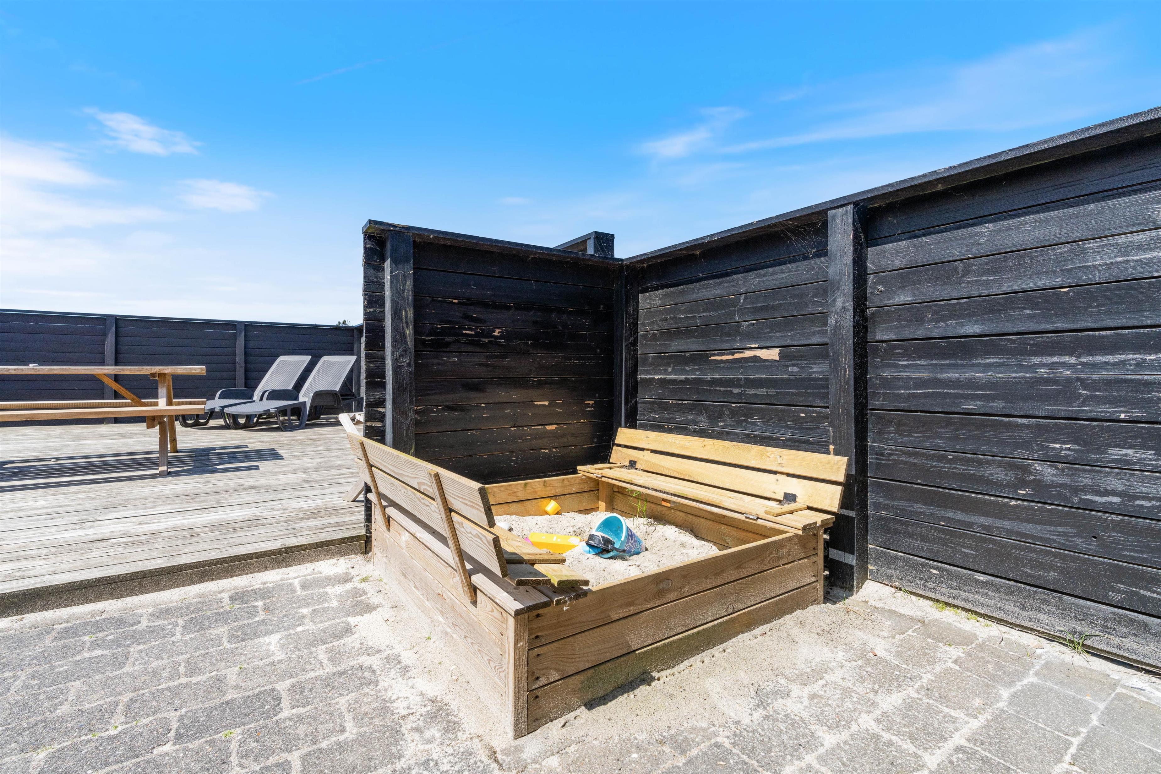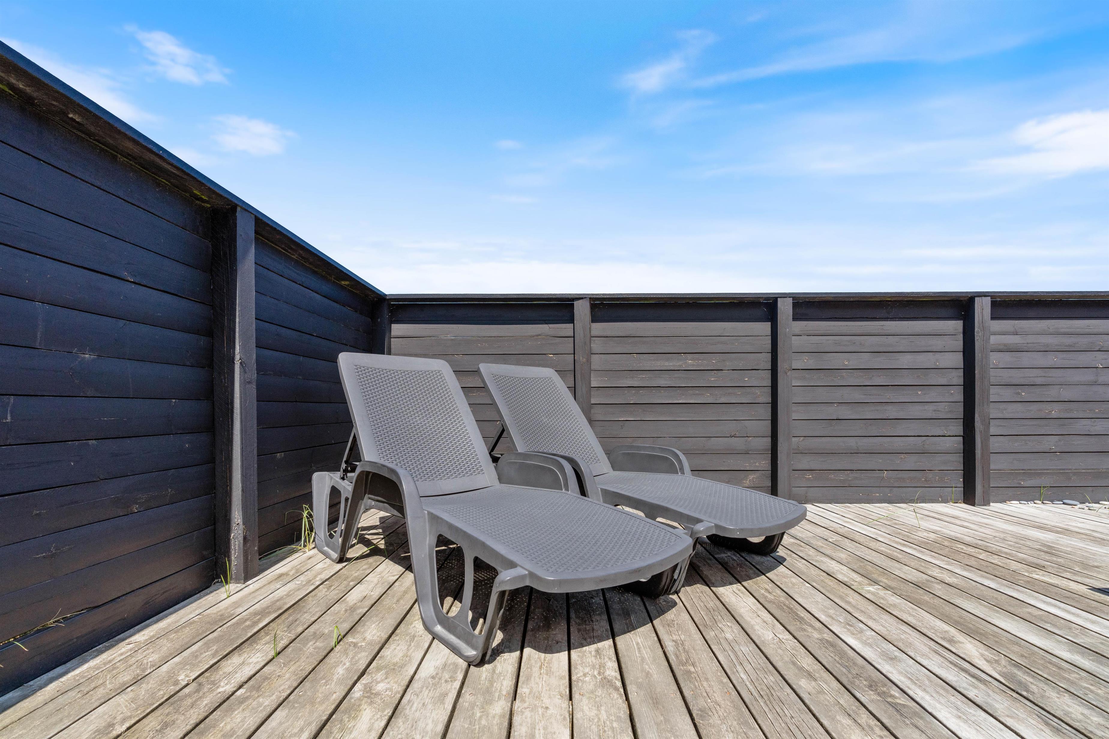Der er flere gode terrasser til huset samt en carport til bilen. En lukket terrasse mod syd, ideel til små børn og til en hund. Mod nordvest er der en skøn delvist overdækket terrasse, som også lukket. Alt i alt masser af skønne lækroge rundt omkring. Huset ligger i skønne omgivelser på den lyngklædte naturgrund, hvor der også forefindes et gyngestativ til de yngste feriegæster. Der er kun 400 m til Vesterhavet og store fredede arealer ligger blot få hundrede meter fra huset både mod syd og nord og giver mulighed for gode traveture i den fantastiske natur.