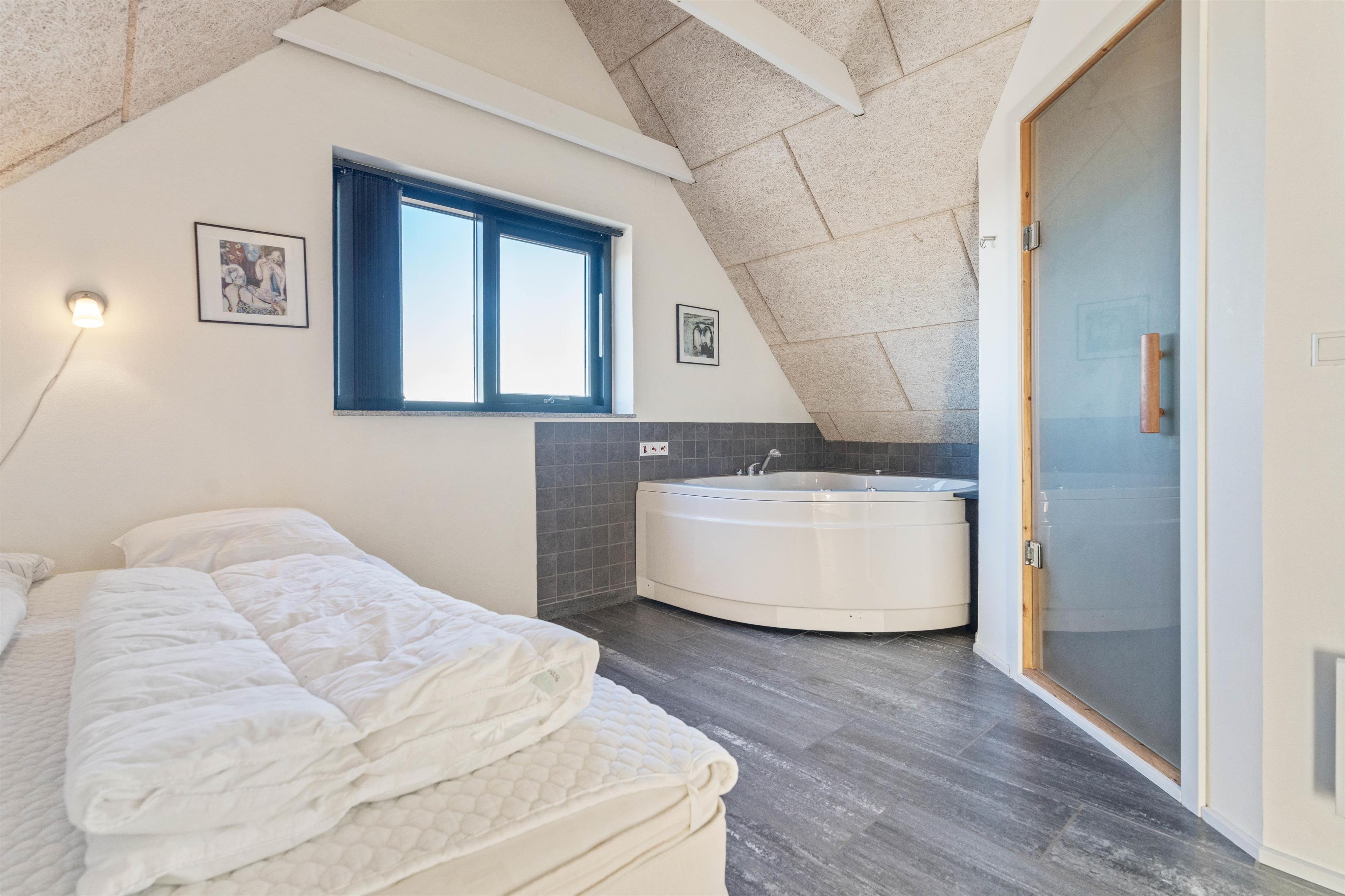Flot og meget velindrettet sommerhus bygget af de bedste materialer. På 1. sal er det store soveværelse indrettet med spa og adgang til sauna og badeværelse via matterede glasdøre. Dejlige terrasser rundt om huset. Der er energibesparende varmepumpe og trådløst internet i huset. 1 hund tilladt.