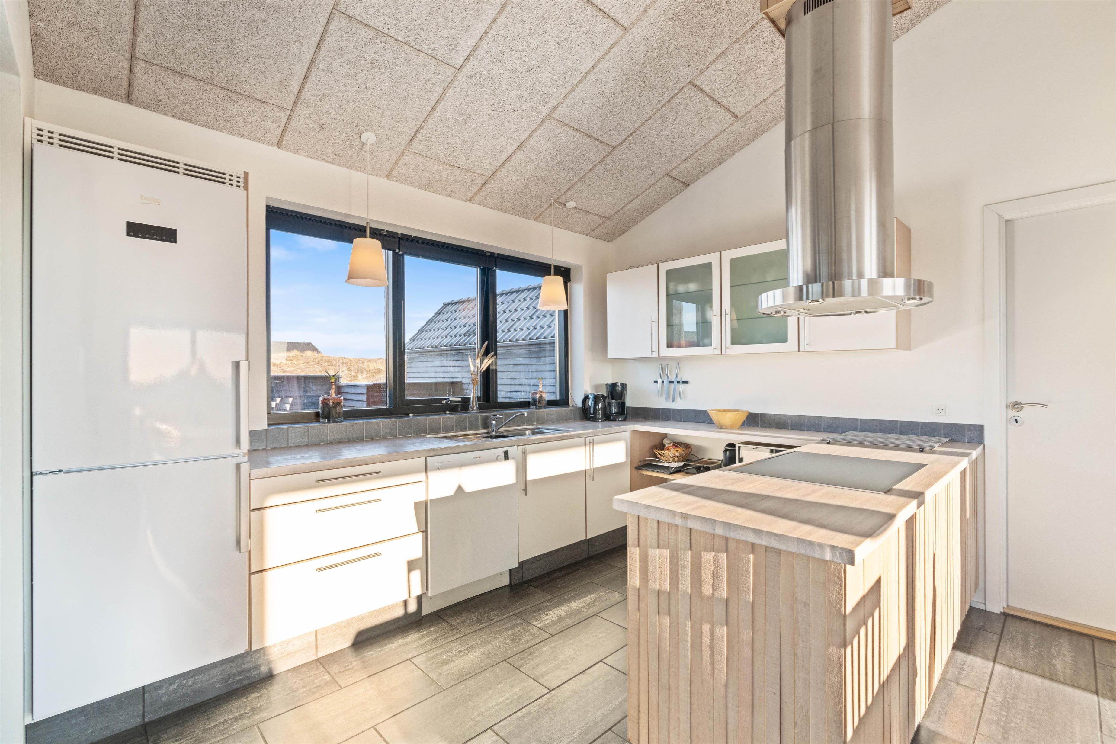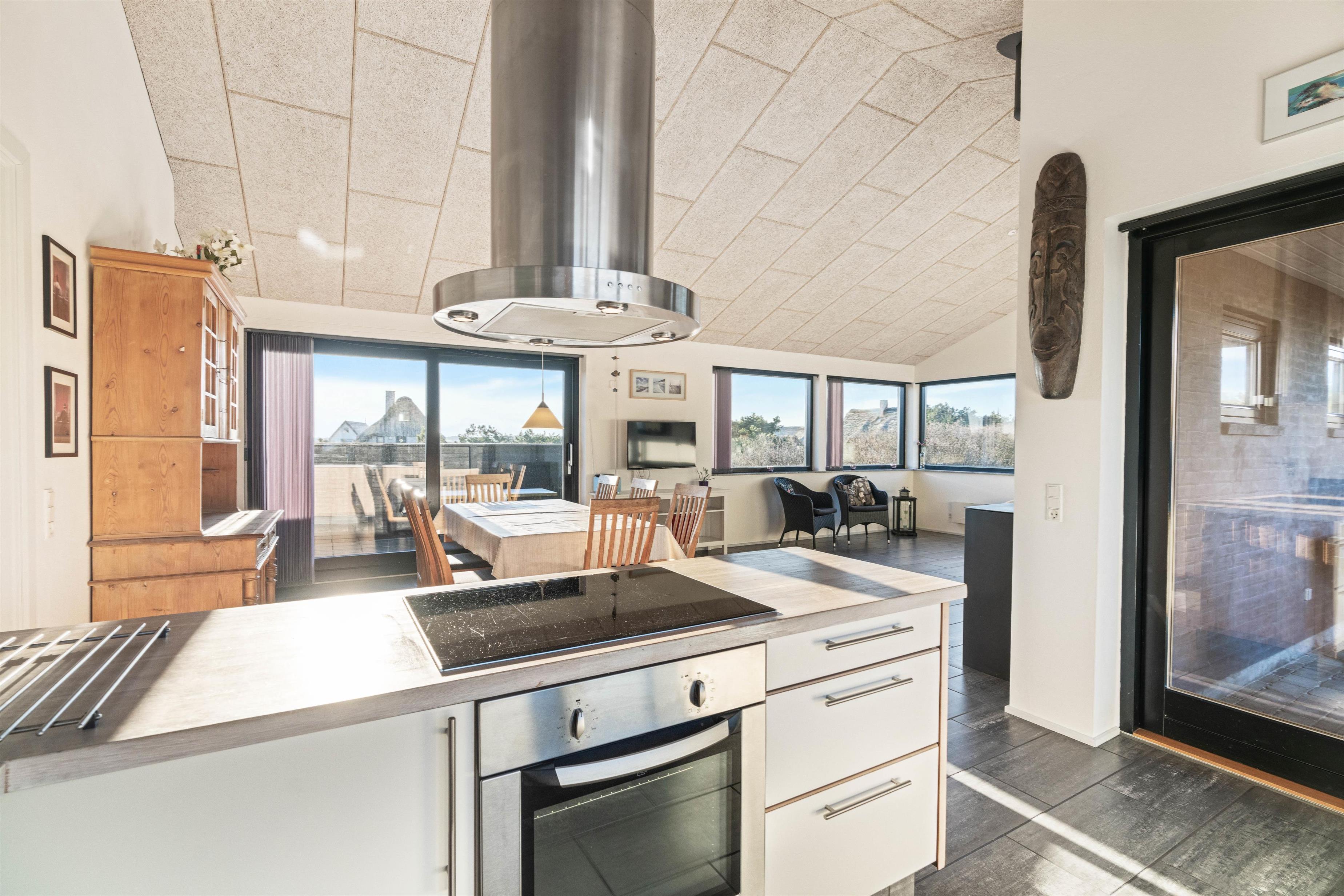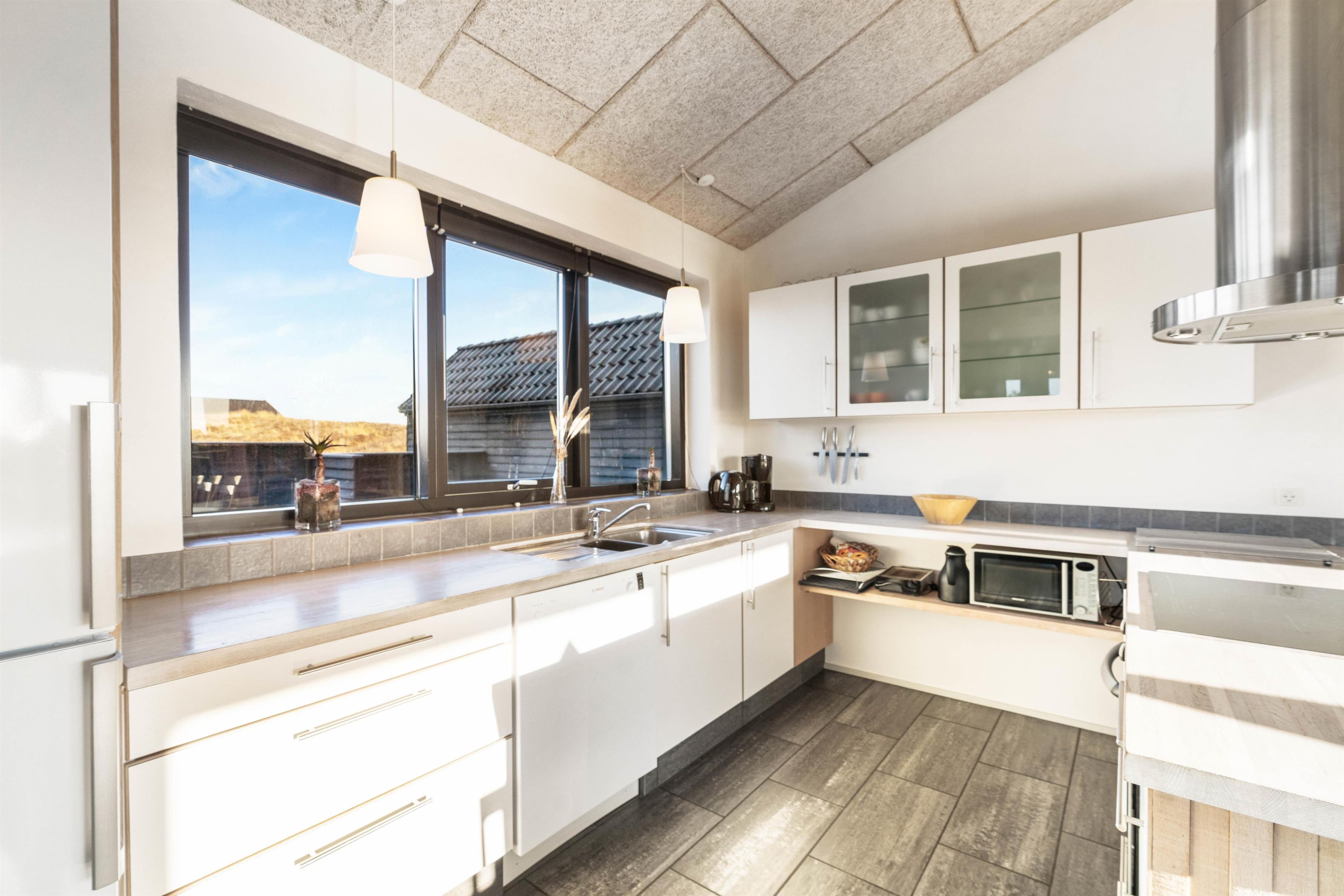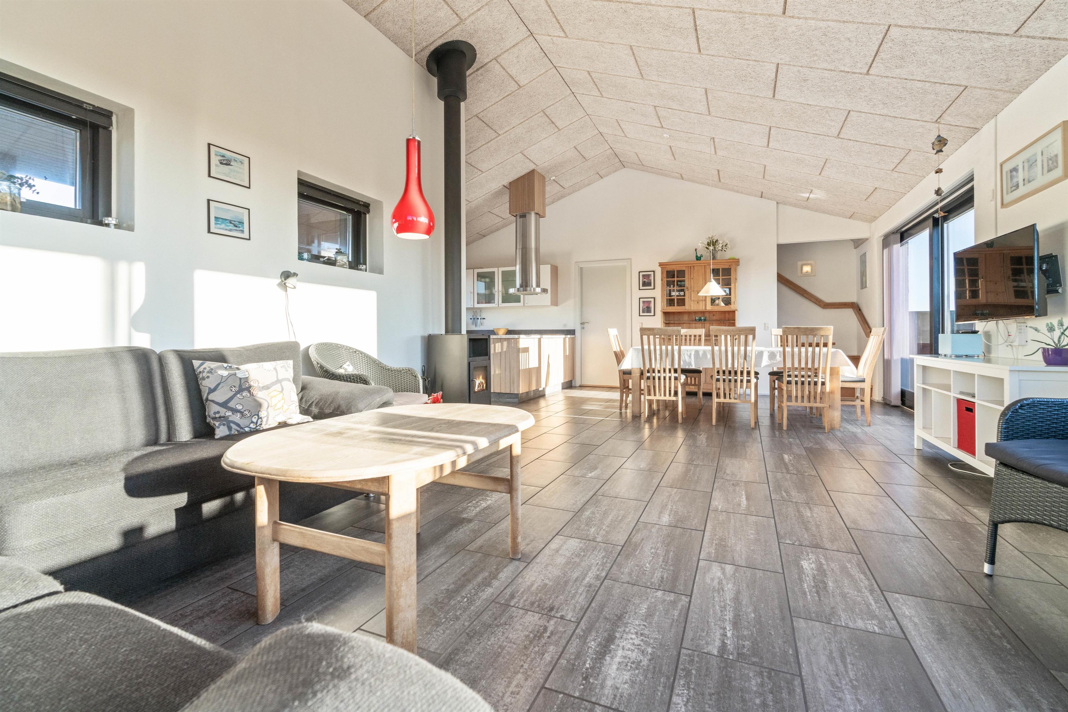 Køkken og stue er sammenhængende og råder over alt, hvad man kan ønske sig på en ferie ved Vesterhavet. Køkkenet har en opvaskemaskine, en fryser på 60 liter og en mikroovn. I stuen er der som i køkkenet flisegulv med gulvvarme, en flot og hyggelig brændeovn, et fladskærms-TV, en radio m/CD-afspiller og gratis trådløst internet. Fra stuen er der udgang til den lukkede terrasse mod syd, og fra køkkenet er der udgang til en nordvestvendt terrasse. Der står desuden en vaskemaskine og en tørretumbler til rådighed i huset.