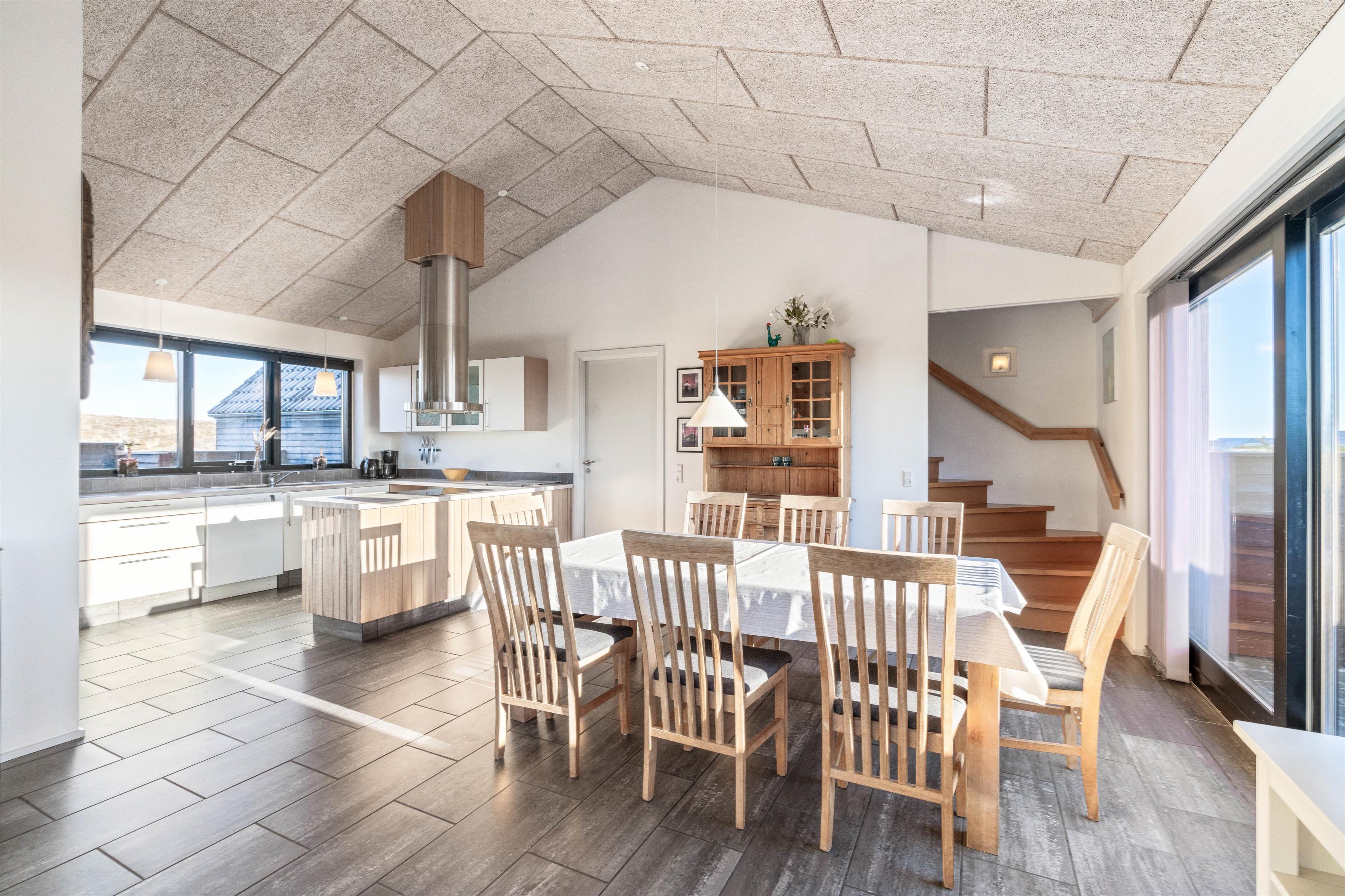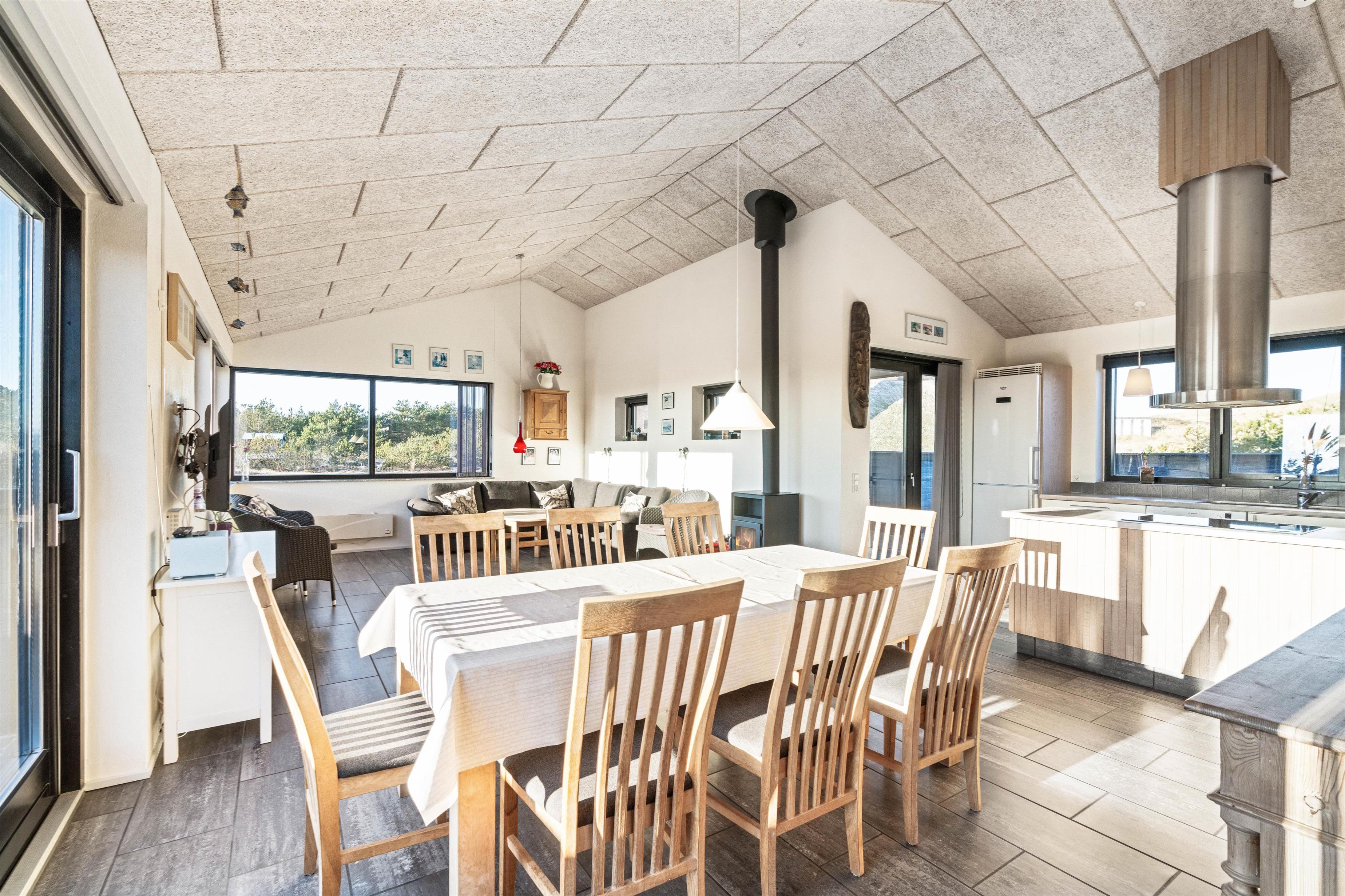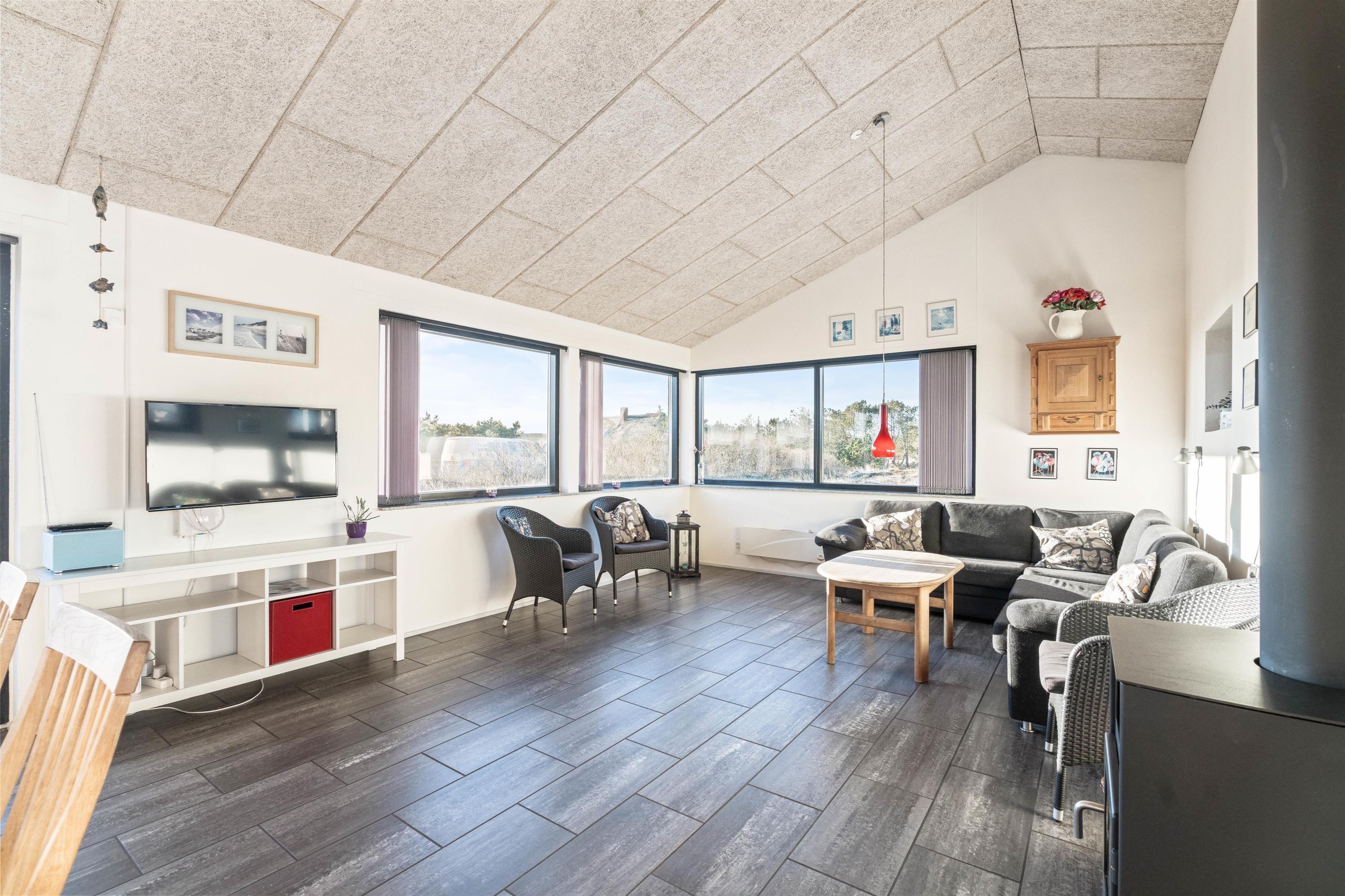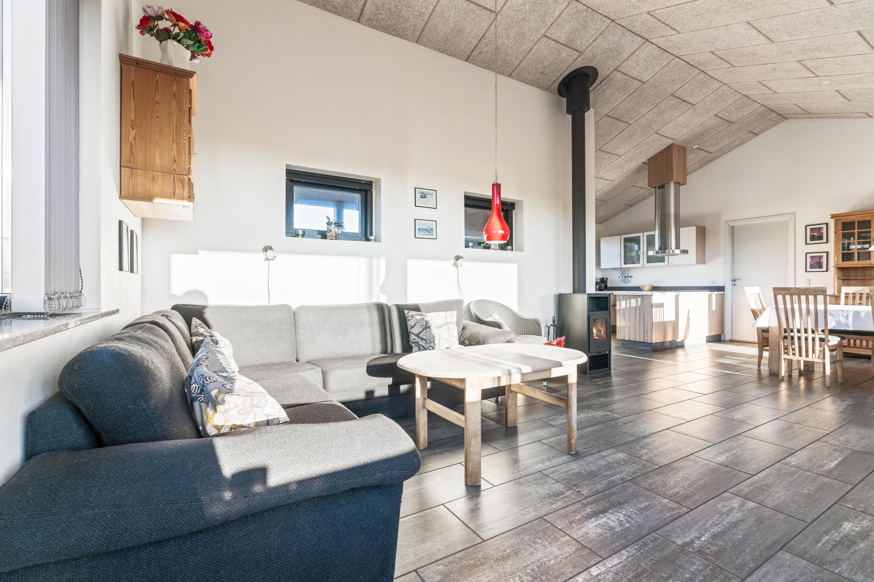 Køkken og stue er sammenhængende og råder over alt, hvad man kan ønske sig på en ferie ved Vesterhavet. Køkkenet har en opvaskemaskine, en fryser på 60 liter og en mikroovn. I stuen er der som i køkkenet flisegulv med gulvvarme, en flot og hyggelig brændeovn, et fladskærms-TV, en radio m/CD-afspiller og gratis trådløst internet. Fra stuen er der udgang til den lukkede terrasse mod syd, og fra køkkenet er der udgang til en nordvestvendt terrasse. Der står desuden en vaskemaskine og en tørretumbler til rådighed i huset.
