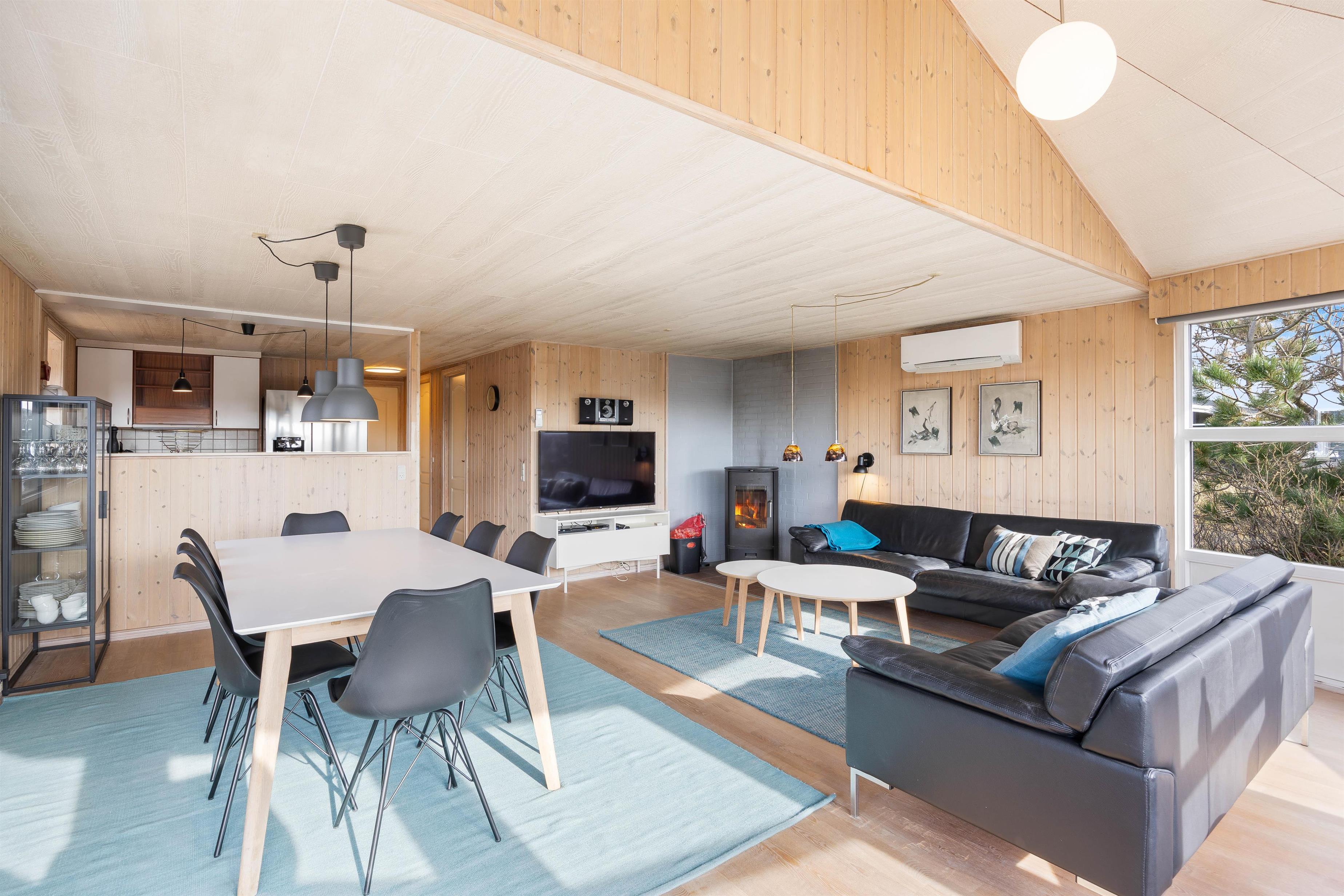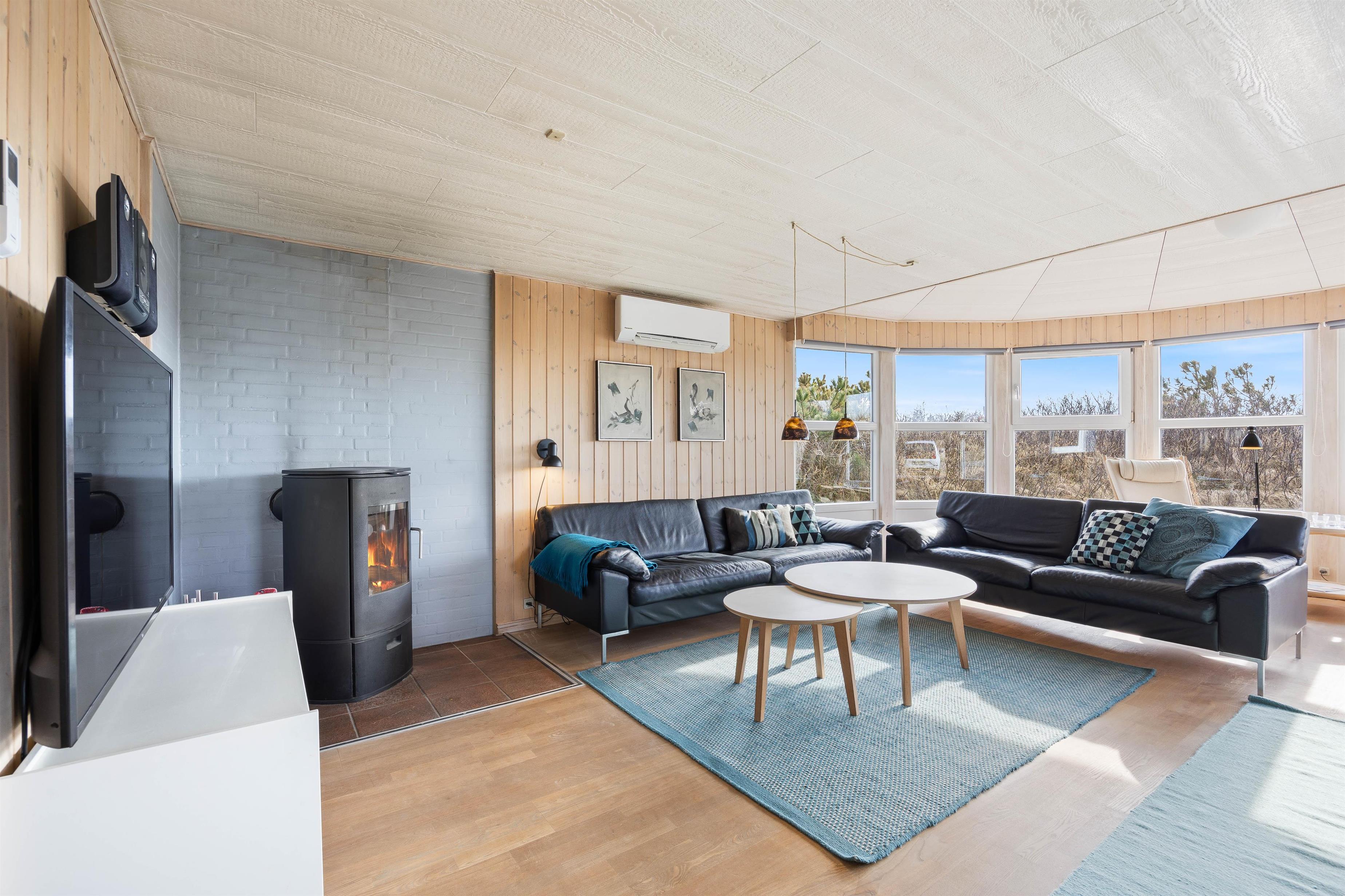 Aftenkaffen kan nydes foran den knitrende brændeovn, som skaber en varm og indbydende atmosfære i stuen - perfekt til de køligere aftener.