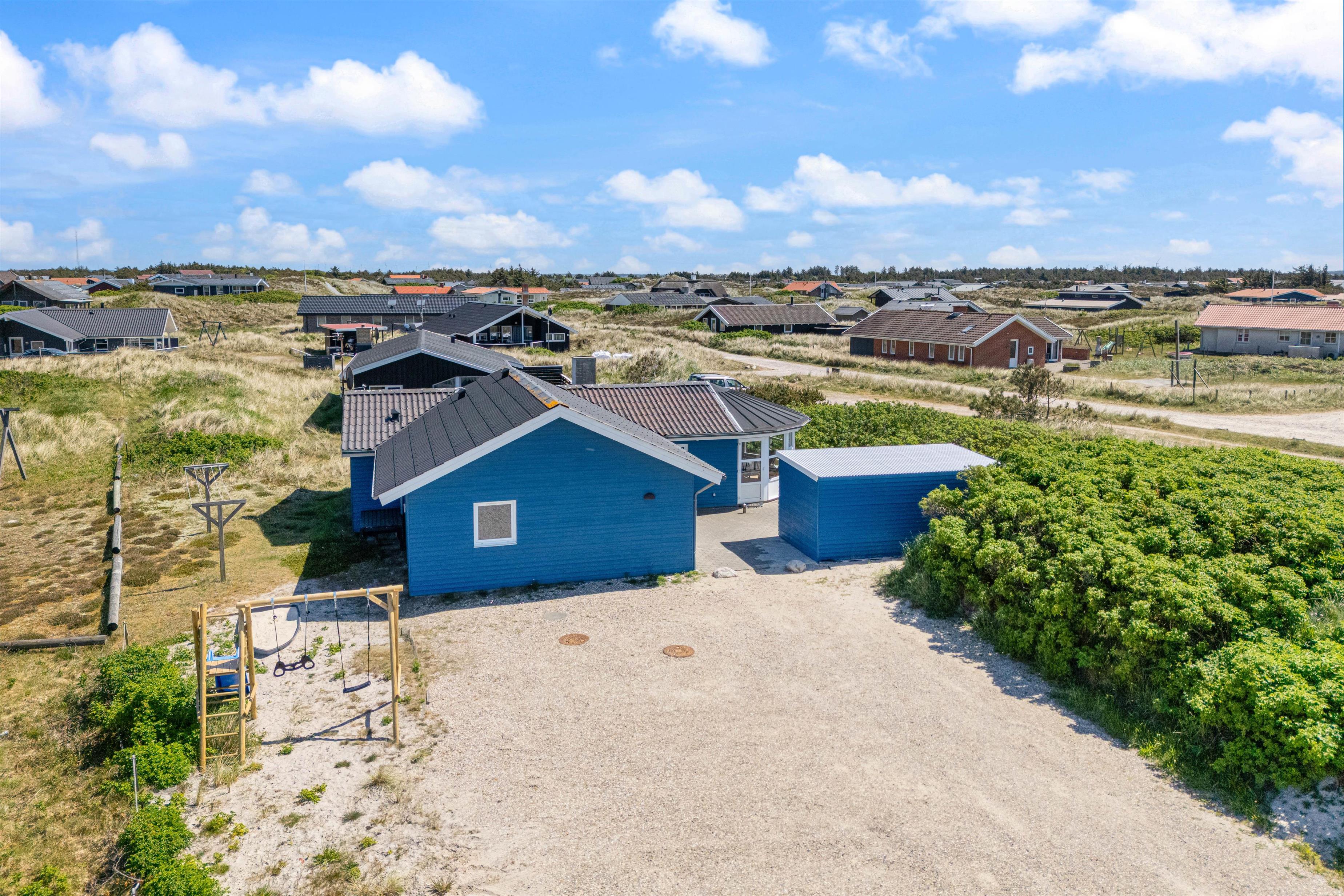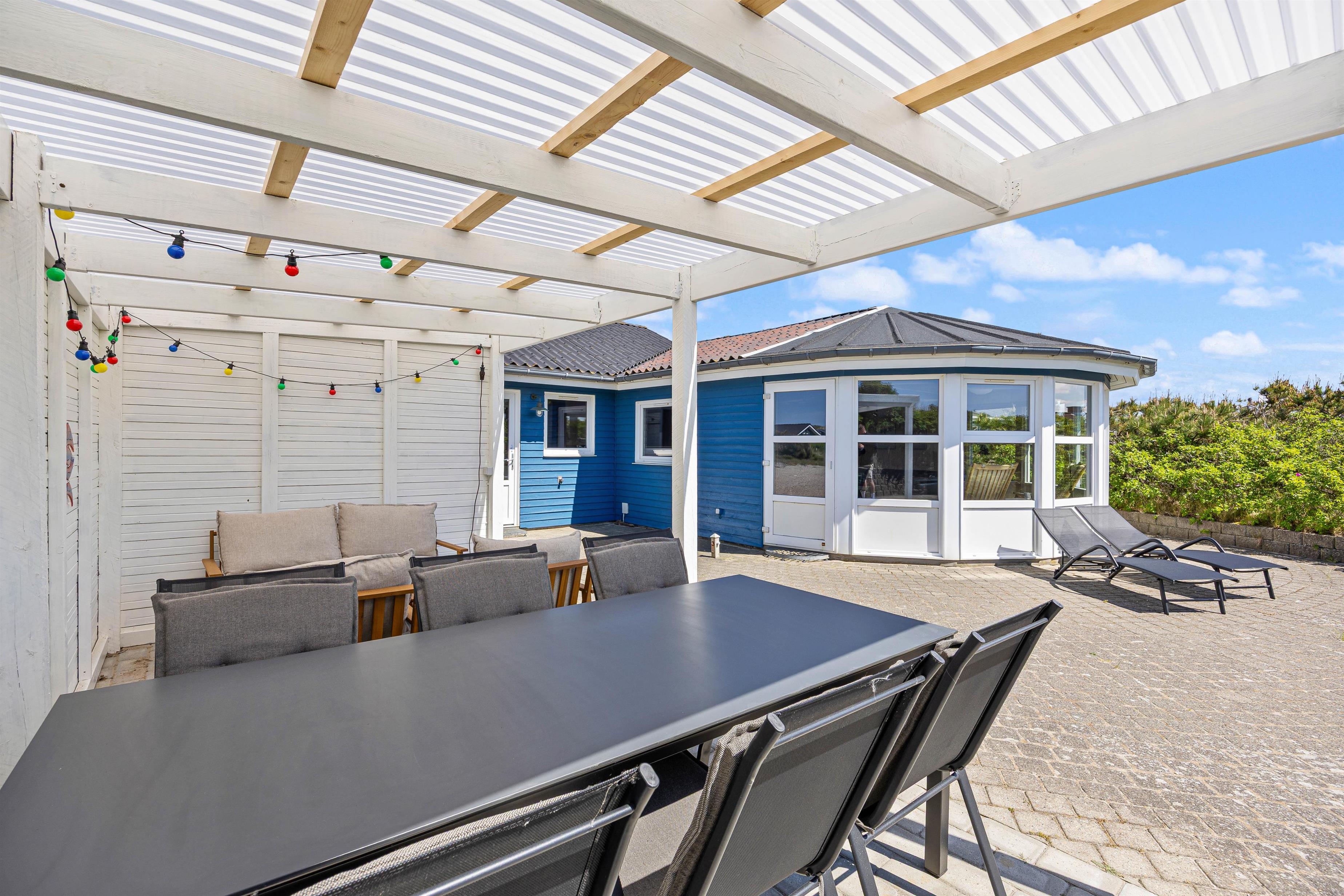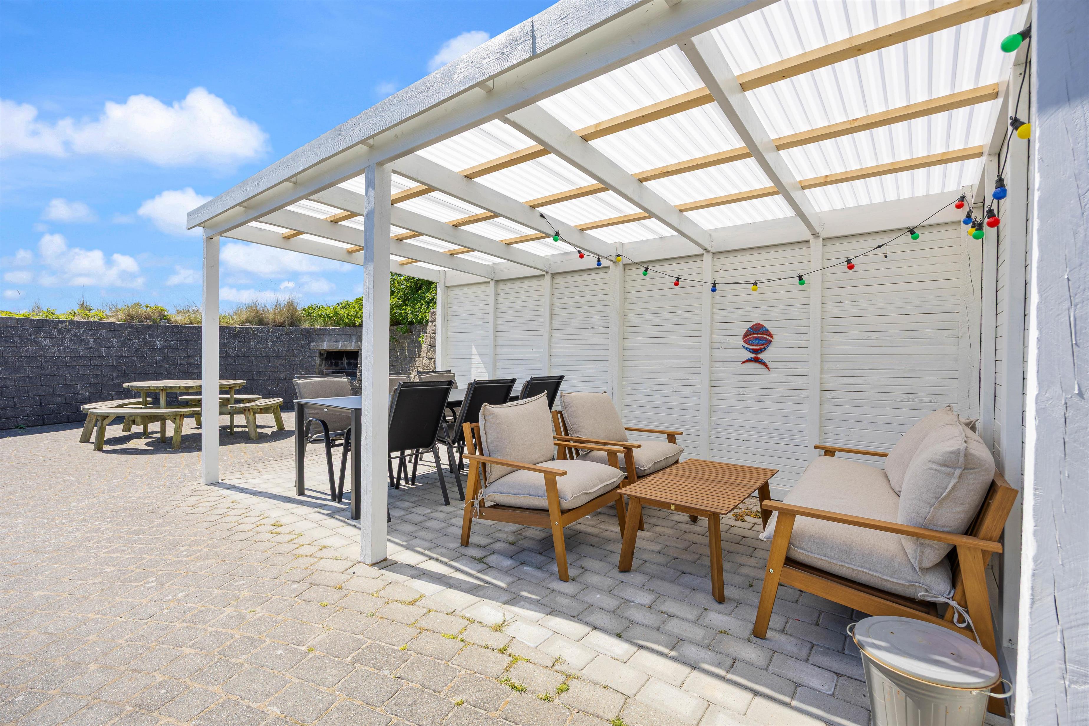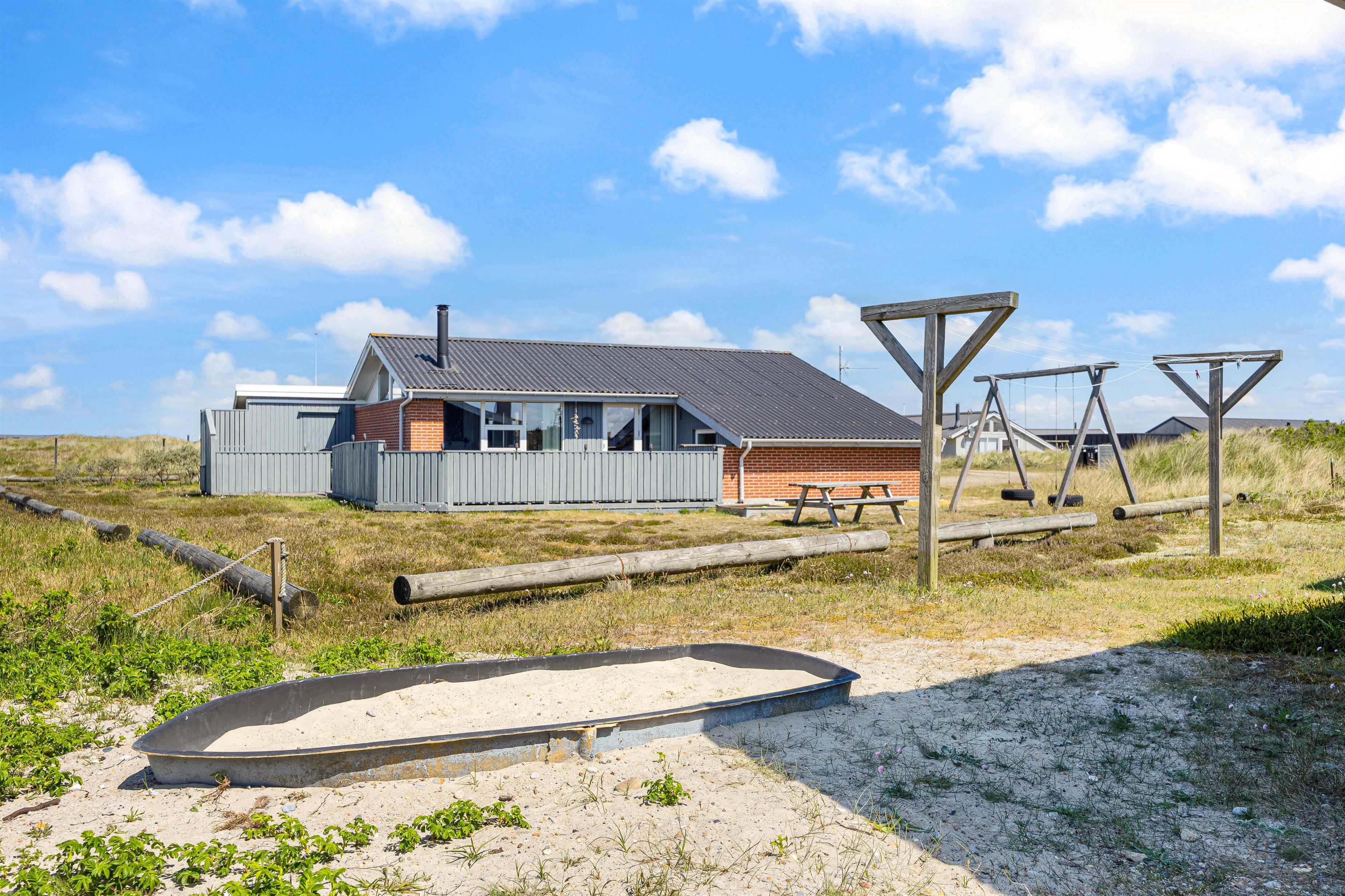 Sommerhuset er indrettet med tanke på både voksne og børn. På den store naturgrund finder du en stor, afskærmet og overdækket terrasse med indmuret grill. Her kan du virkelig nyde solen og den friske havluft, mens der både er sandkasse og et gyngestativ til børnene.