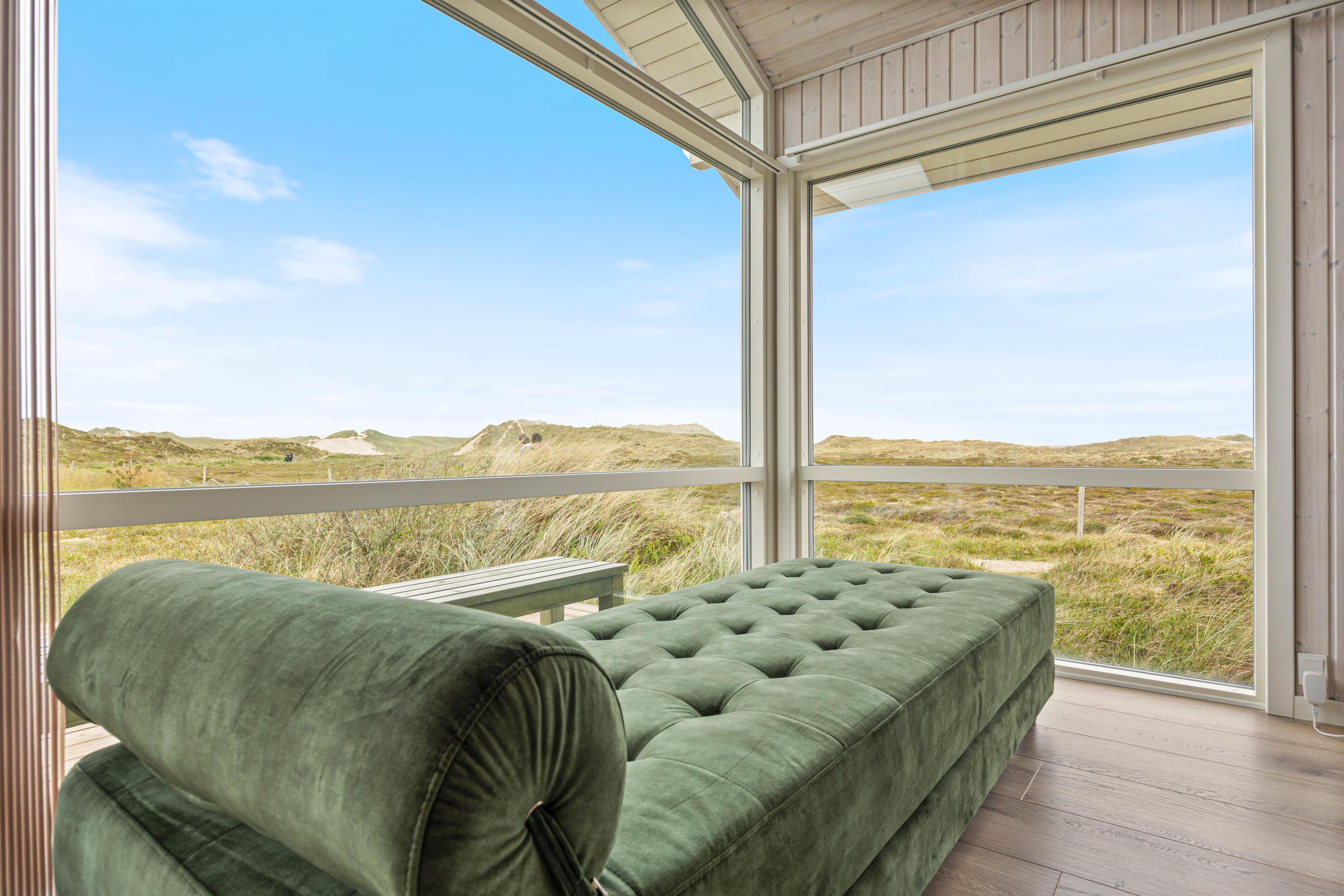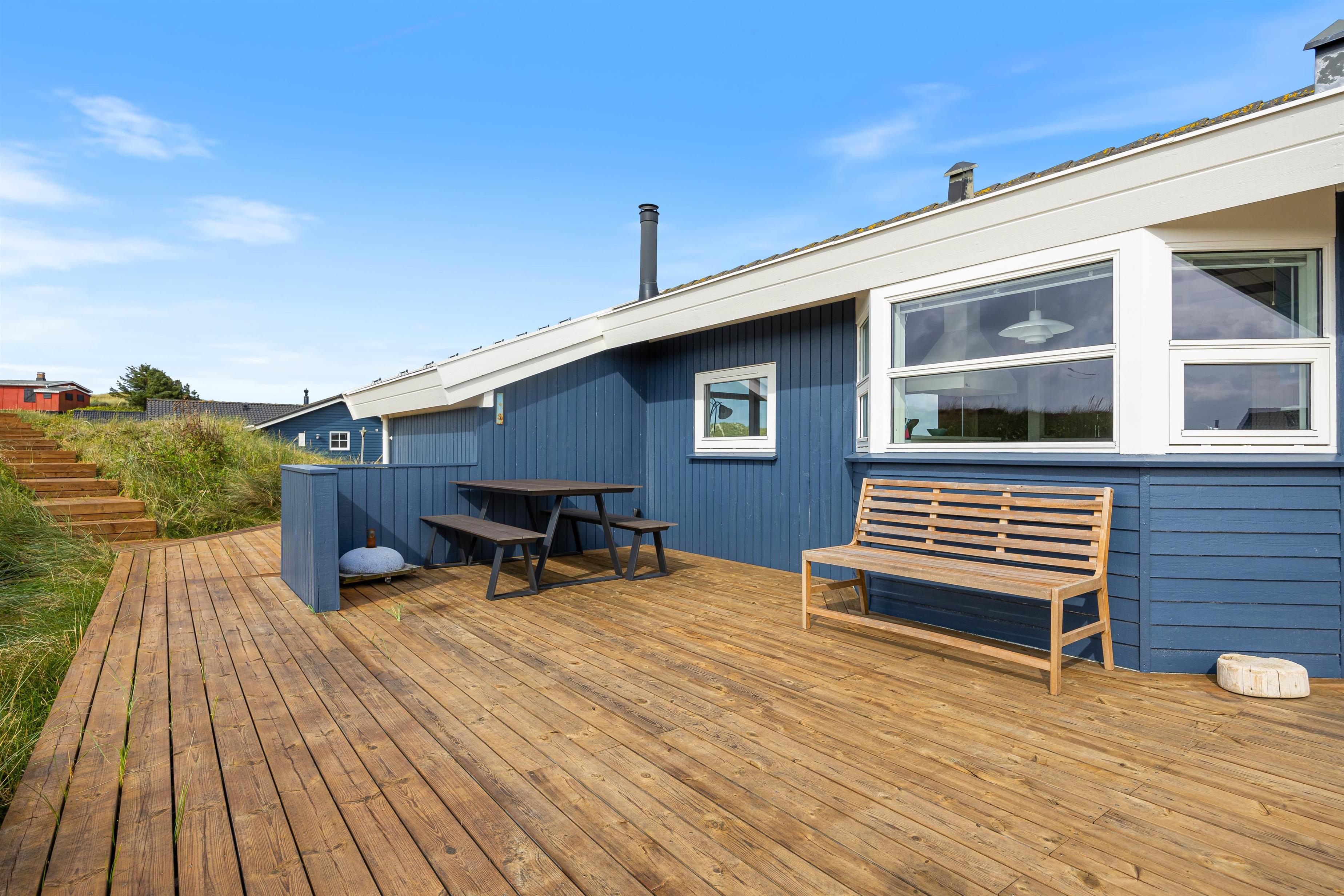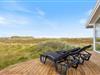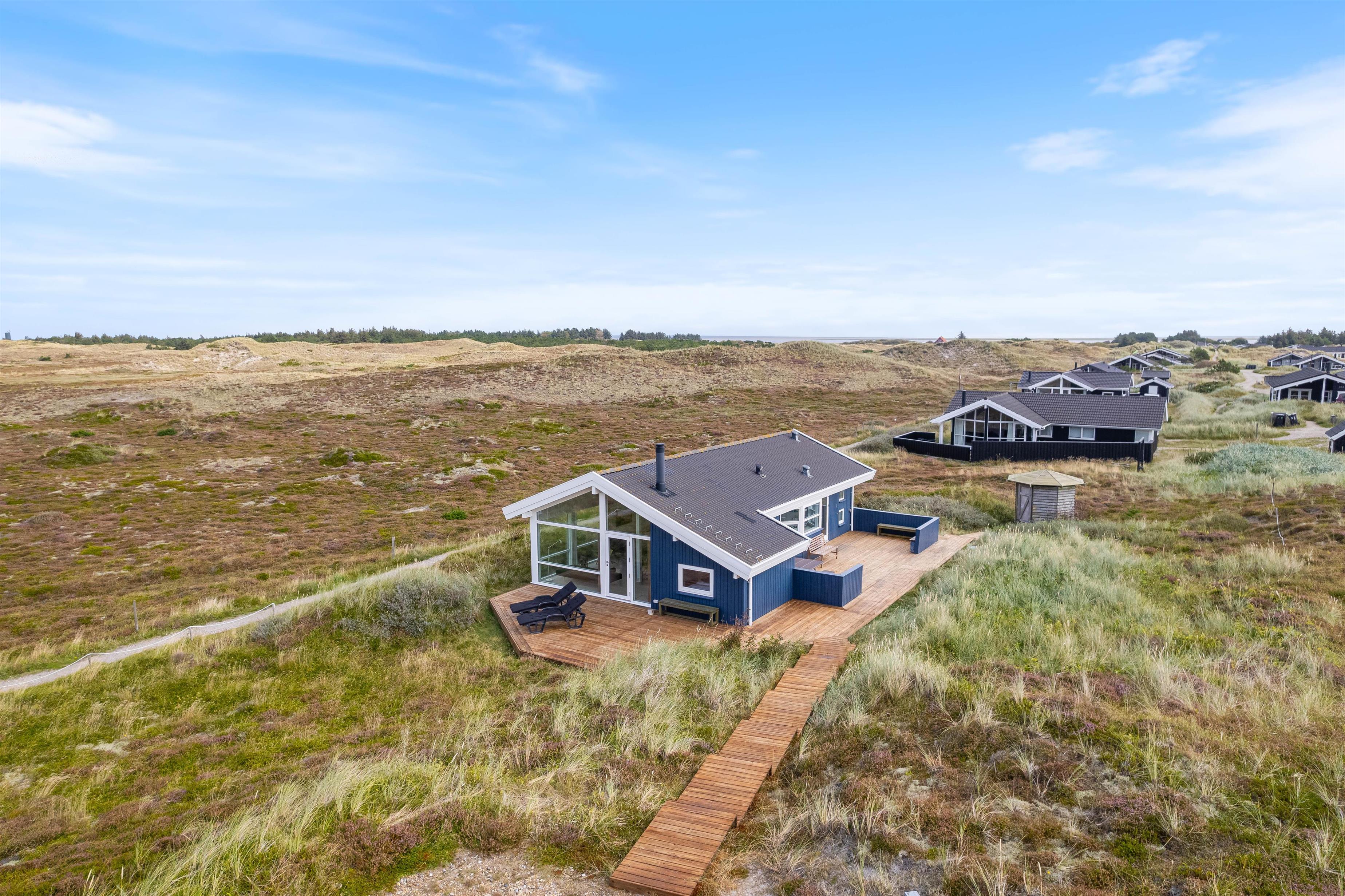 En delvist afskærmet terrasse går langs tre sider af feriehuset, hvor du finder komfortable havemøbler. Det er lige så indbydende til morgenmad om morgenen som til et godt aftenmåltid, tilberedt fra jeres egen gasgrill. Omgivet af den 1200 kvadratmeter store klitgrund/naturgrund kan du nyde panoramaudsigten over klitter og hede og lade roen falde over dig. Gå ikke glip af en vandretur til stranden for at opleve solnedgangen i Vesterhavet – det er altid en oplevelse.
