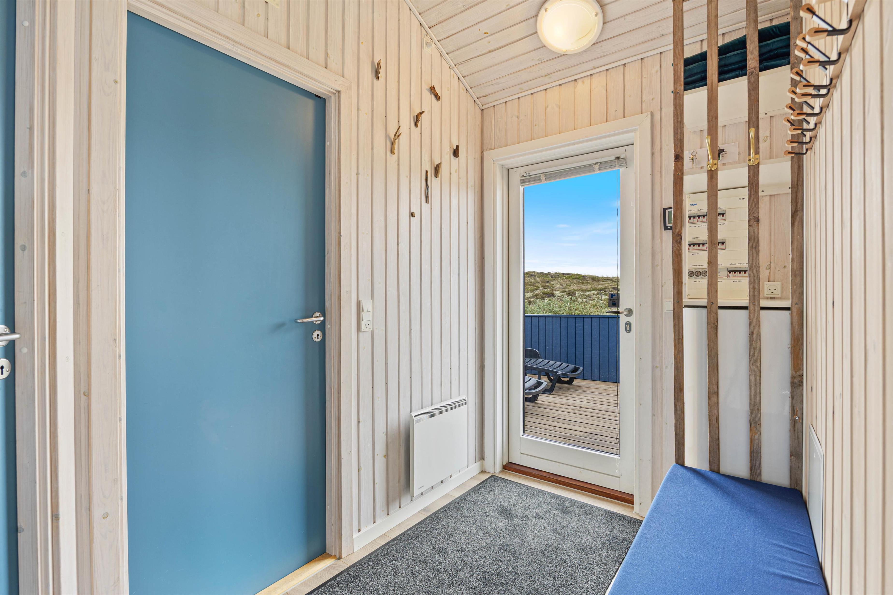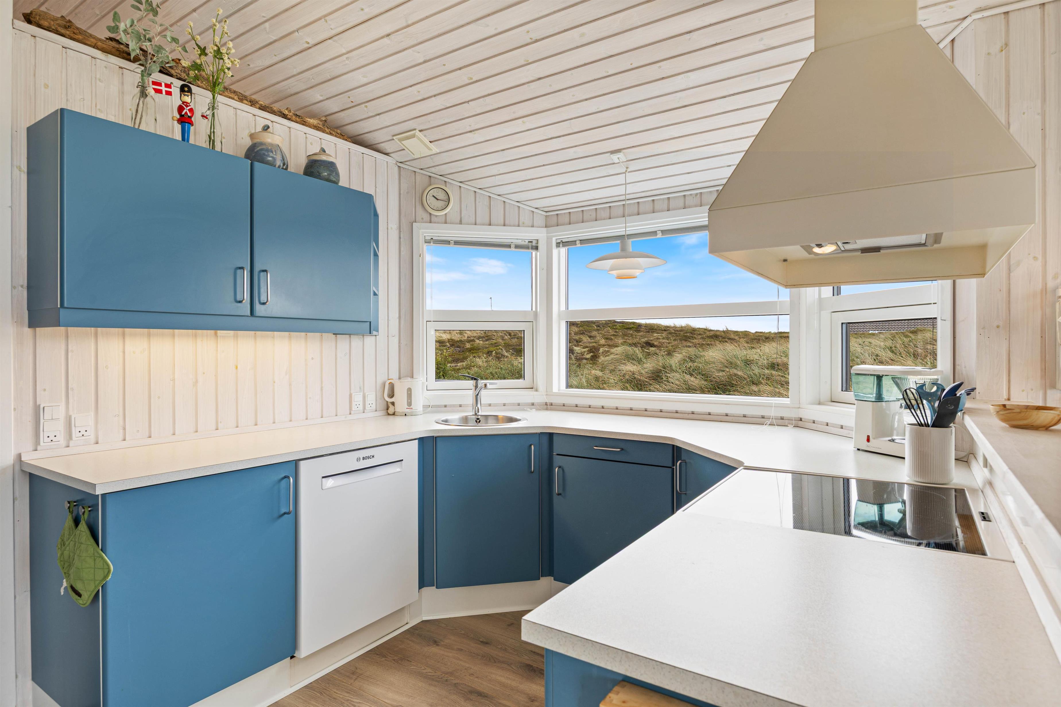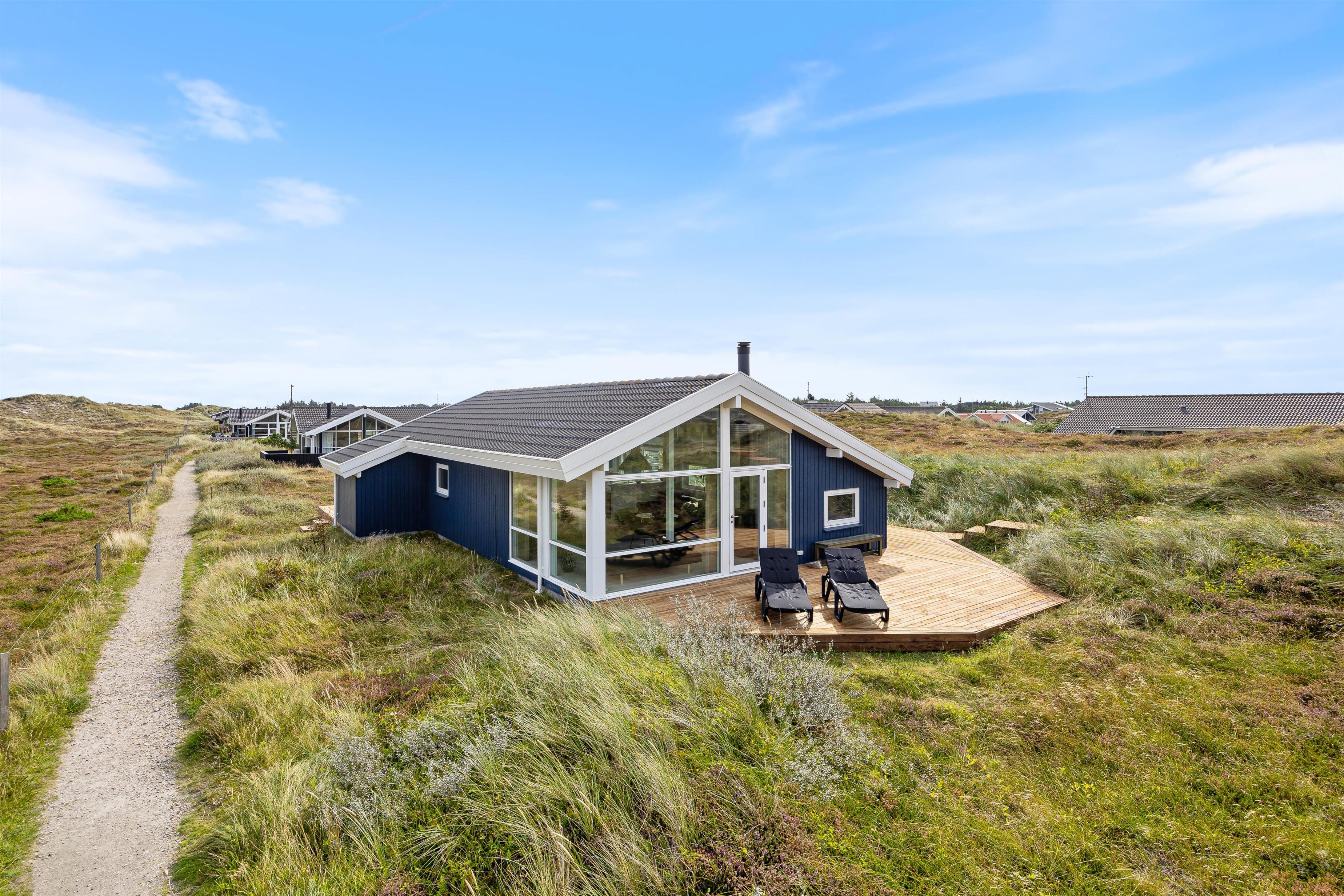 En delvist afskærmet terrasse går langs tre sider af feriehuset, hvor du finder komfortable havemøbler. Det er lige så indbydende til morgenmad om morgenen som til et godt aftenmåltid, tilberedt fra jeres egen gasgrill. Omgivet af den 1200 kvadratmeter store klitgrund/naturgrund kan du nyde panoramaudsigten over klitter og hede og lade roen falde over dig. Gå ikke glip af en vandretur til stranden for at opleve solnedgangen i Vesterhavet – det er altid en oplevelse.