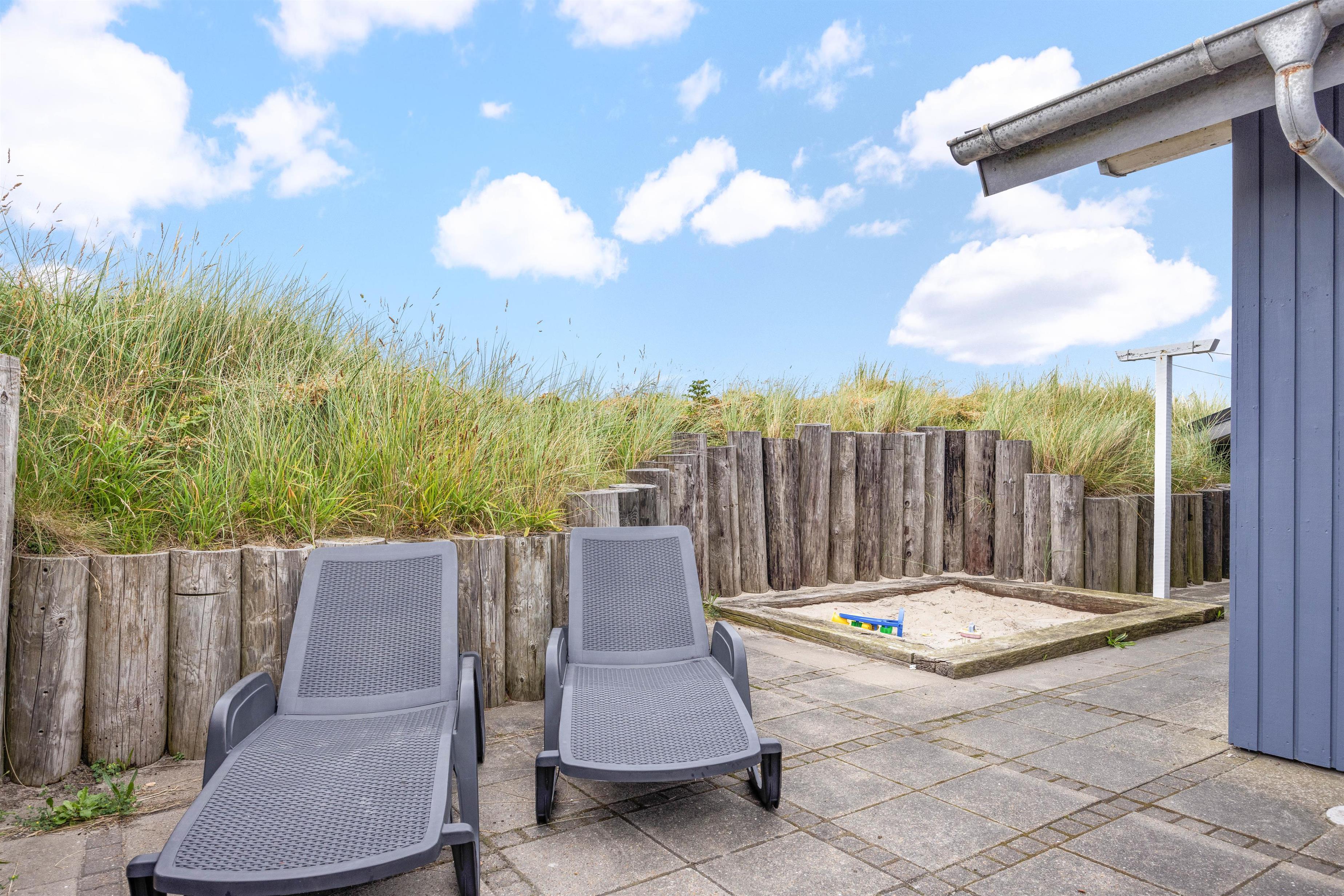 Sommerhuset er omringet af terrasssen, der smukt er afskærmet af naturen, således I uforstyrret kan benytte terrassen. Fra terrassen kan naturen og den friske luft nydes til solnedgangen. I dagtimerne kan solen og naturen nydes i en af liggestolene, mens børnene leger i sandkassen. Grillen kan om aftenen gøres klar til en lækker grillaften med familien.