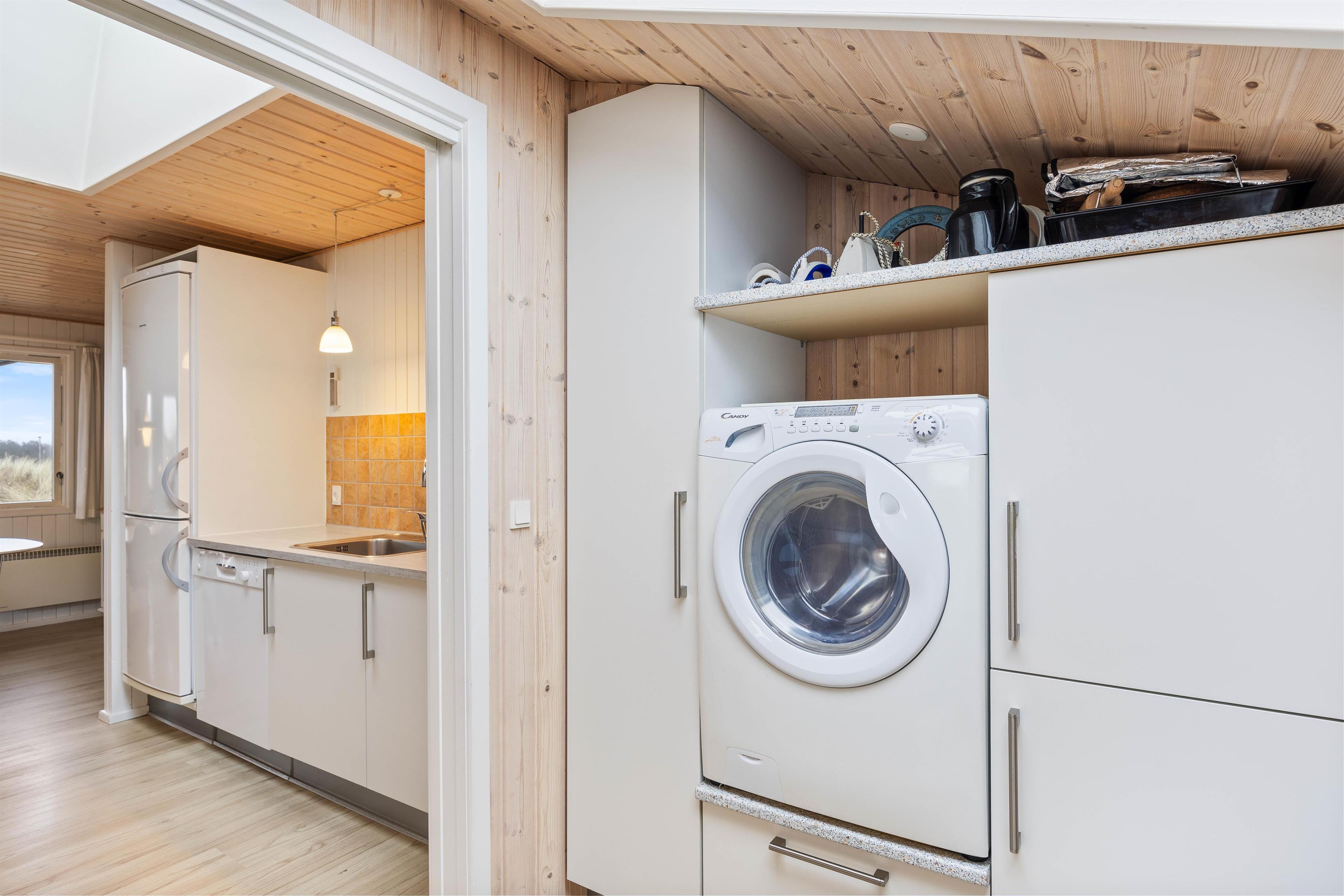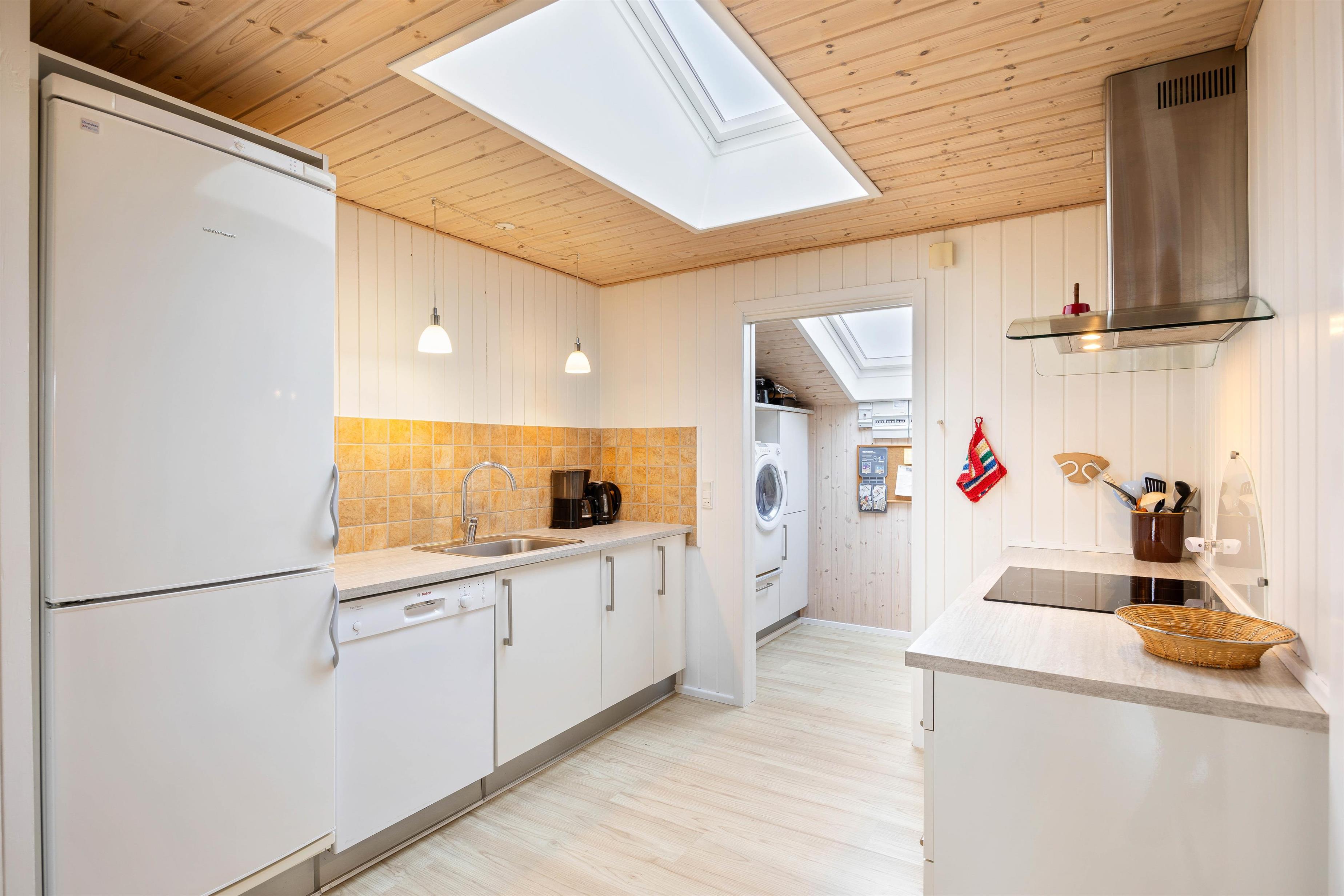 Sommerhuset er veludstyret med et køkken, der byder på alt, hvad du behøver for at kokkerere et lækkert måltid til hele familien – måske er der hentet friske frisk fra Hvide Sande?