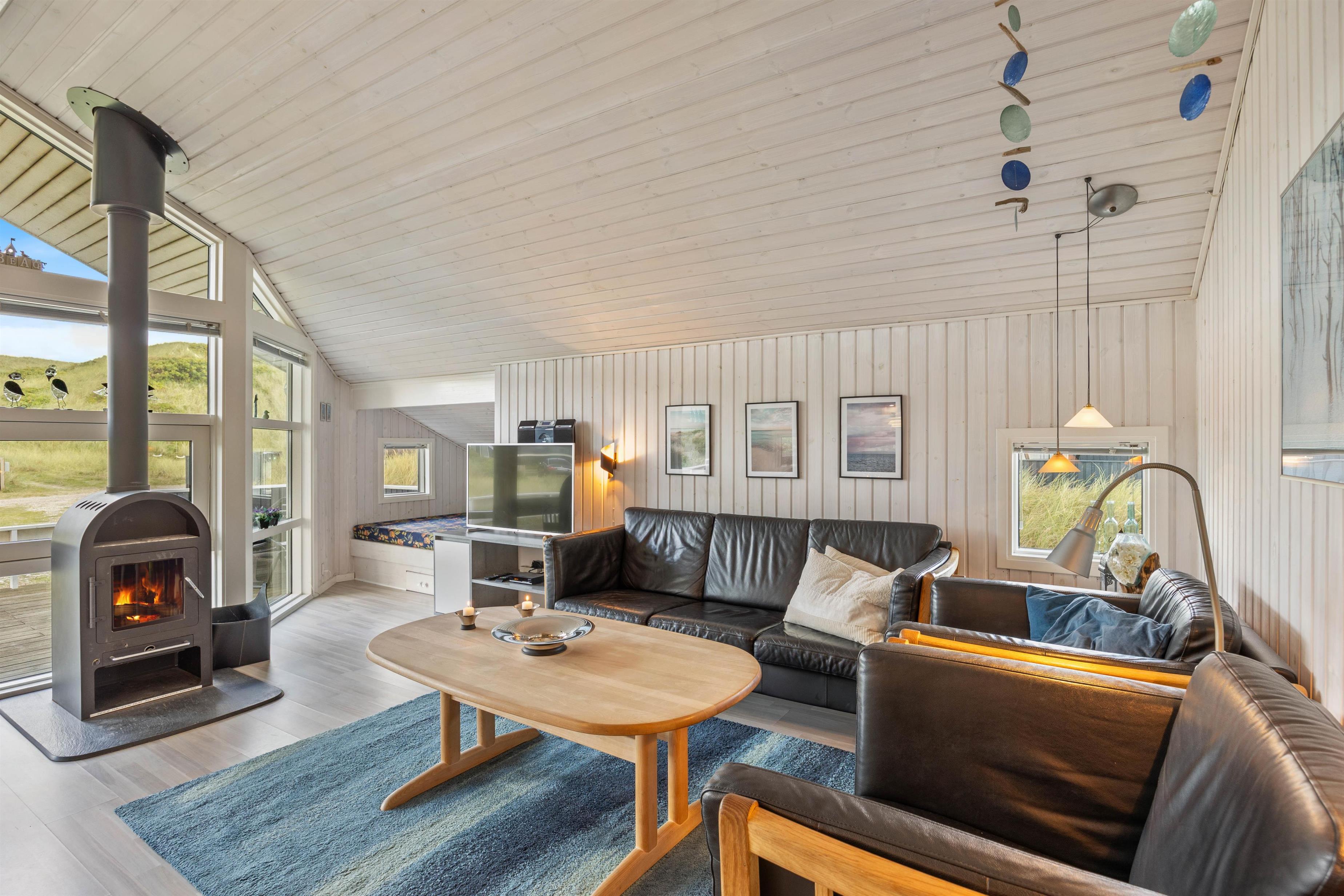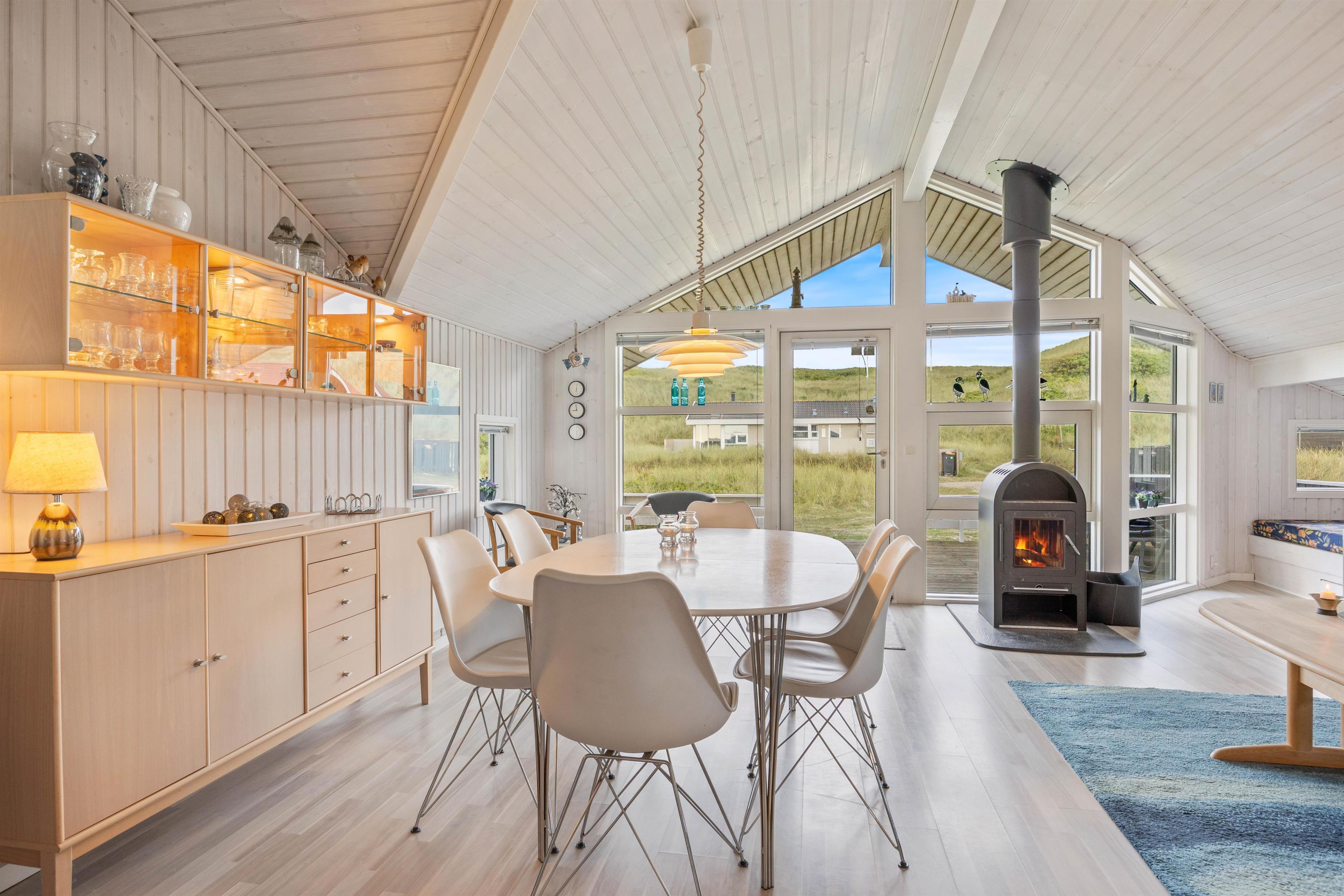 Fra entréen med opbevaringsplads kommer I ind i køkkenalrummet, som er lyst, personligt og hyggeligt indrettet. En hyggelig alkove inviterer til afslappede og sociale stunder. Køkkenet er veludstyret og har blandt andet opvaskemaskine, mikrobølgeovn og en fryser på 170 liter – perfekt til nem tilberedning af måltider. I hjertet af huset finder I en hyggelig brændeovn, som skaber varme og en indbydende stemning på kølige aftener. Desuden sørger en effektiv, energibesparende luft-til-luft-varmepumpe altid for et behageligt indeklima.