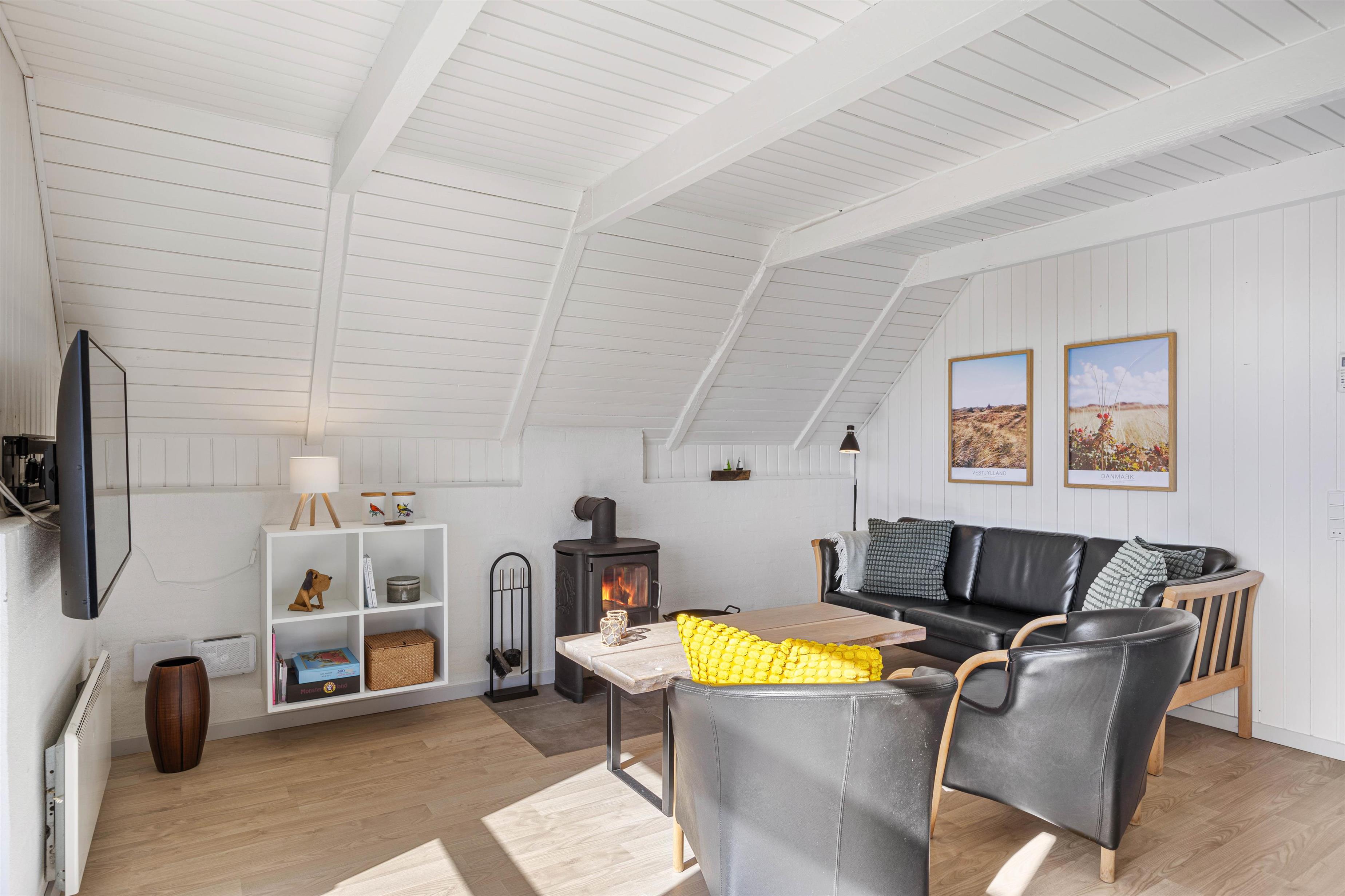 Den omkostnings- og energibesparende varmepumpe sørger for behagelige temperaturer i sommerhuset. Med ild i brændeovnen kan I samles til en hyggestund i sofagruppen, se en god film eller nyde en frisk kop kaffe.