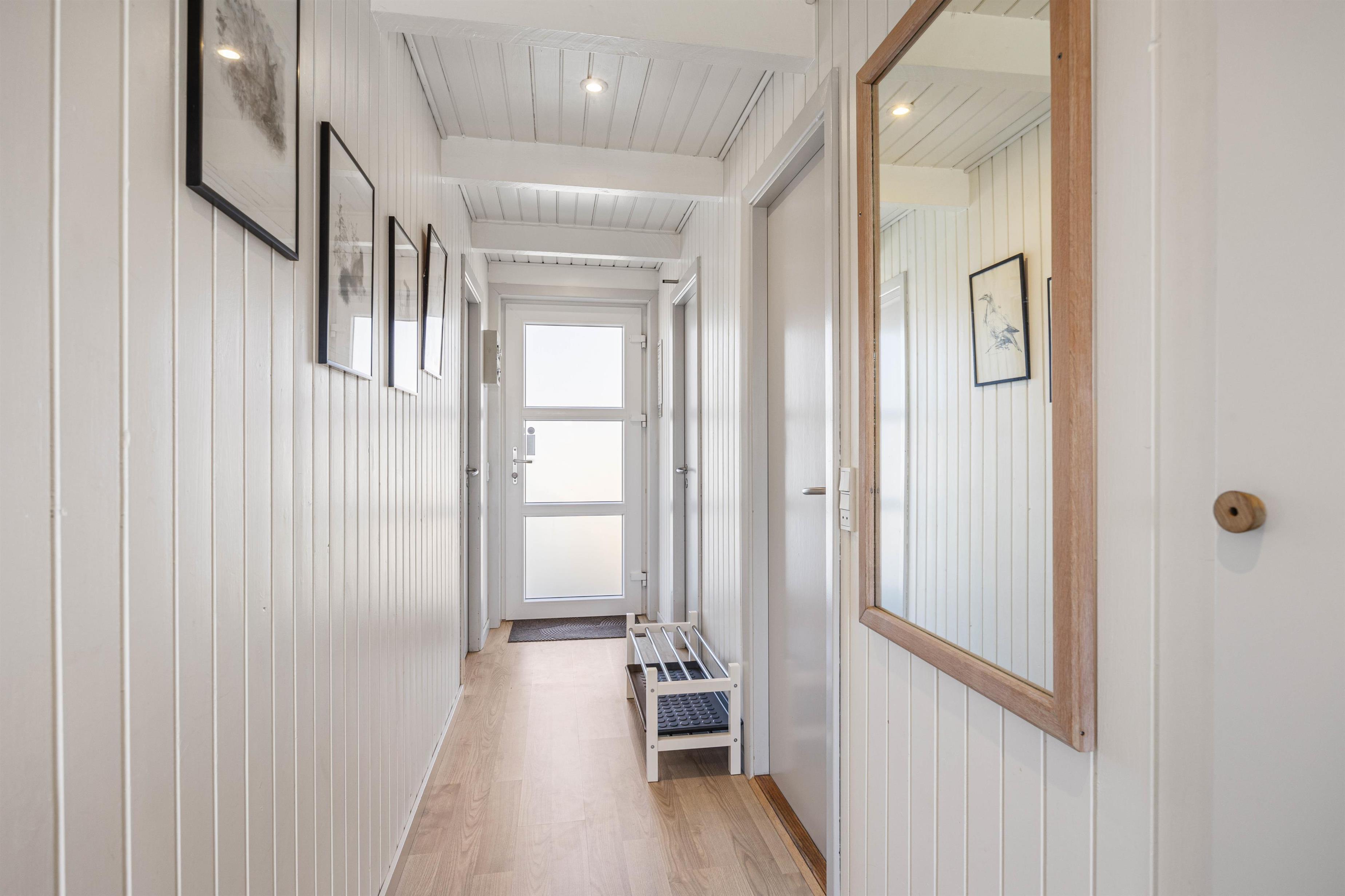 Det charmerende sommerhus på Bjerregårdsvej 113 er lyst og venligt indrettet med sans for detaljen. Køkken og stue er i åbent plan med et fint lysindfald igennem skråvinduerne og glasfacaden til den lukkede terrasse. De hvidmalede, træbeklædte vægge, lyse gulve og synlige bjælker giver sammen med den lette og moderne indretning en dejlig feriefornemmelse straks, I træder ind ad døren.