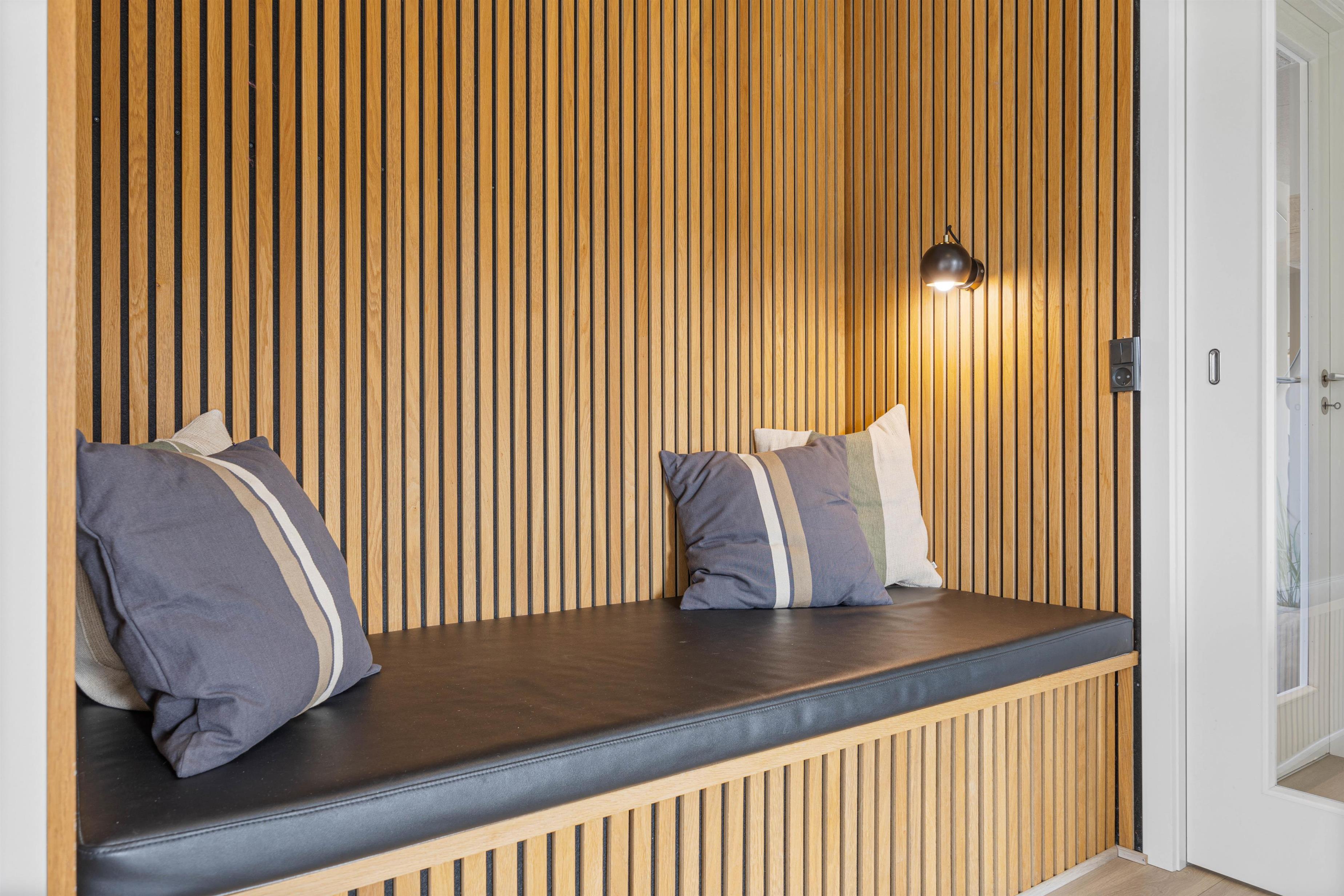 Sommerhuset er bygget i 2021 og står derfor superflot og moderne med lækre komfortable møbler. Fra det veludstyrede køkken er der adgang til det store overdækkede terrasseområde. Her kan I sidde i læ fra Vestenvinden, mens I nyder udsigten over det flotte klitlandskab i Bjerregård.