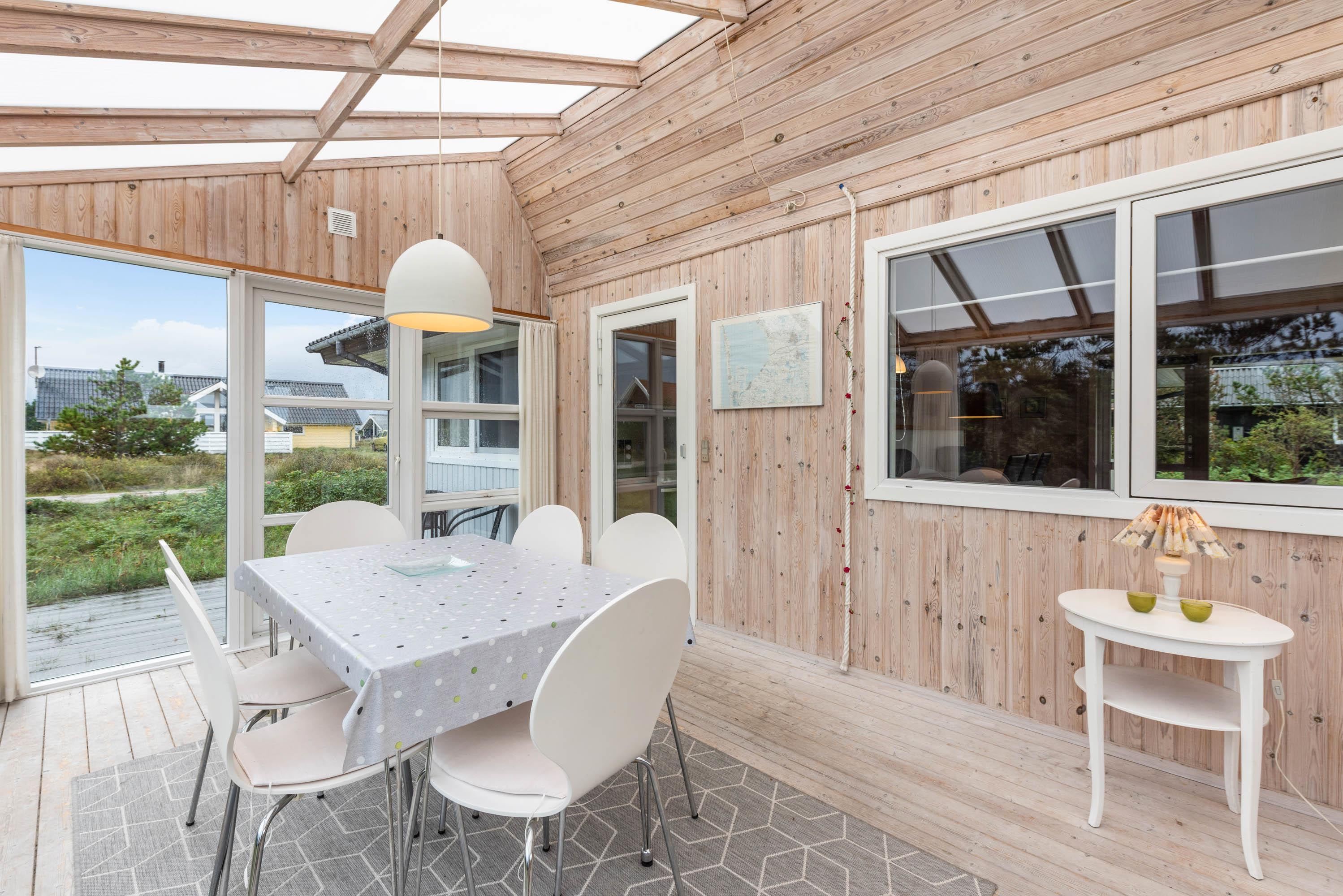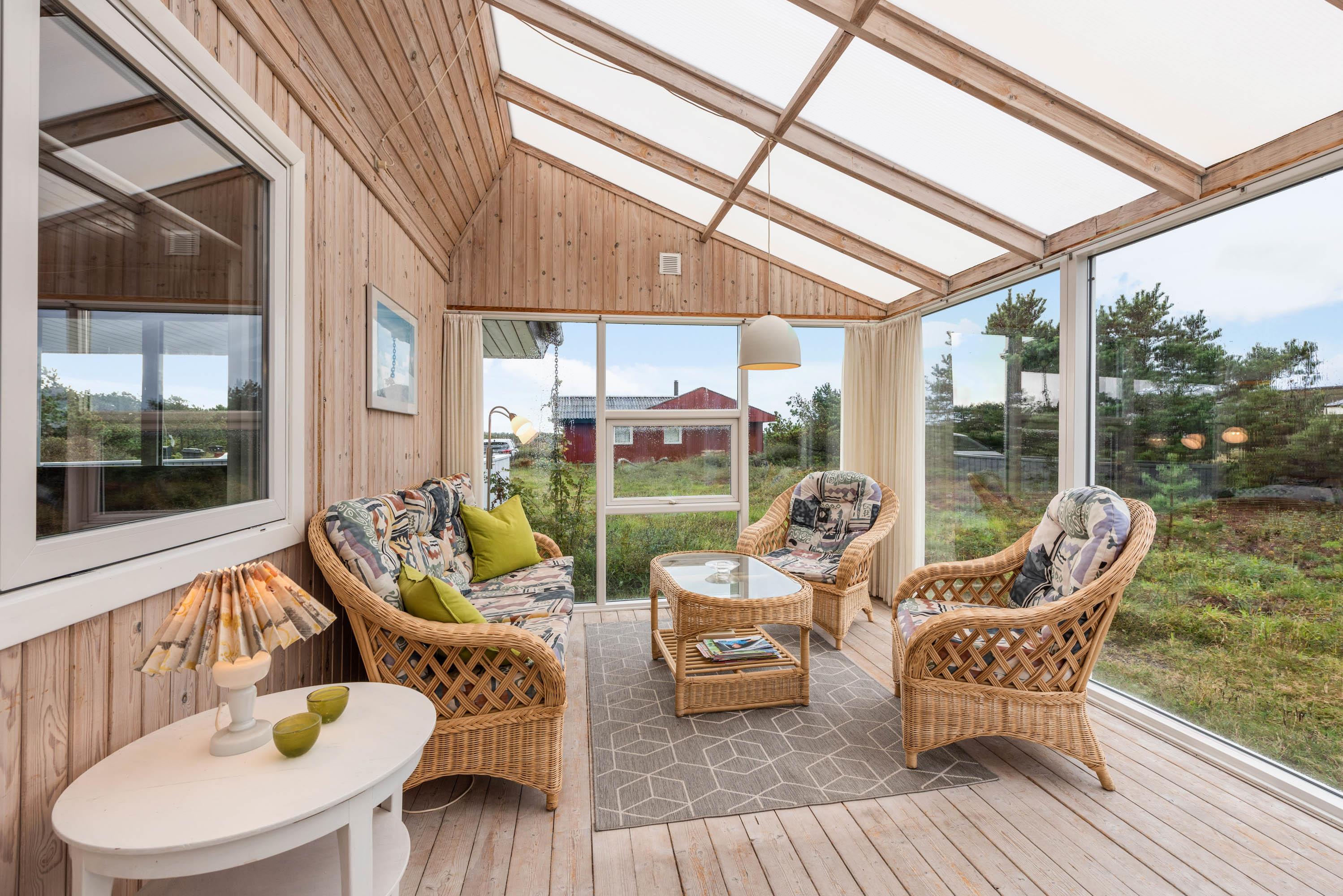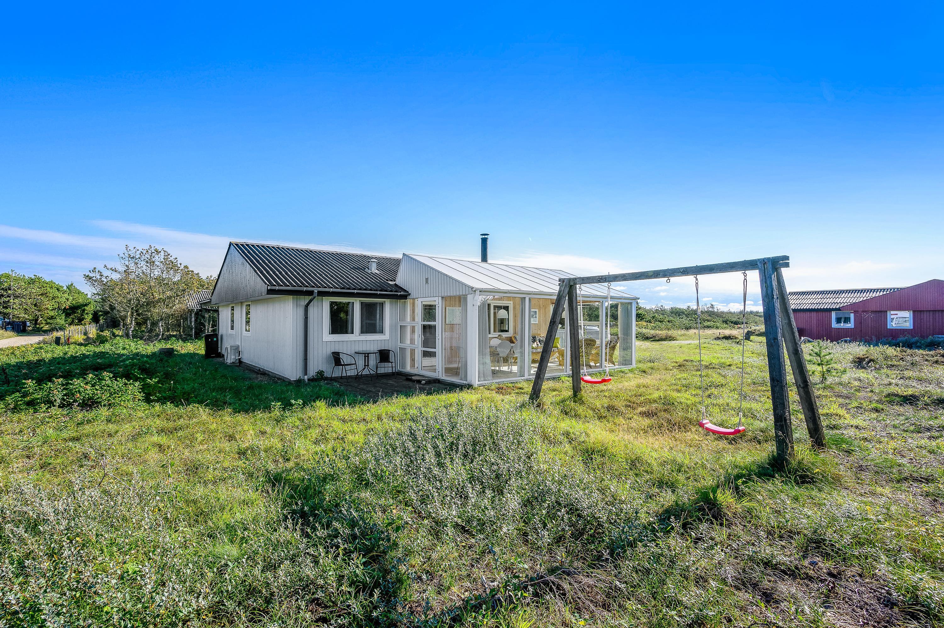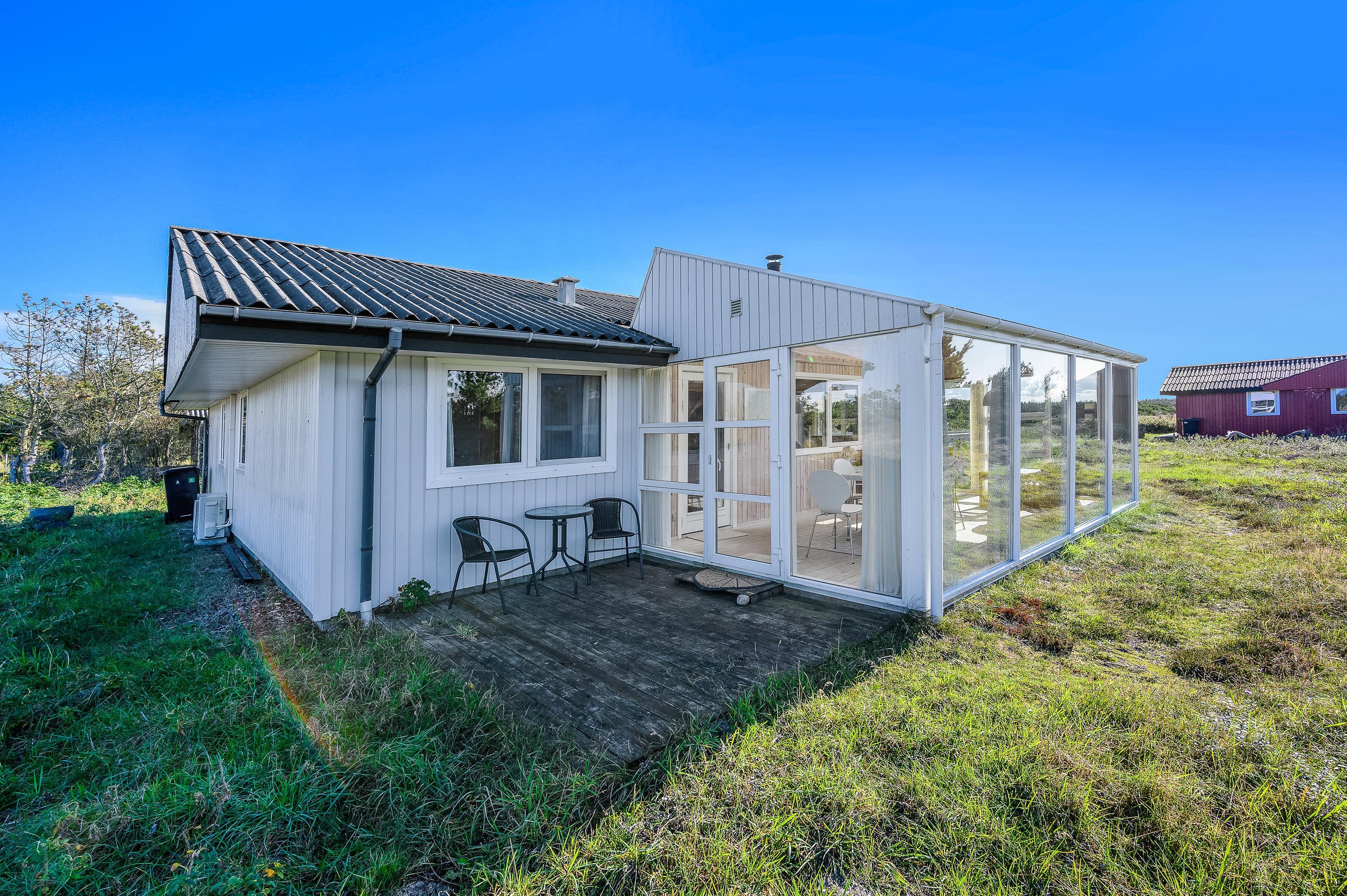 Feriehuset ligger på en stor naturgrund med udsigt mod syd over det fredede hedeområde. Terrassen er delvist overdækket og delvist lukket, så I kan nyde solnedgangen eller sidde ude uanset vejret.