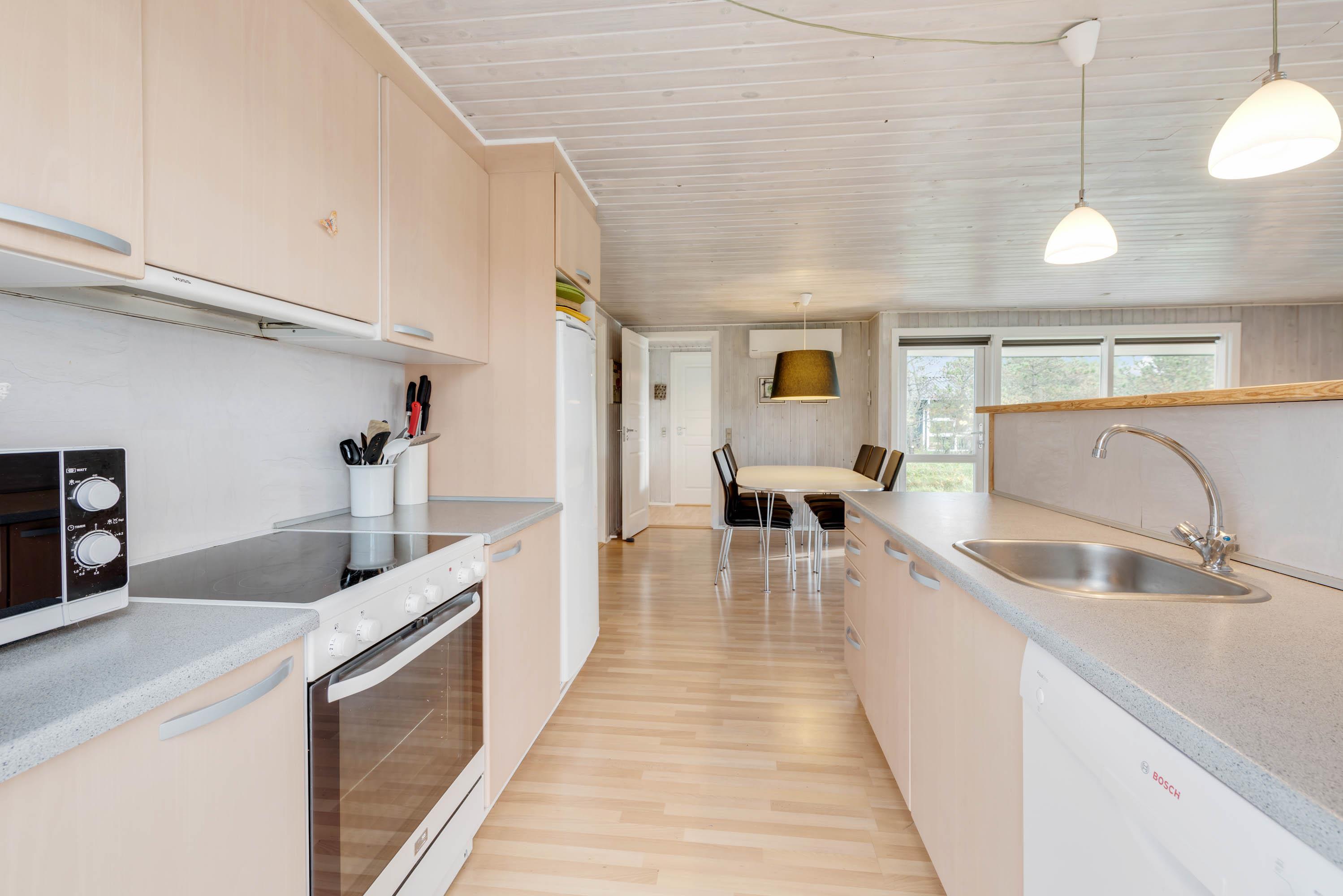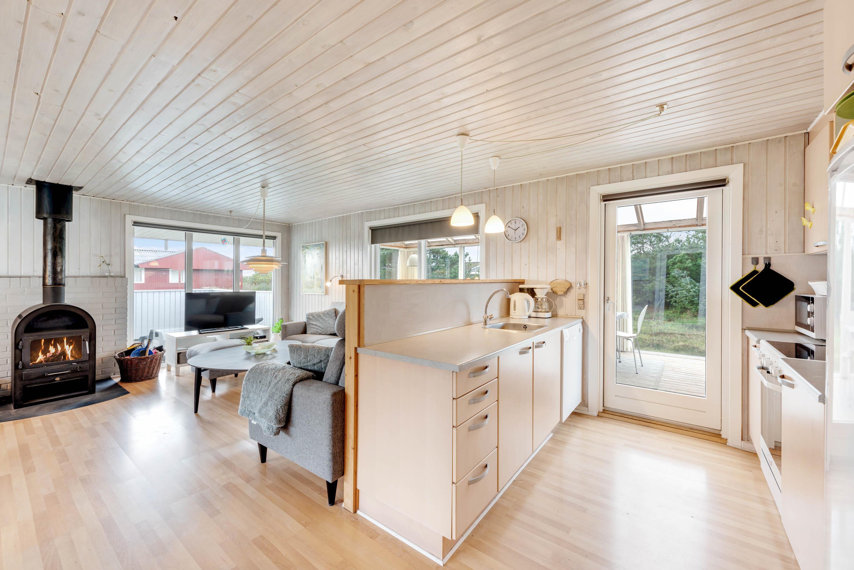 Når I træder ind i feriehuset, kommer I først til entréen med opbevaringsplads og direkte adgang til det åbne køkkenalrum. I stuen sørger brændeovnen og varmepumpen for en behagelig varme, og hjørnesofaen er perfekt til spil, hyggesnak eller en filmaften. Desuden har sommerhuset et Chromecast, så I nemt kan streame jeres yndlingsfilm og serier fra egne enheder. Køkkenet er godt udstyret med opvaskemaskine, mikrobølgeovn og køleskab med fryser – alt, hvad I skal bruge for et bekvemt ophold.