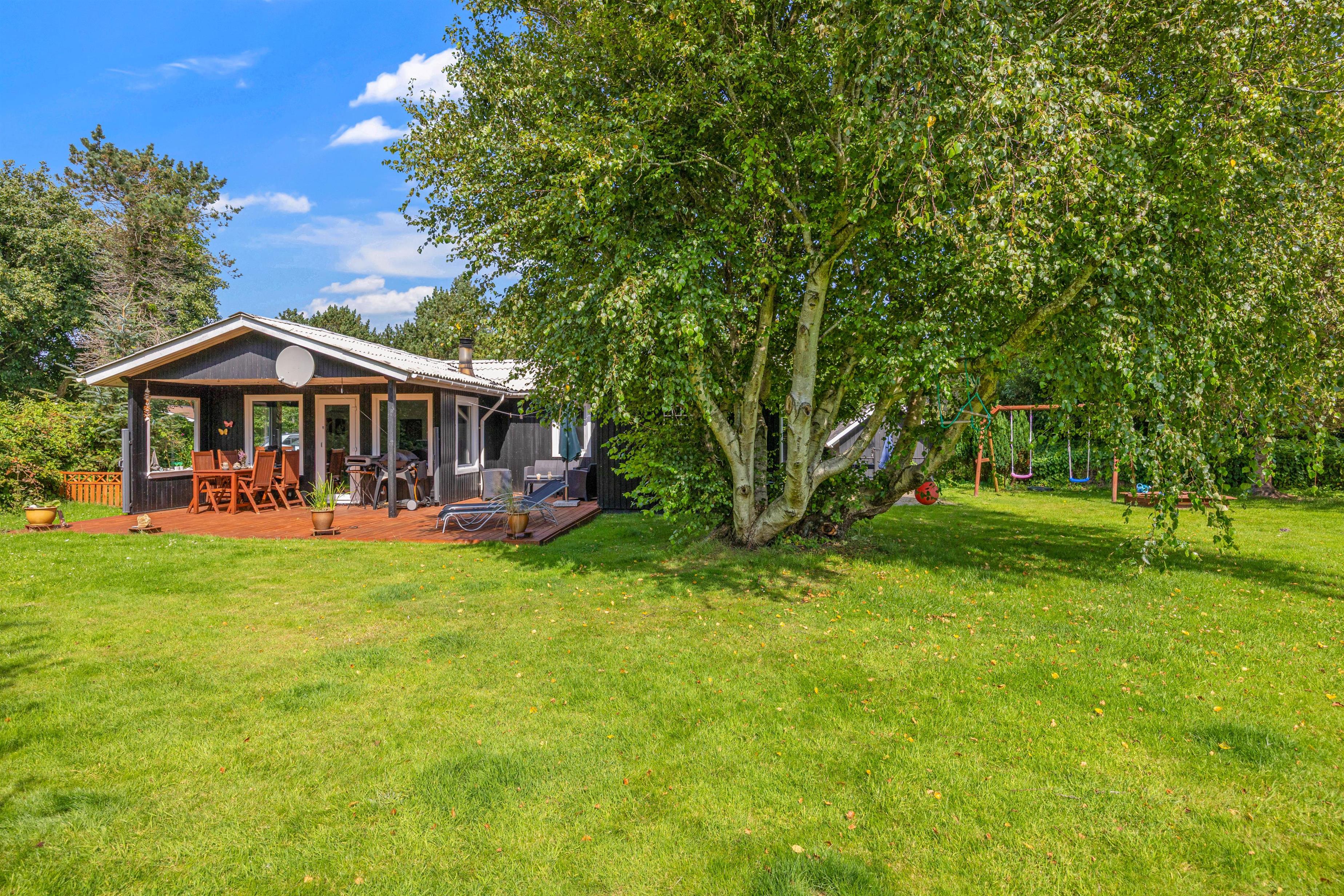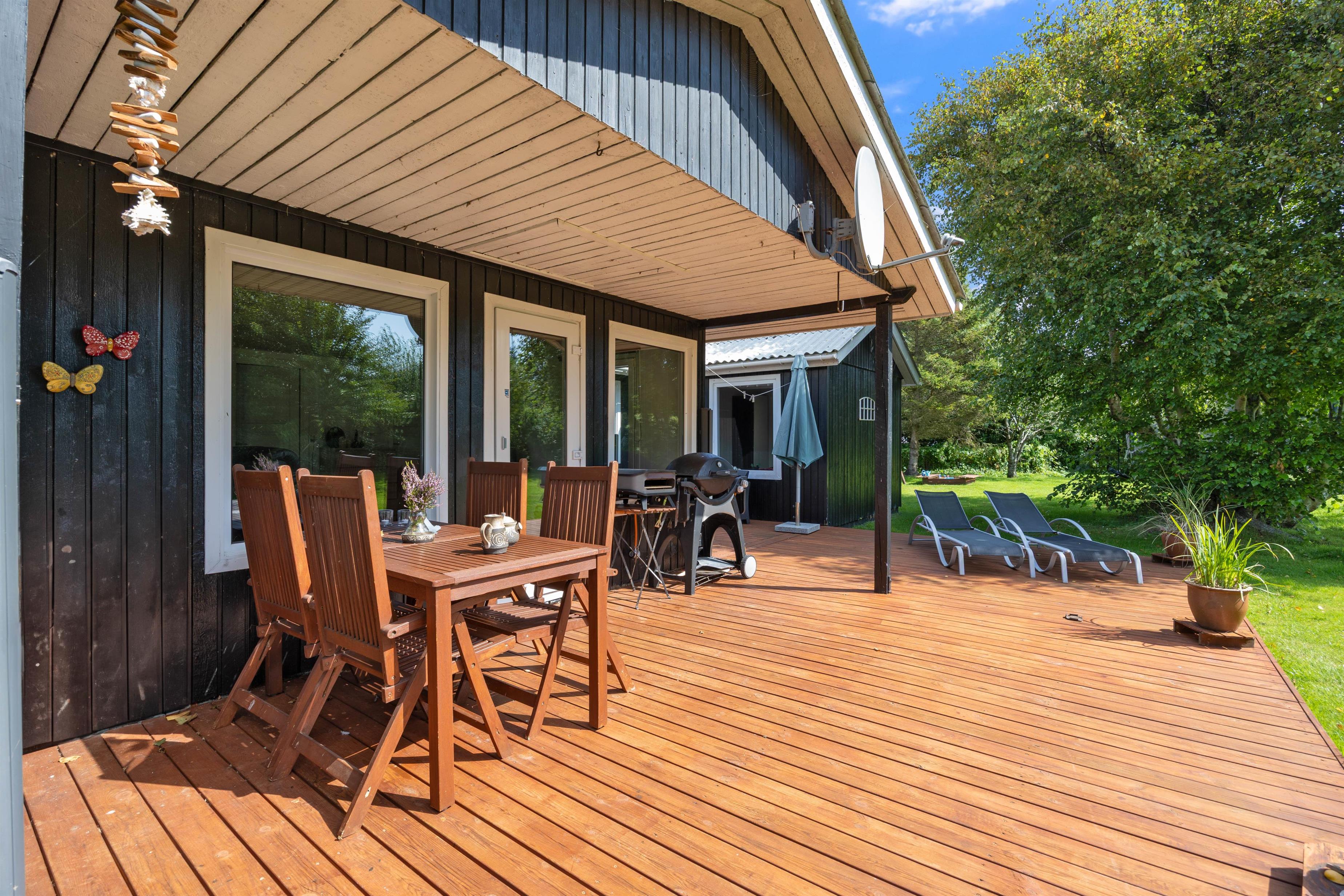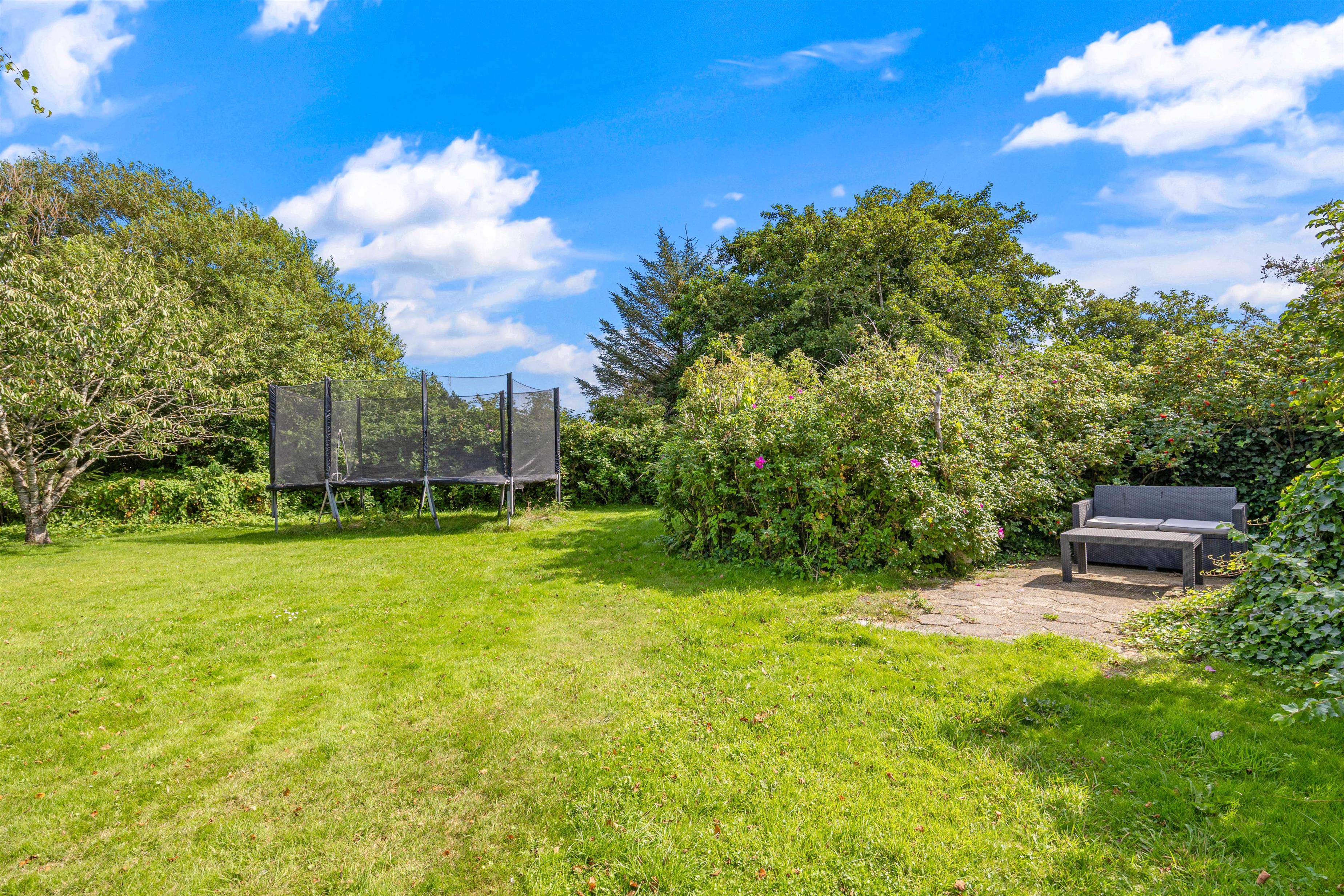 Sommerhuset i Bjerregård er omgivet af en rummelig 1202 kvadratmeter stor, lukket havegrund, som er ideel til hele familien. På den delvist overdækkede terrasse kan I nyde solen i de komfortable havemøbler og liggestole eller tilberede aftensmaden på grillen. Med de mange buske og træer, der omgiver ejendommen, er I helt uforstyrret her.