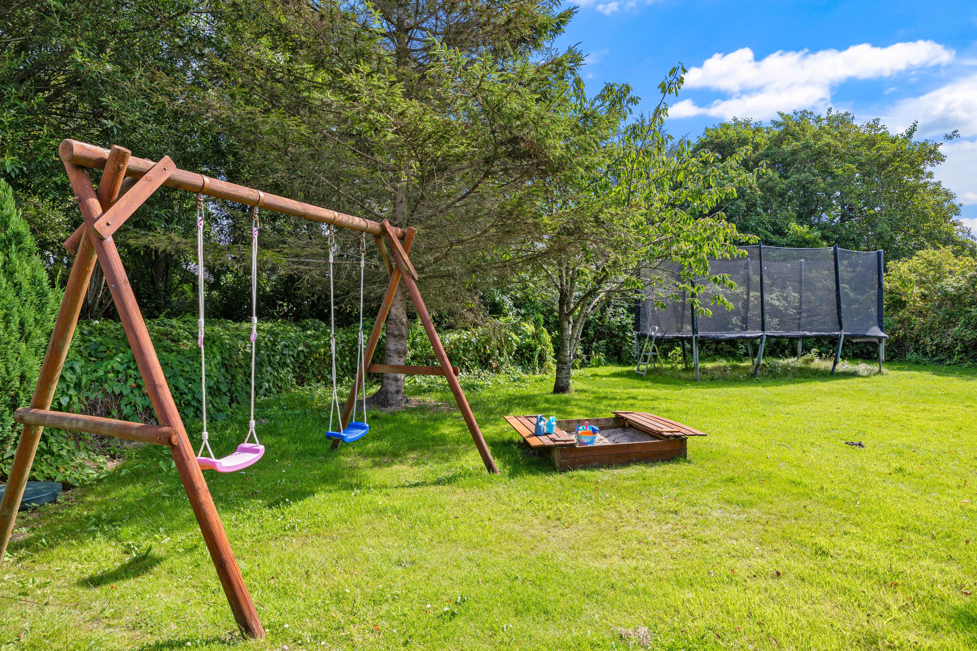 De børnevenlige faciliteter med sandkasse, gynge og trampolin sikrer, at også de yngste kan lege og være aktive i dagens løb. Der er carport til bilen samt opladningsmulighed for elbiler.