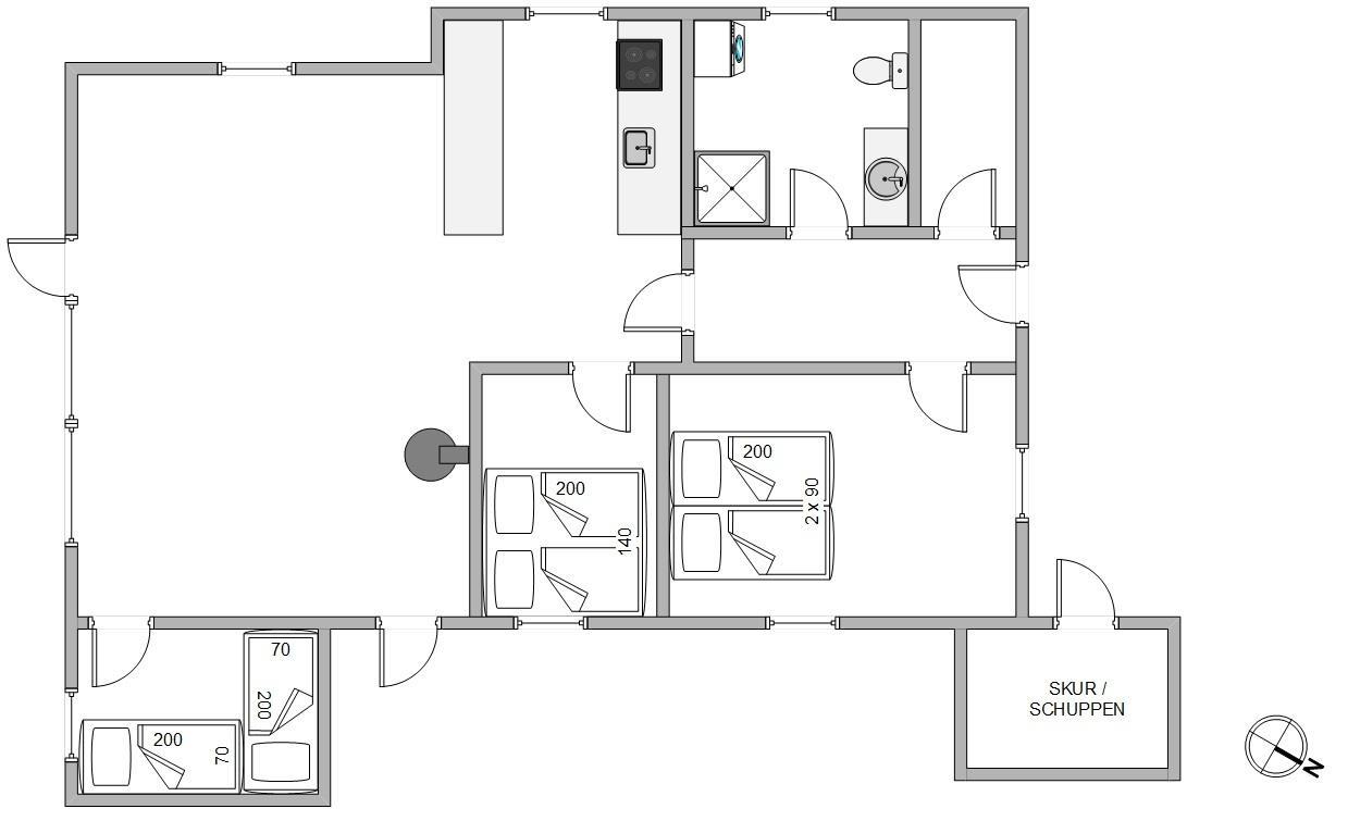 Det 73 m² store sommerhus fremstår lyst og venligt. Med plads til op til 5 personer er det ideelt for familier eller to par, der ønsker at holde ferie sammen. Der er 3 gode soveværelser, 2 af dem med dobbeltsenge (140x200 cm og 180x200 cm). Det sidste værelse har 2 enkeltsenge, som hver måler 70x200 cm. I det lyse badeværelse med gulvvarme findes også en praktisk vaskemaskine, som gør ferien endnu mere afslappet.