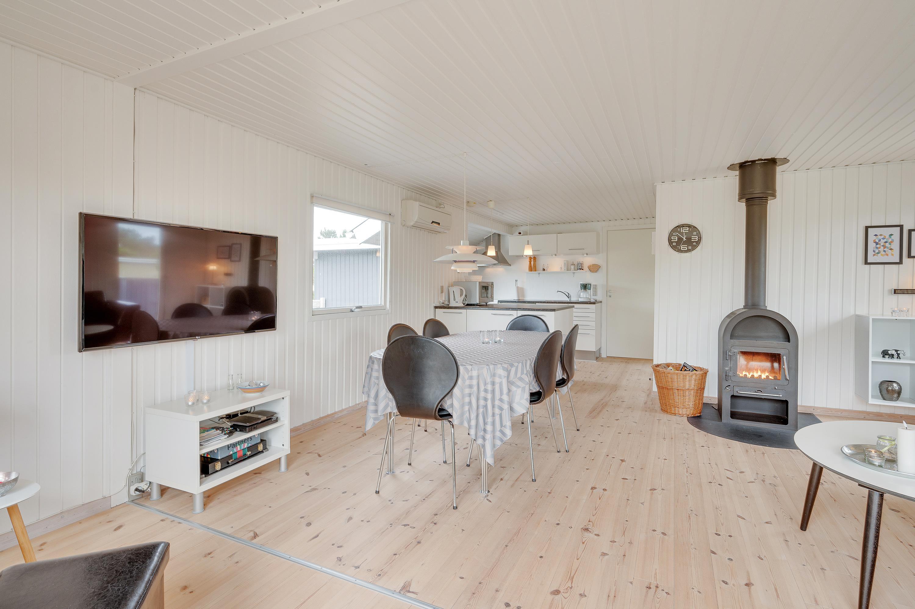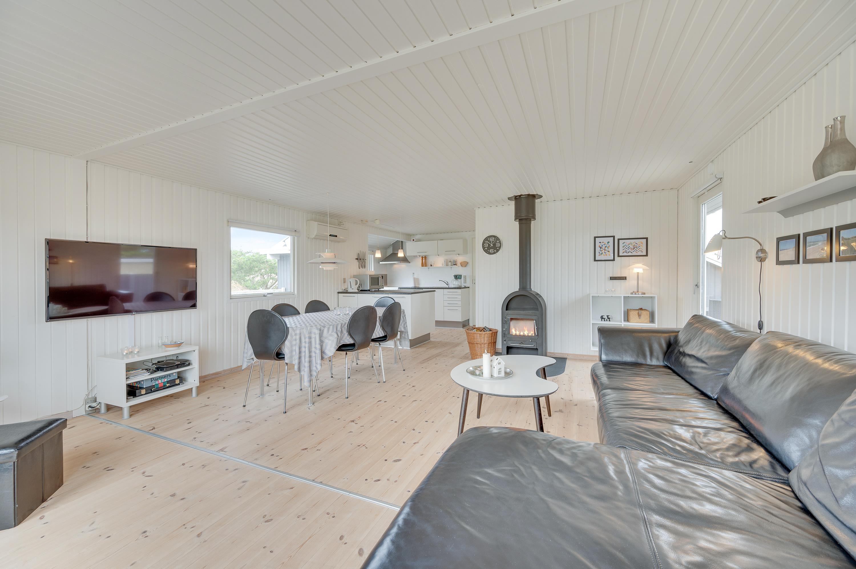 Hjertet i sommerhuset er den store kombinerede stue- og spiseafdeling med åben køkkenløsning. De store sydvendte vinduer fylder rummet med lys og skaber en indbydende atmosfære. For behagelig varme og et godt indeklima kan I benytte den energibesparende varmepumpe eller den hyggelige brændeovn. I det veludstyrede køkken kan I sammen tilberede lækre måltider, mens opvaskemaskinen gør arbejdet lettere. Om aftenen indbyder de komfortable sofaer og den behagelige lænestol til spil eller afslappet læsning.
