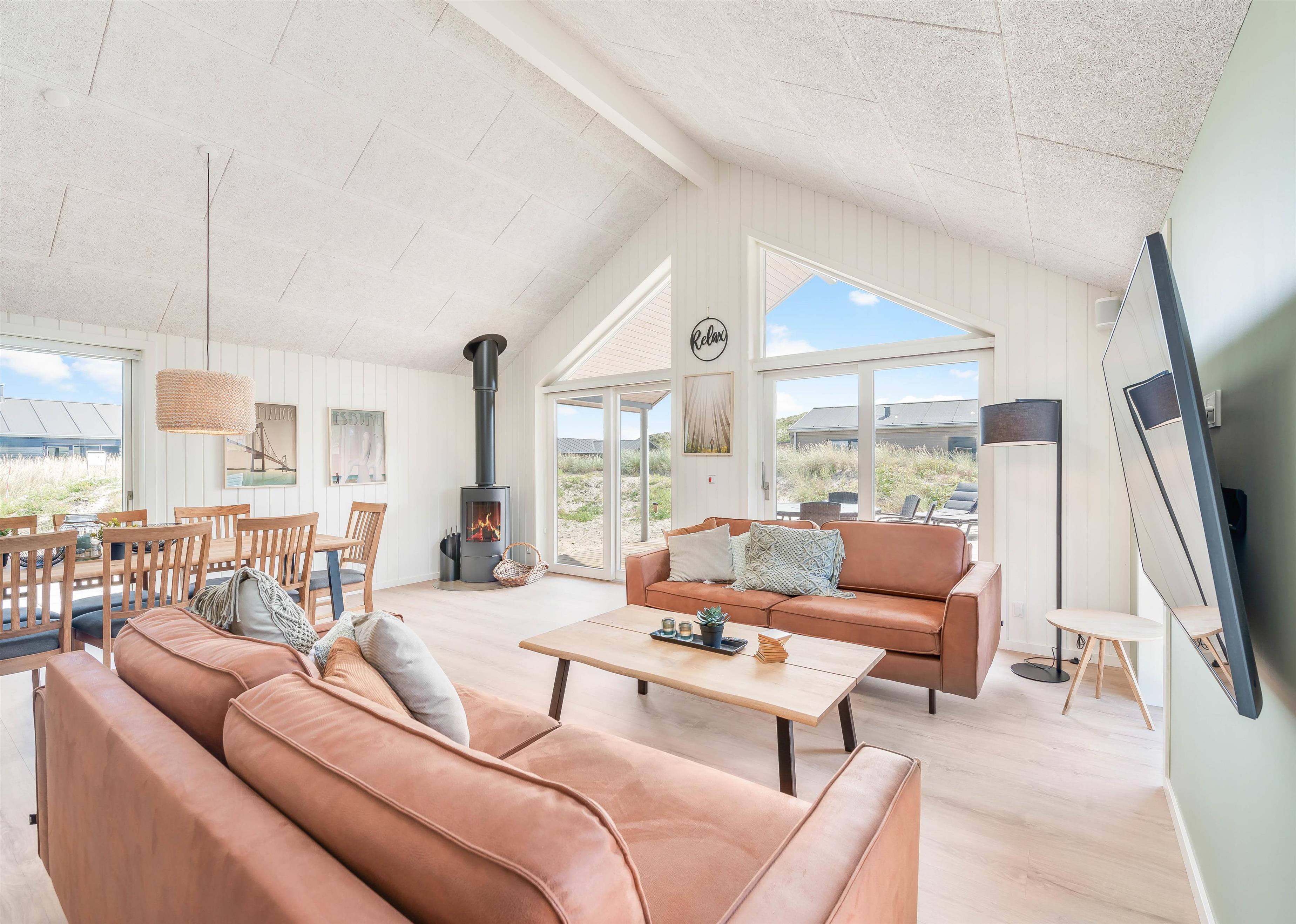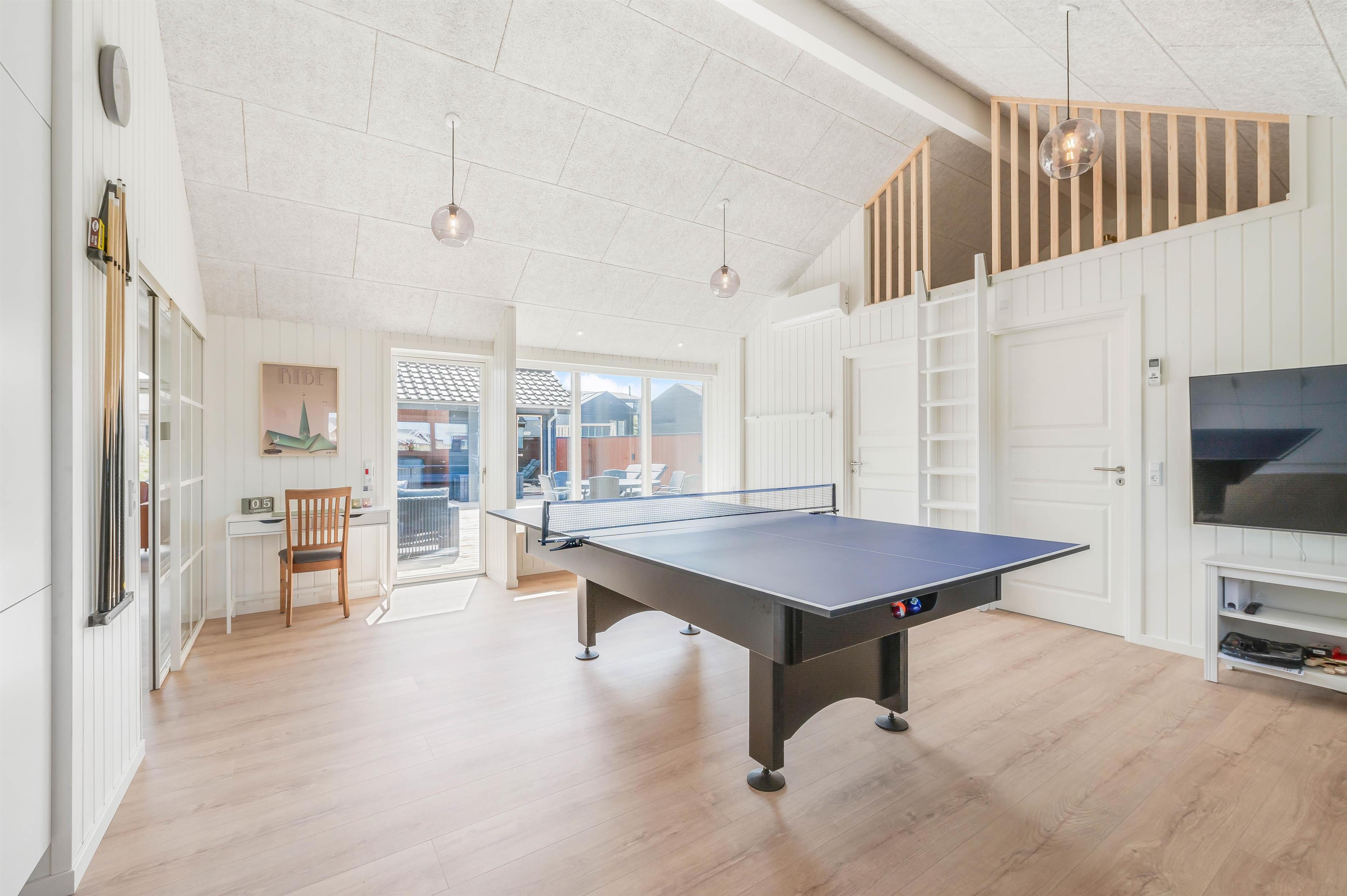 Op til 10 personer og to hunde kan føle sig velkommen i dette luksuriøst indrettede feriehus. Den rummelige og indbydende indrettede opholdsstue byder på masser af plads til familie og venner. Nyd en hyggelig aften med et godt glas vin foran brændeovnen eller organisér en tv-aften sammen. Aktivitetsrummet er ideelt til en lang aften med playstation-4, spil, pool eller bordtennis. Der er tysk og dansk tv.