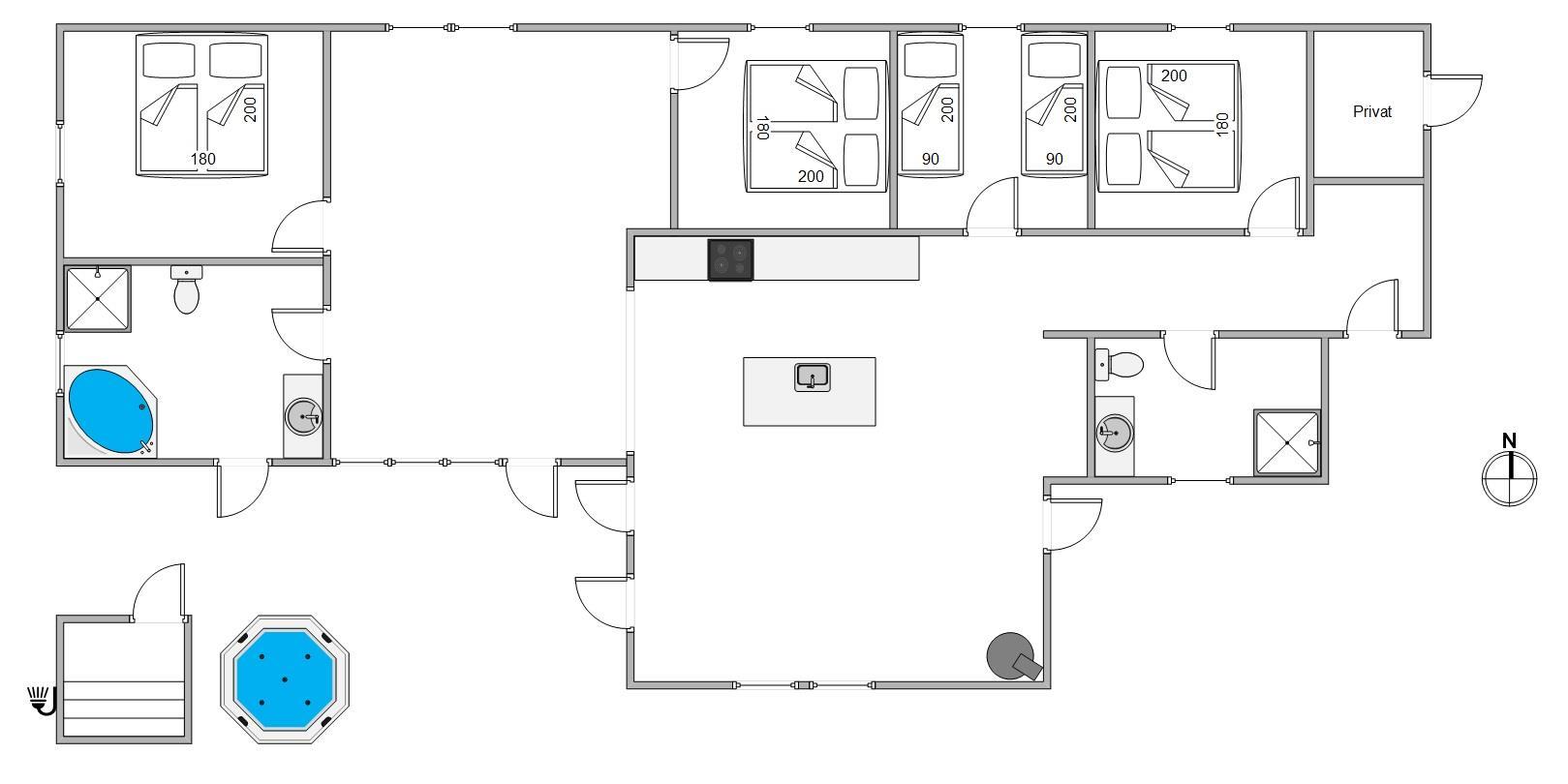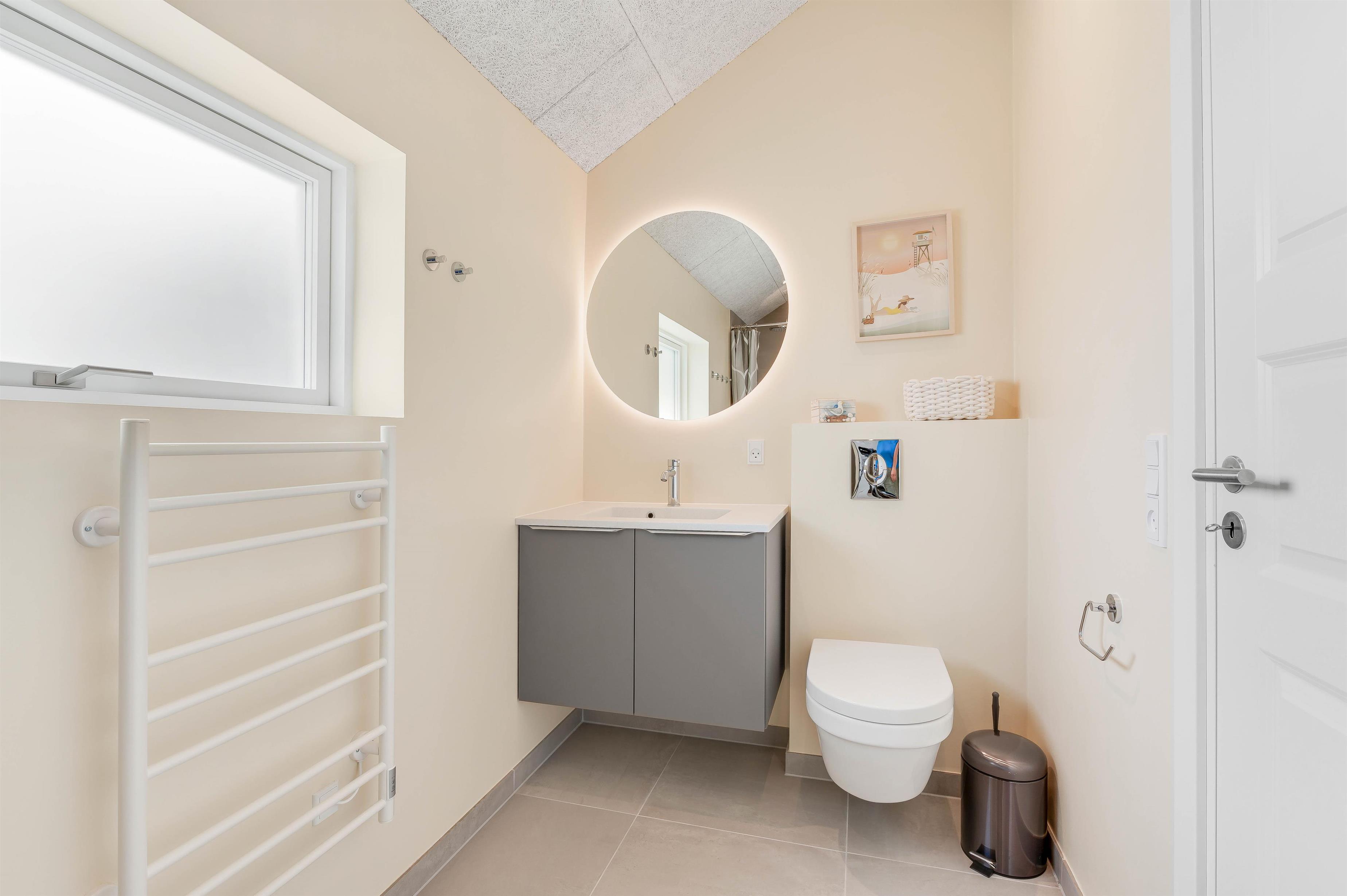 Der er gulvvarme i hele feriehuset, og du kan også supplere varmen med den energibesparende varmepumpe. De to højkvalitetsbadeværelser forebygger trafikprop om morgenen. Der er laminatgulv i hele stuen og i alle 4 soveværelser.