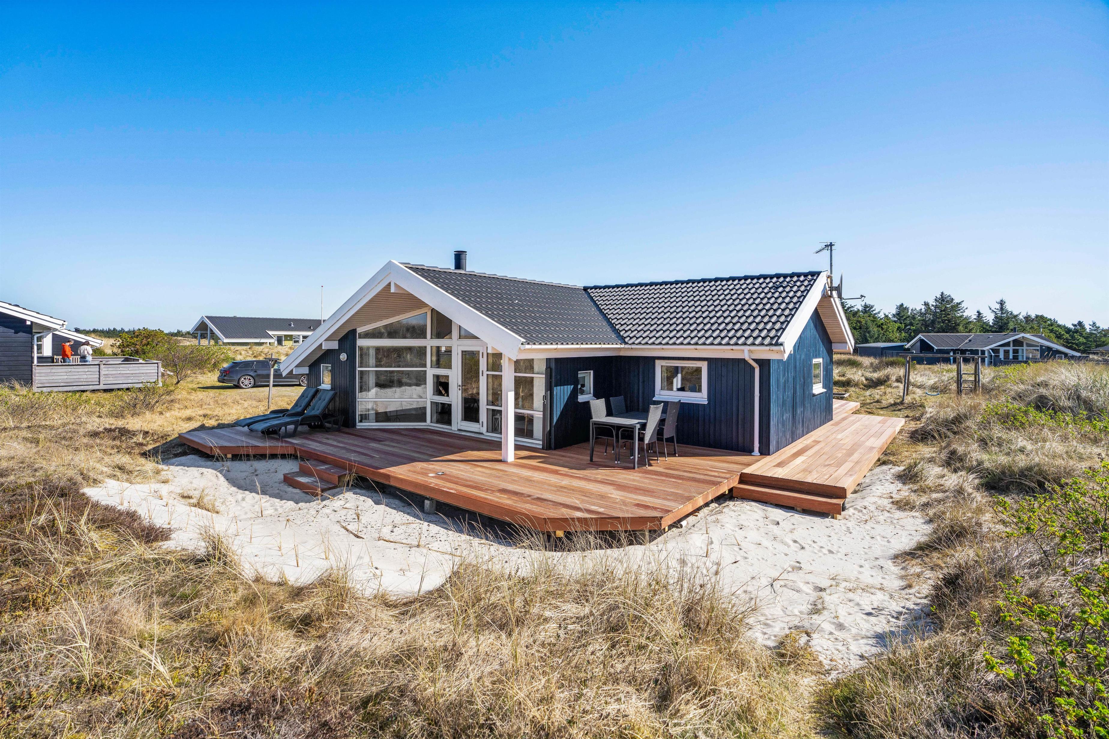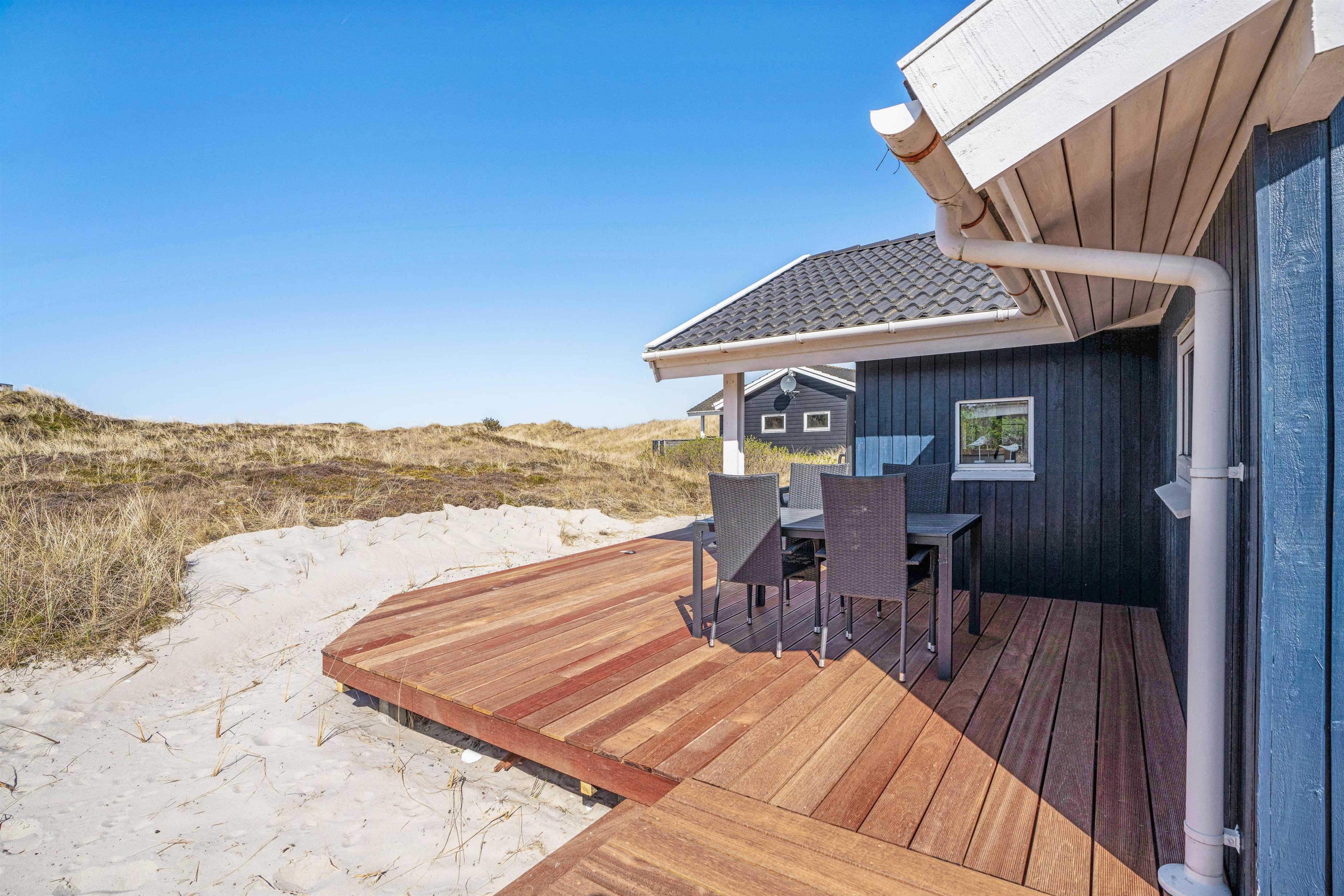 På sommerhusets vestlige side er der endnu en skøn terrasse. Denne er også delvist overdækket og delvist afskærmet mod nord. Herfra er udsigten skøn over det smukke klitlandskab, og Vesterhavet ligger kun 950 meter fra feriehuset.