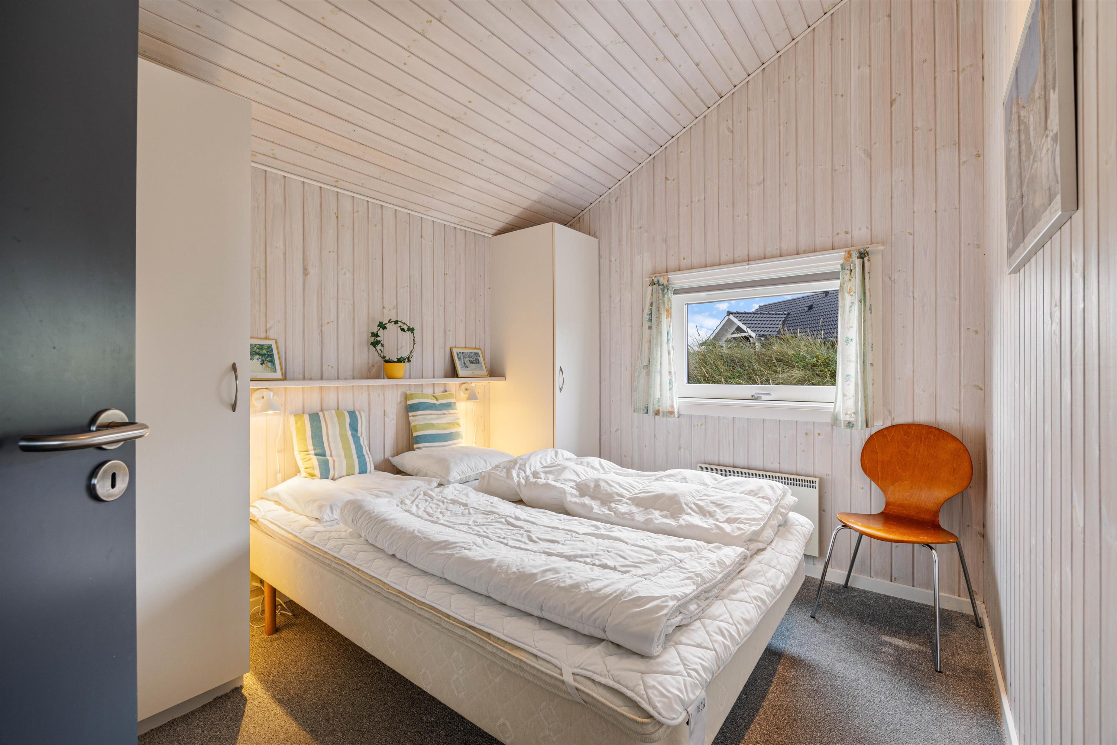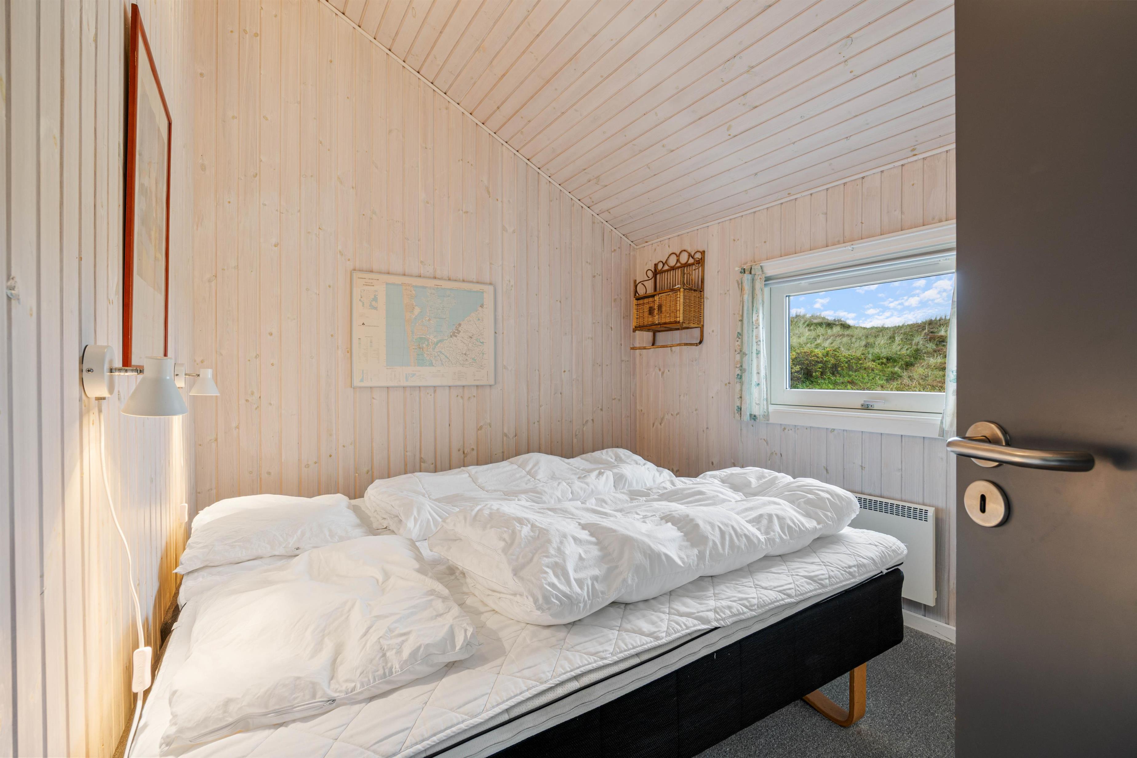 I køkken og stue er der træloft til kip, køkkenet er udstyret med en opvaskemaskine, en mikroovn og en fryser på 10 L. Stuen er hyggeligt indrettet, og her er der også trægulv samt en smuk udsigt over klitlandskabet mod vest. Der er en brændeovn, et fladskærms-TV, en radio m/CD-afspiller, varmepumpe og gratis trådløst internet.