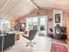 Sommerhuset har et lyst og pænt køkken med opvaskemaskine og mikroovn. Køkkenet står i åben forbindelse med stuen, som er rigtig hyggeligt indrettet med gode og komfortable møbler, brændeovn og fladskærm.