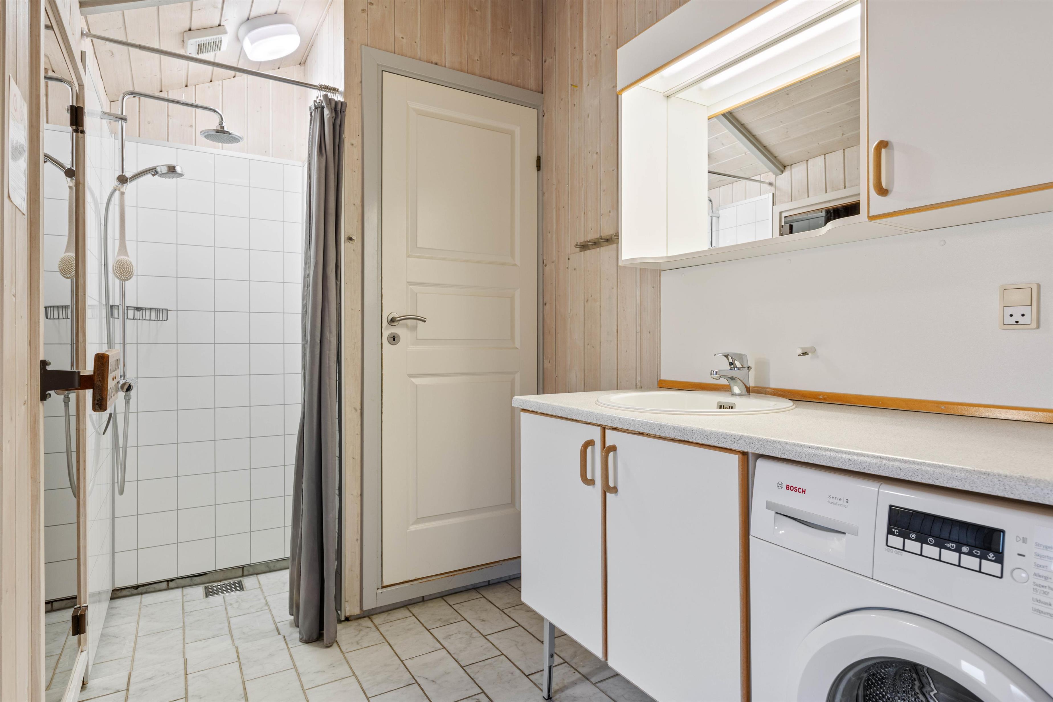 De 2 badeværelser i sommerhuset er funktionelt indrettet og har gulvvarme. Det ene badeværelse har desuden sauna og spabad til afslappende stunder. Her kan I efter en lang dag i den friske luft hygge jer og lade dagen afslutte roligt.