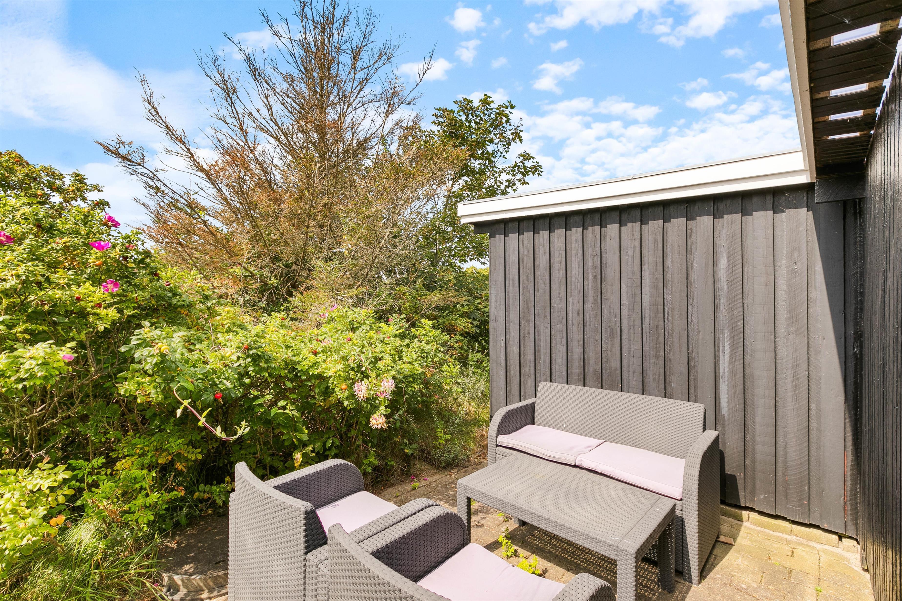 Huset har 2 soveværelser – et med dobbeltseng og et med 2 køjesenge til i alt 6 personer. Omkring huset er en fin træterrasse, så du i løbet af hele dagen kan finde et solrigt sted med læ for vestenvinden. Nye stilheden med vindens raslen i trætoppene, fuglesang og lad dine tanker få frit løb.