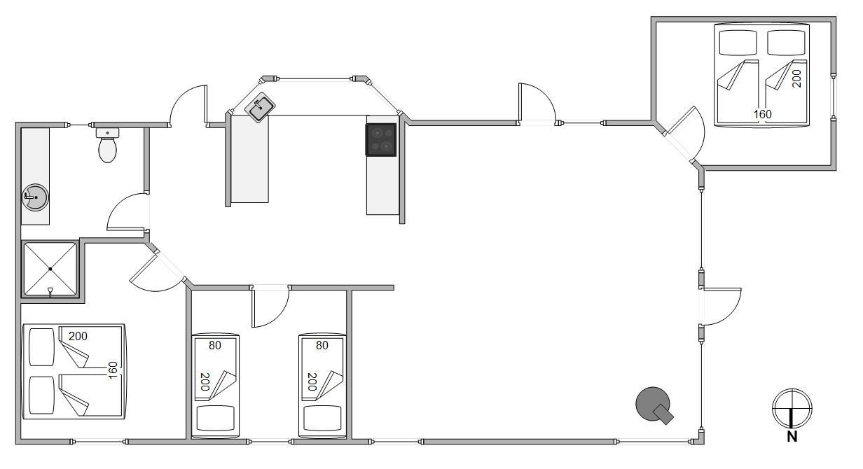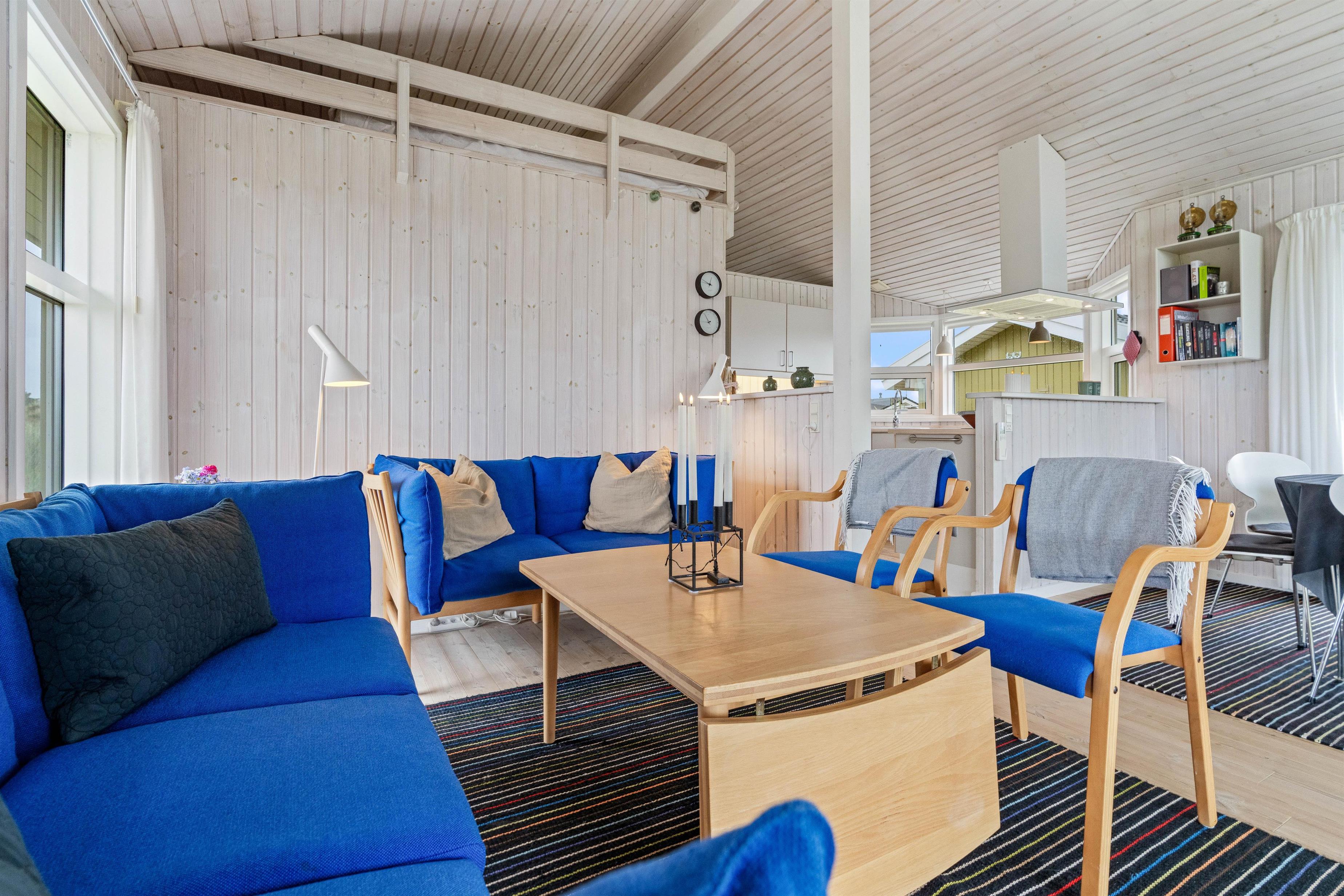 Indretningen sætter fokus på hygge og samvær, da du i midten af feriehuset har et dejligt åbnet opholdsrum med stue, spiseafdeling og køkken. Her har du plads til madlavning i fællesskab, afslapning foran brændeovnen, sjove spilaftener for hele familien og meget meget mere.