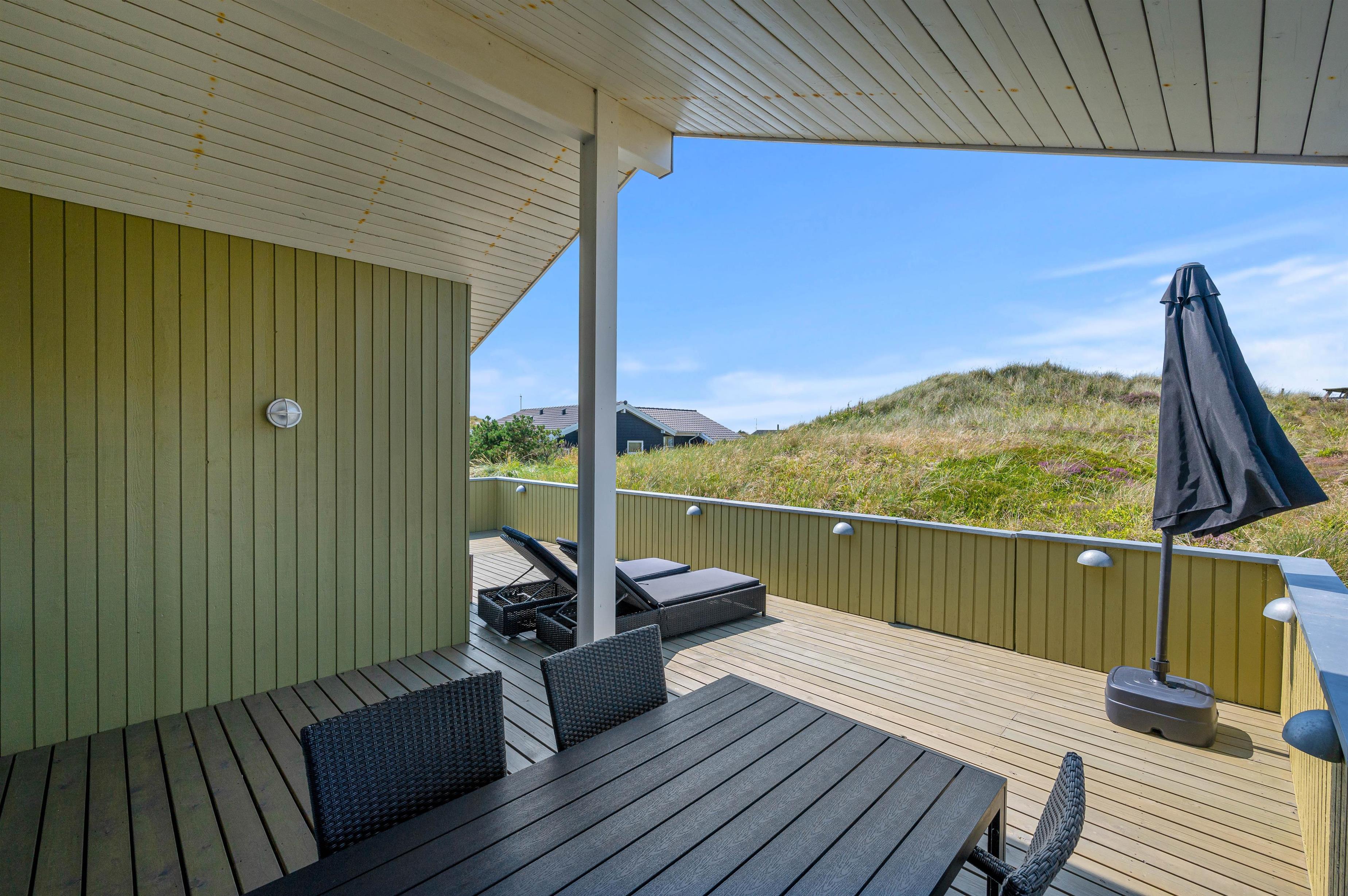 Terrassen i syd er godt afskærmet, så du kan sidde lidt i læ og nyde ferien i fred og ro. Og i nordvest har du også en dejlig terrasse, hvor du kan nyde udsigten til klitterne og heden – en smuk baggrund til en hyggelig grillaften.