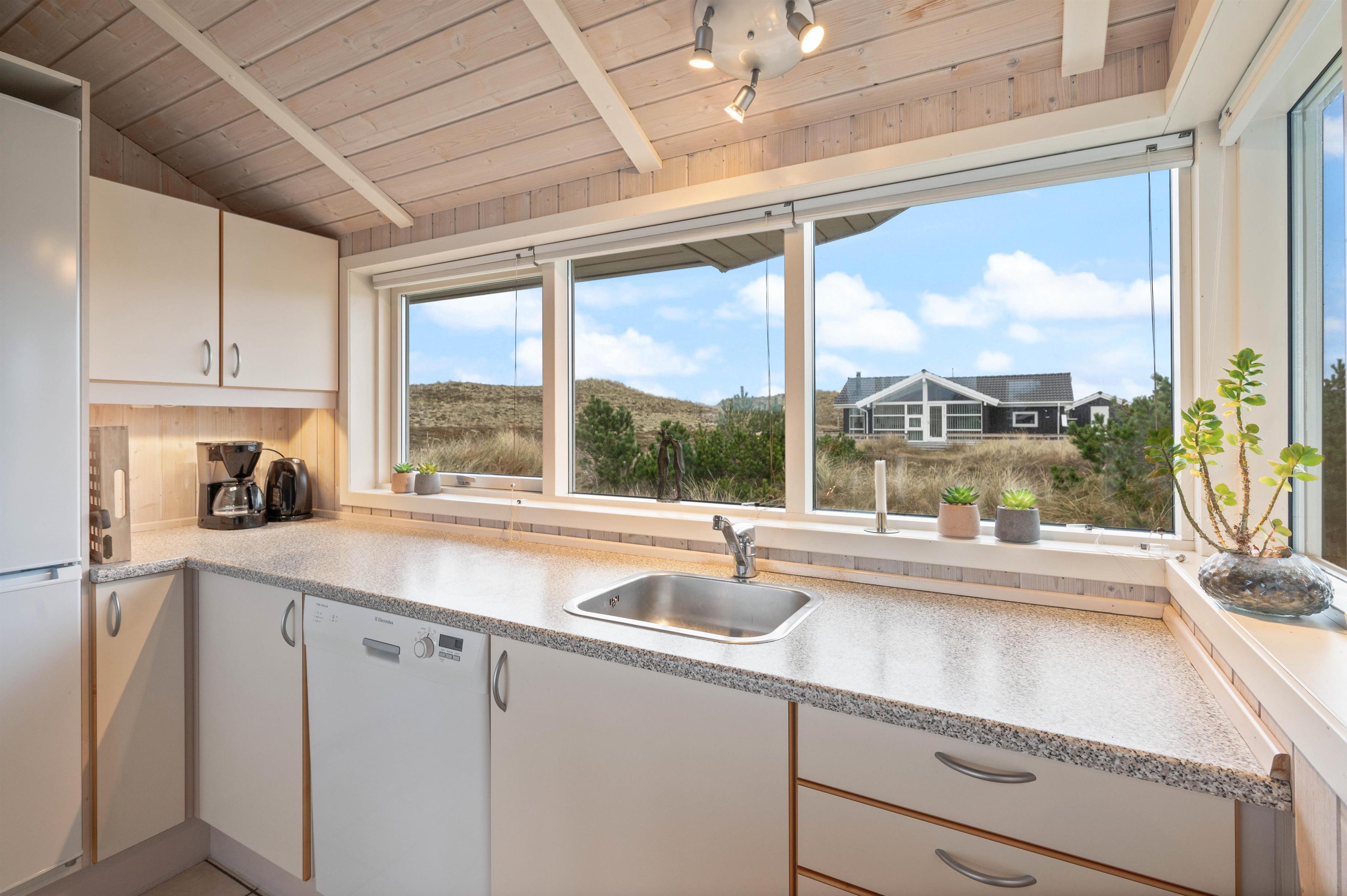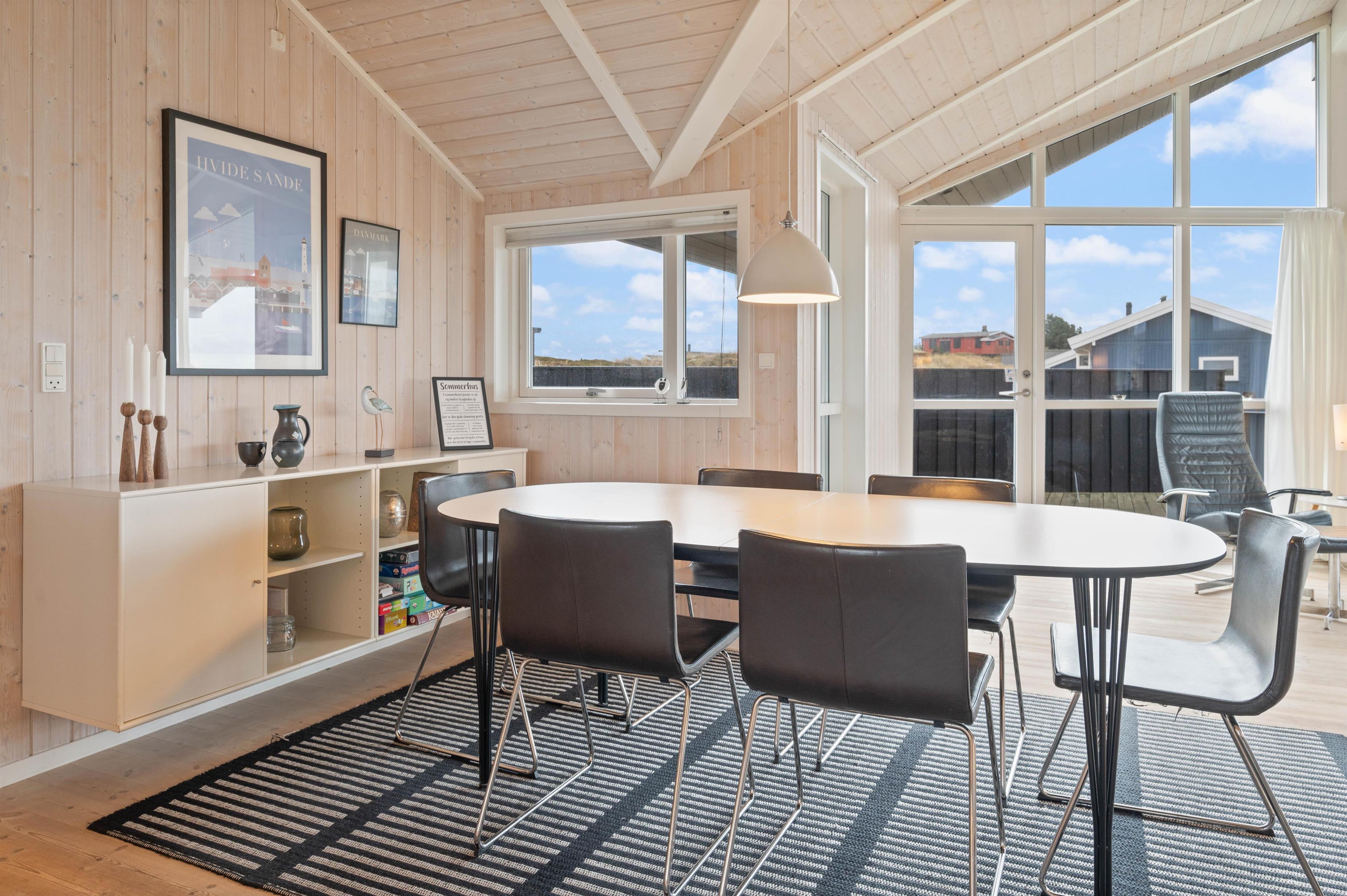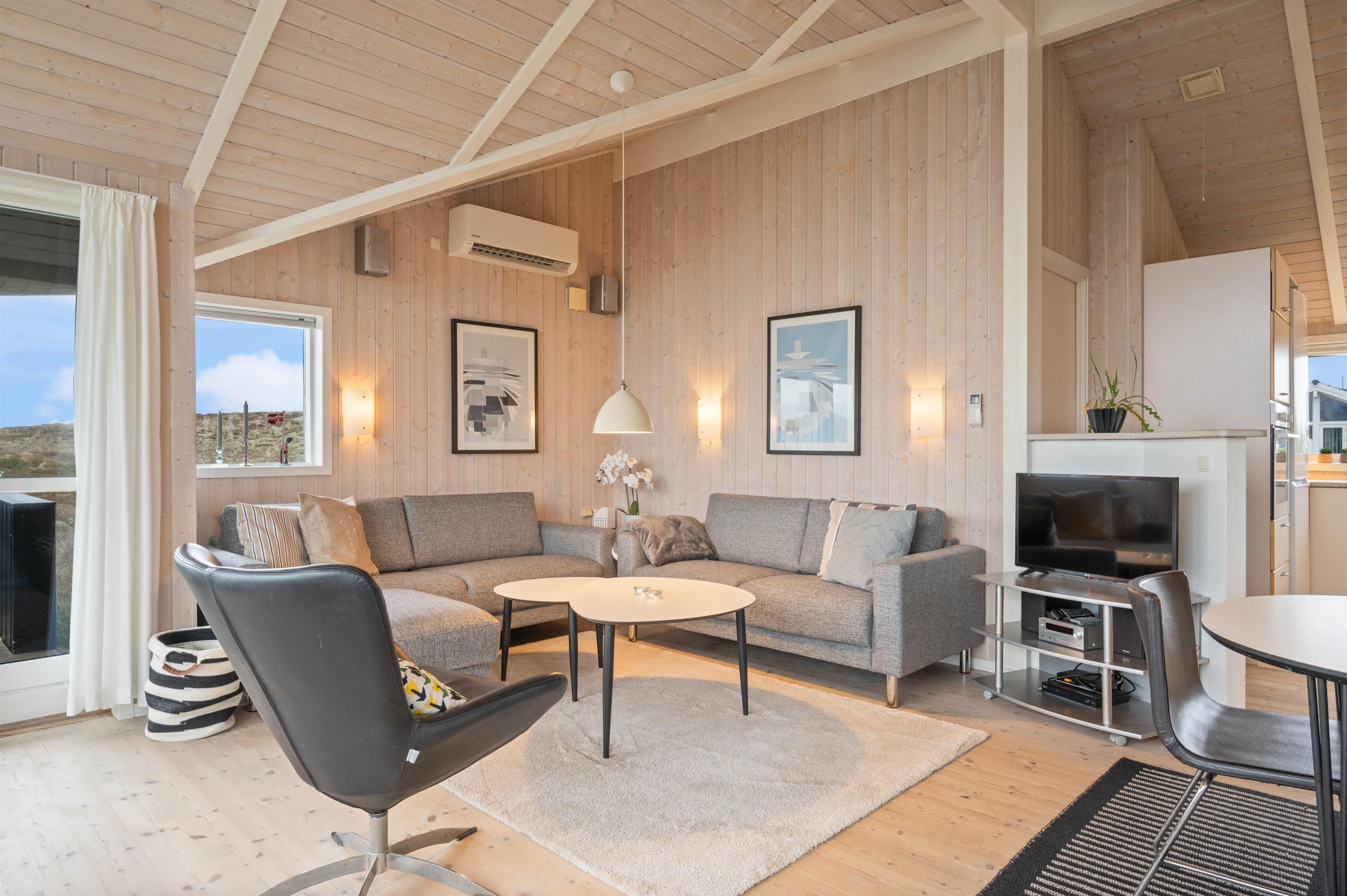 Stue samt spisestuen danner samlingspunktet for familien. En integreret del af stuen, er det veludstyrede køkken. Her er en afslappende rummelig atmosfære, mens de store vinduer inviterer lyset indenfor. På de køligere dage kan I streame jeres yndlingsfilm via feriehusets Chromecast og mærke brændeovnens varme brede sig – imens klarer opvaskemaskinen oprydningen efter maden.