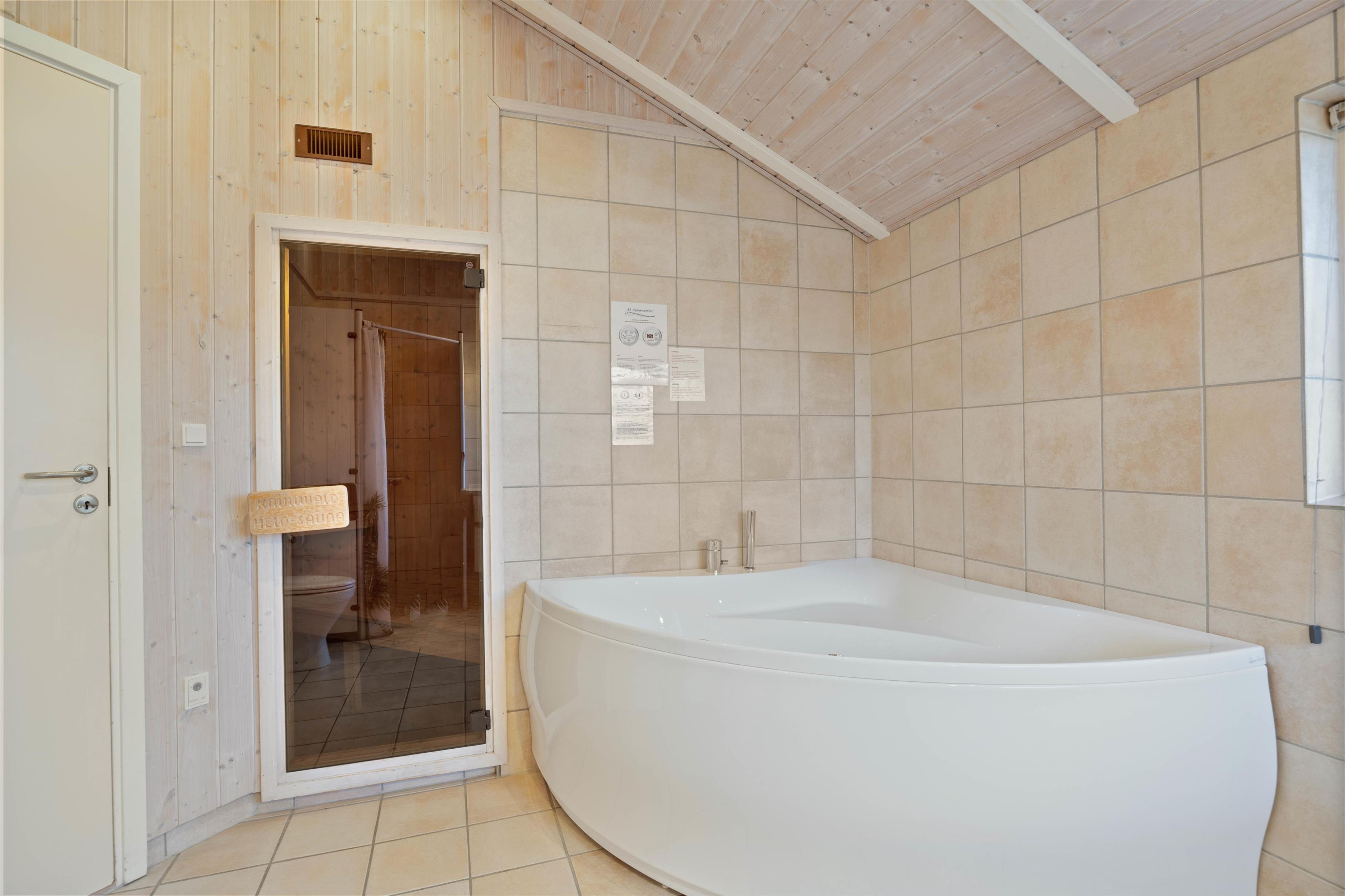 Skal I forkæles lidt ekstra, finder I både en dejlig hjørnespa og sauna på det store badeværelse – også familiens yngste vil elske at plaske rundt i det varme vand. Desuden er feriehuset også udstyret med vaskemaskine, tørretumbler og fibernet.