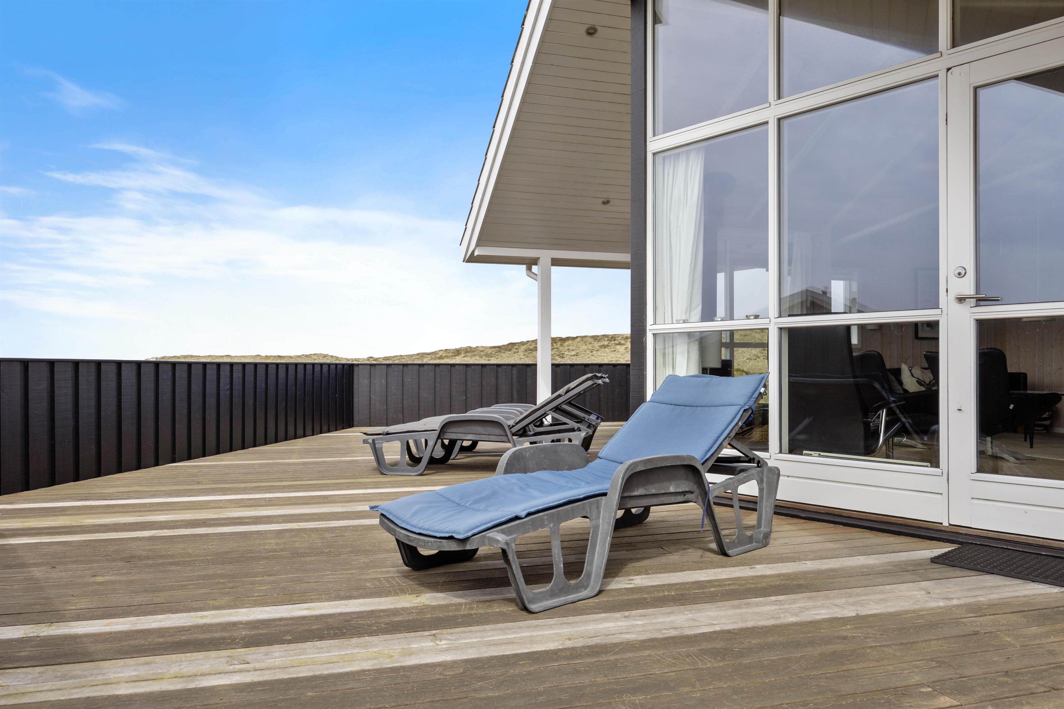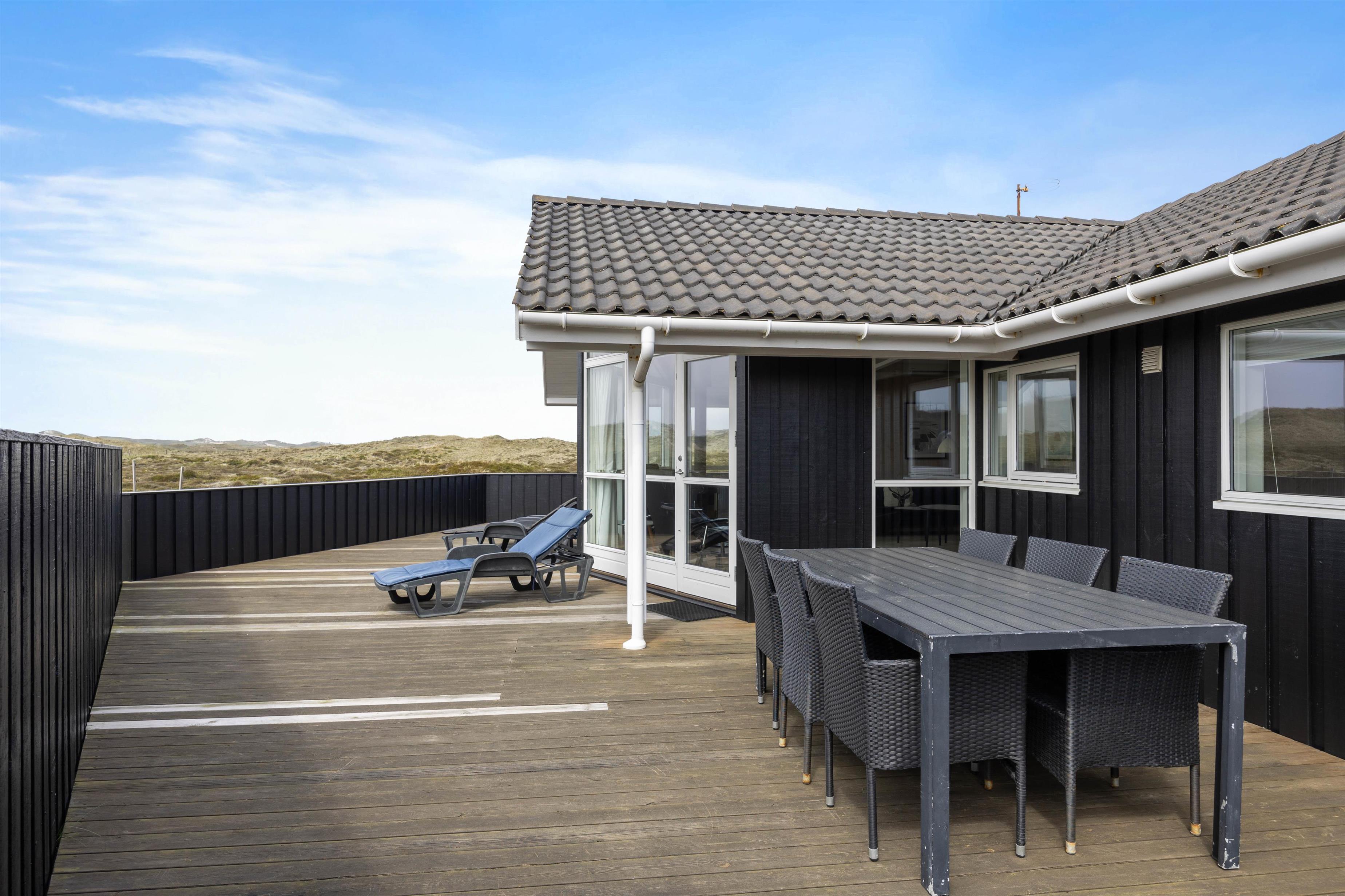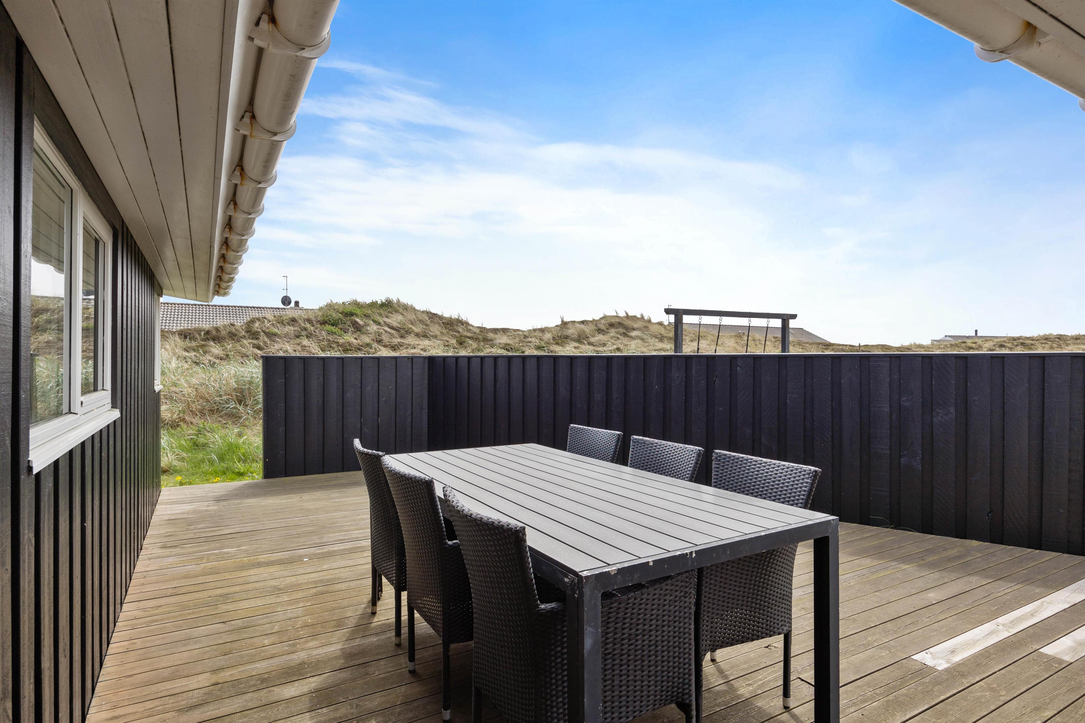 Dette dejlige sommerhus har en stor lukket terrasse. Nyd morgenkaffen og udsigten udover den smukke vestjyske natur, der er nærmeste nabo. Havemøbler og liggestole indbyder til timevis af afslapning på terrassen, og der kan tændes op i grillen for at skabe den perfekte feriemiddag.