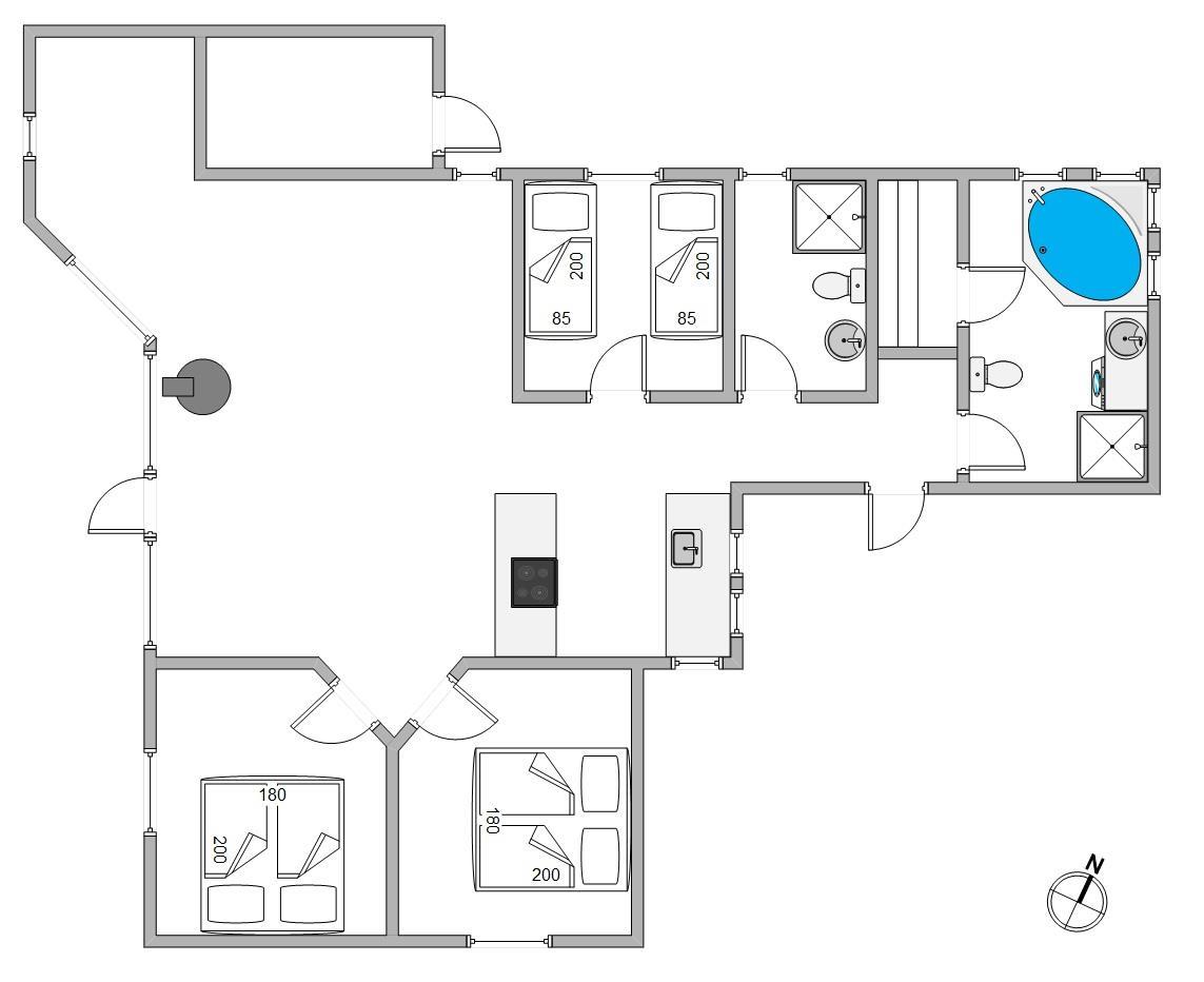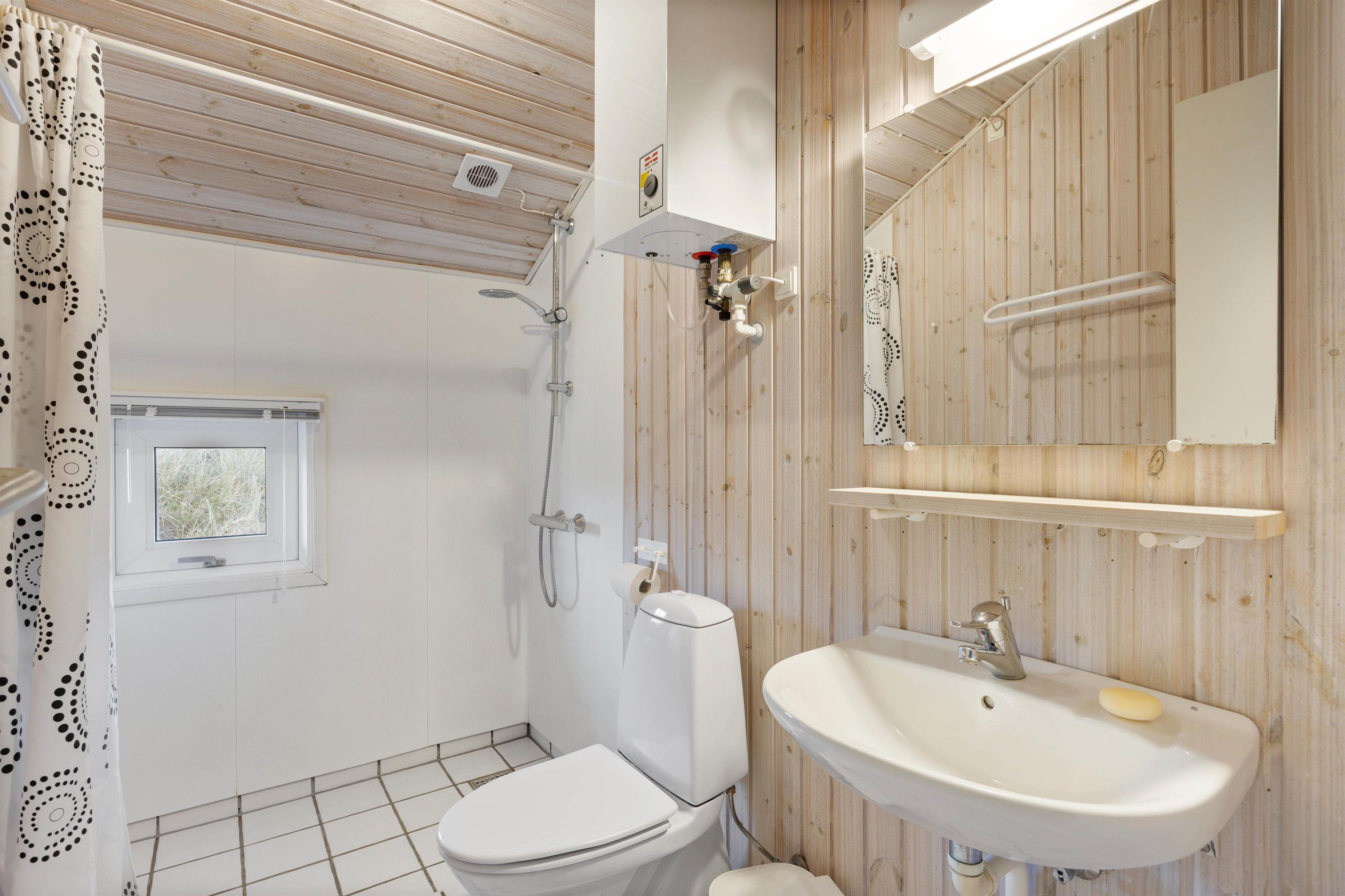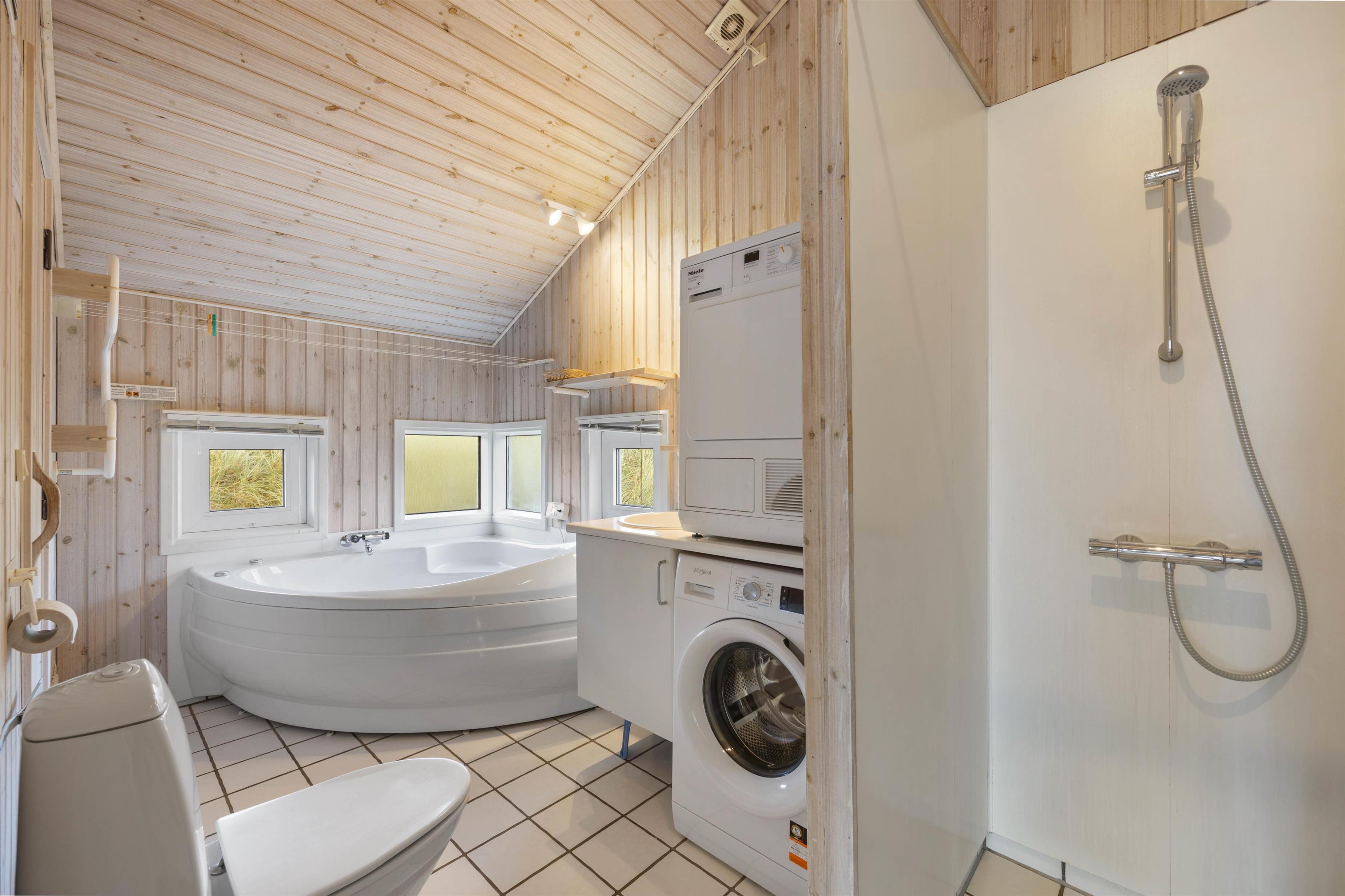 Feriehusets 2 badeværelser er begge udstyret med gulvvarme, og på det store kan I slappe af med sauna og boblebadets varme vand. Også her har I vaskemaskine og tørretumbler til rådighed, så strandhåndklæderne kan friskes op under opholdet.
