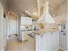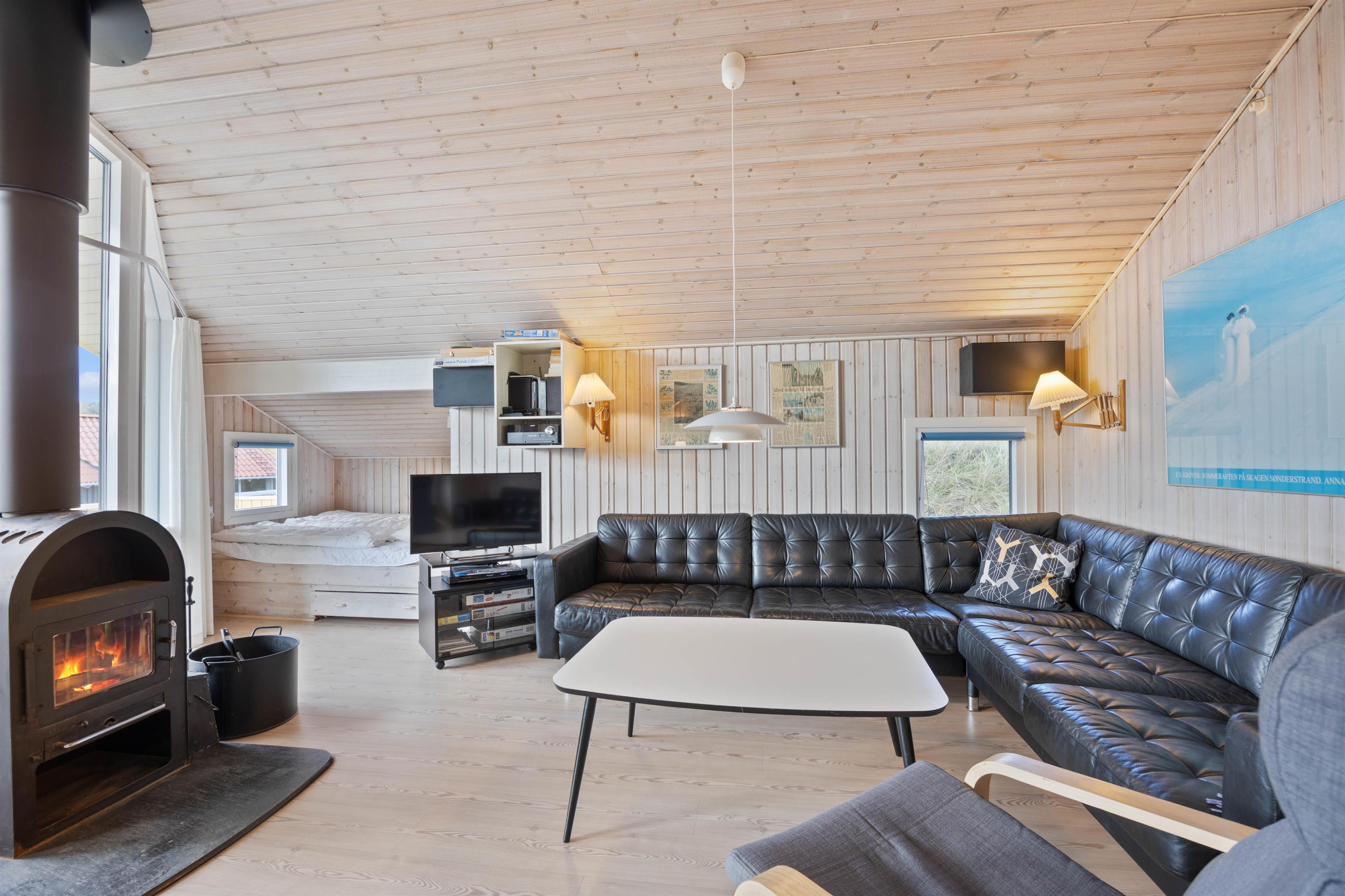 I stuen er der lagt op til afslapning; her kan I for alvor flyde ud i den store hjørnesofa, imens pejsen knitrer i baggrunden. Stuen, hvor der er højt loft, er i åben forbindelse med køkkenet, hvilket skaber en rummelig fornemmelse. Her er plads til at være sammen, mens I har gang i forskellige ting. Ved spisebordet hænger desuden en energibesparende varmepumpe, der sørger for et behageligt indeklima.