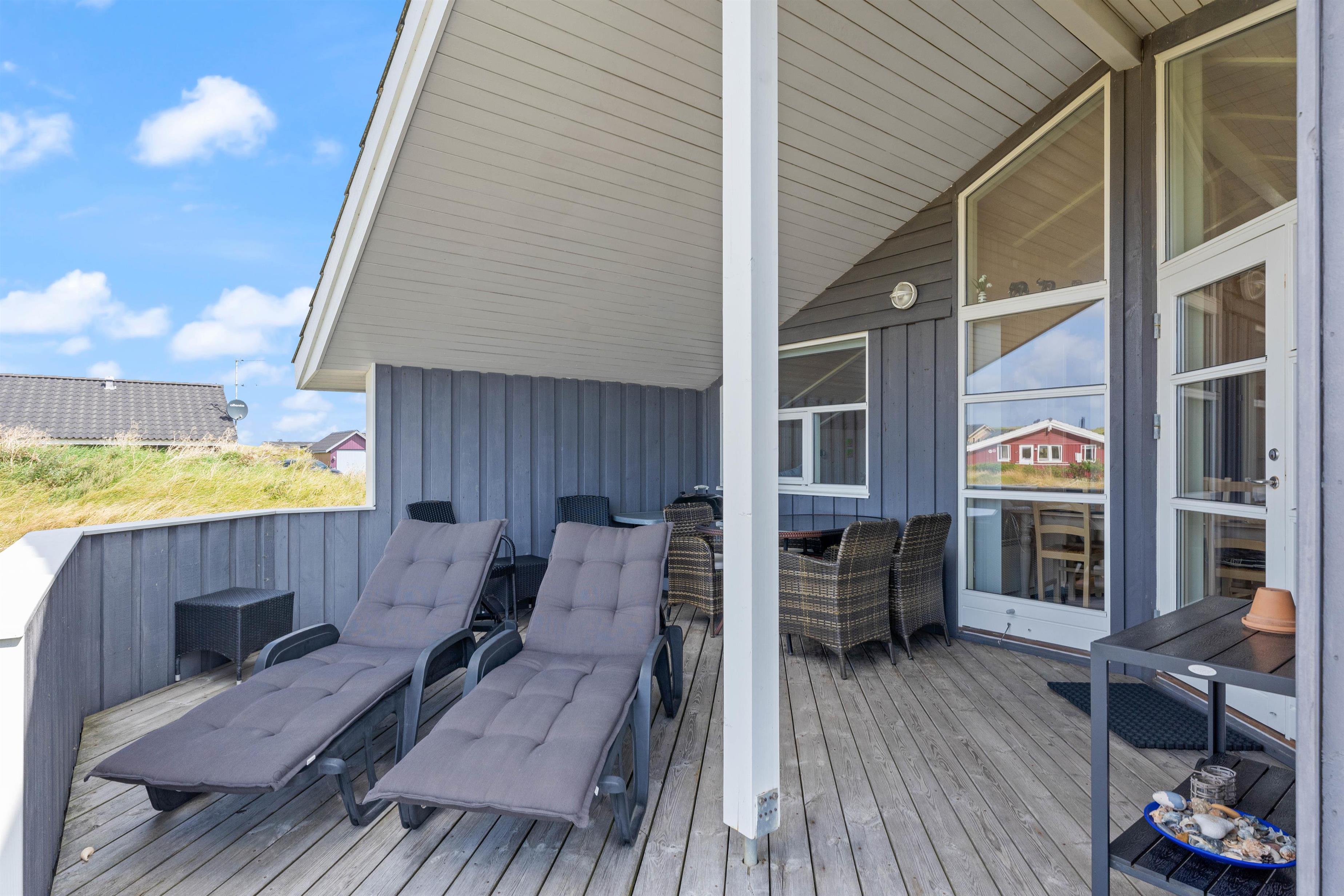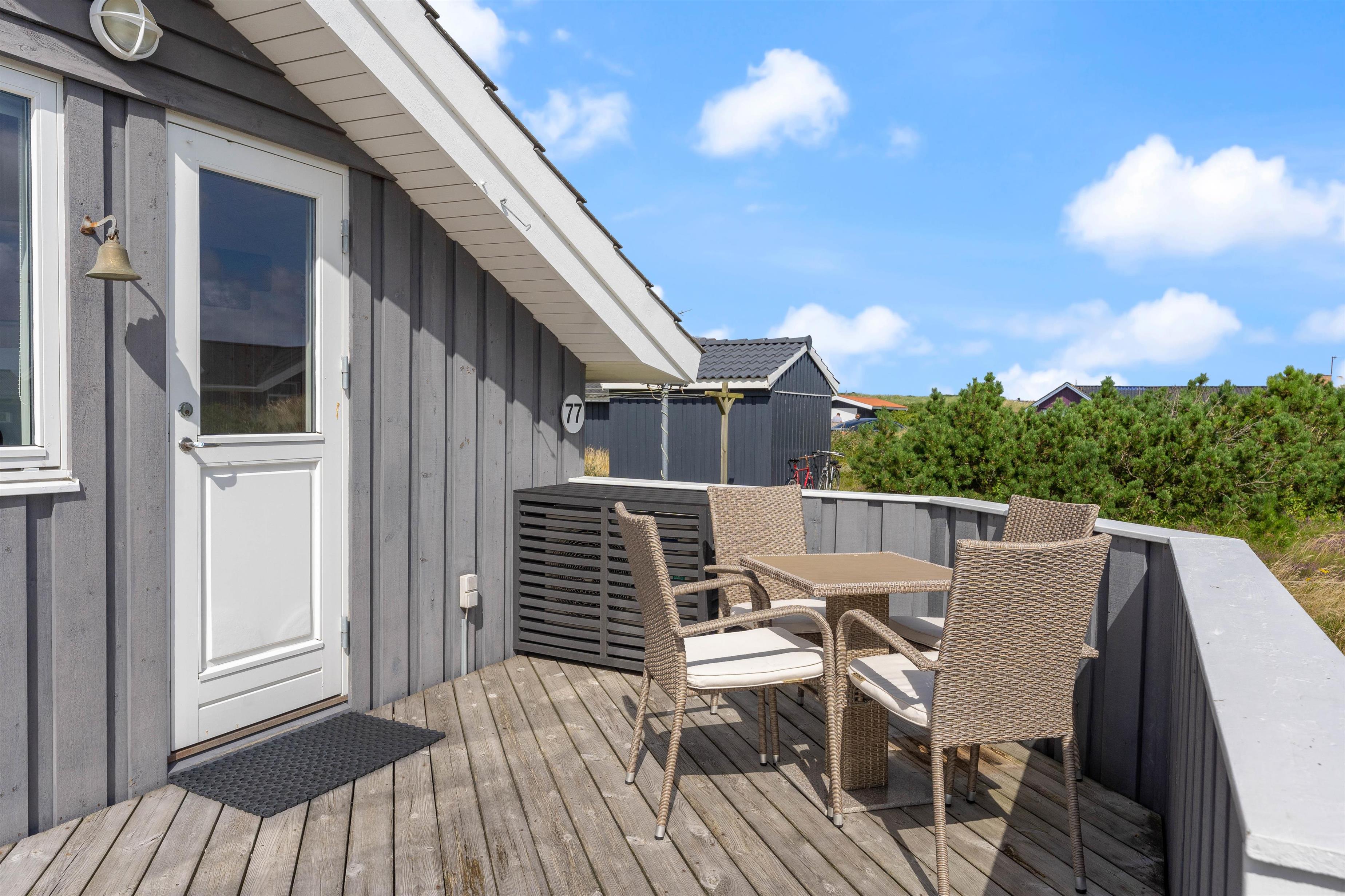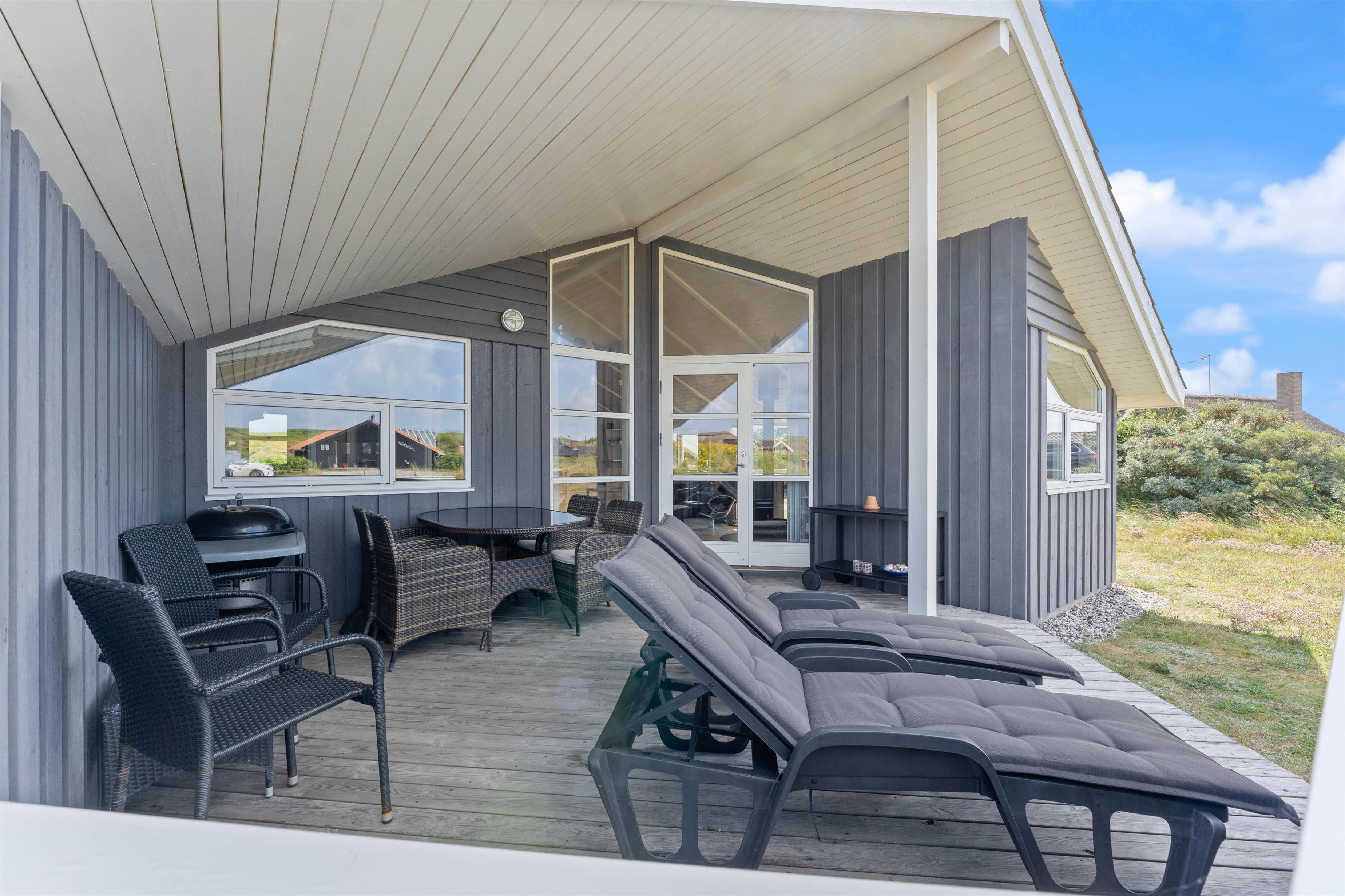 Fra stuen kommer I ud på den gode terrasse, hvor I kan sidde og nyde den friske luft i stort set alt slags vejr, eftersom der både er overdækning og afskærmning. Til de mindste feriegæster er der sat et gyngestativ op.