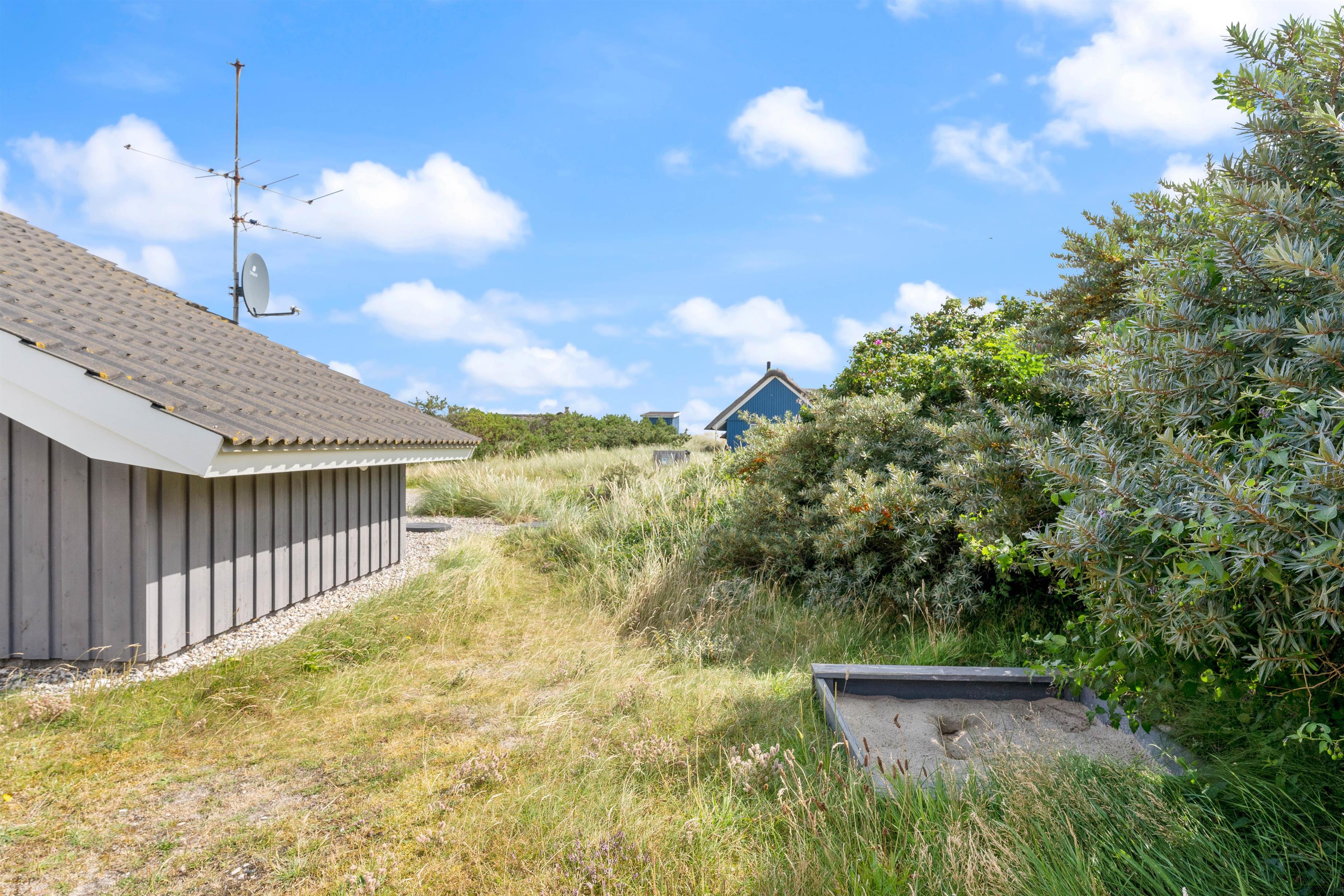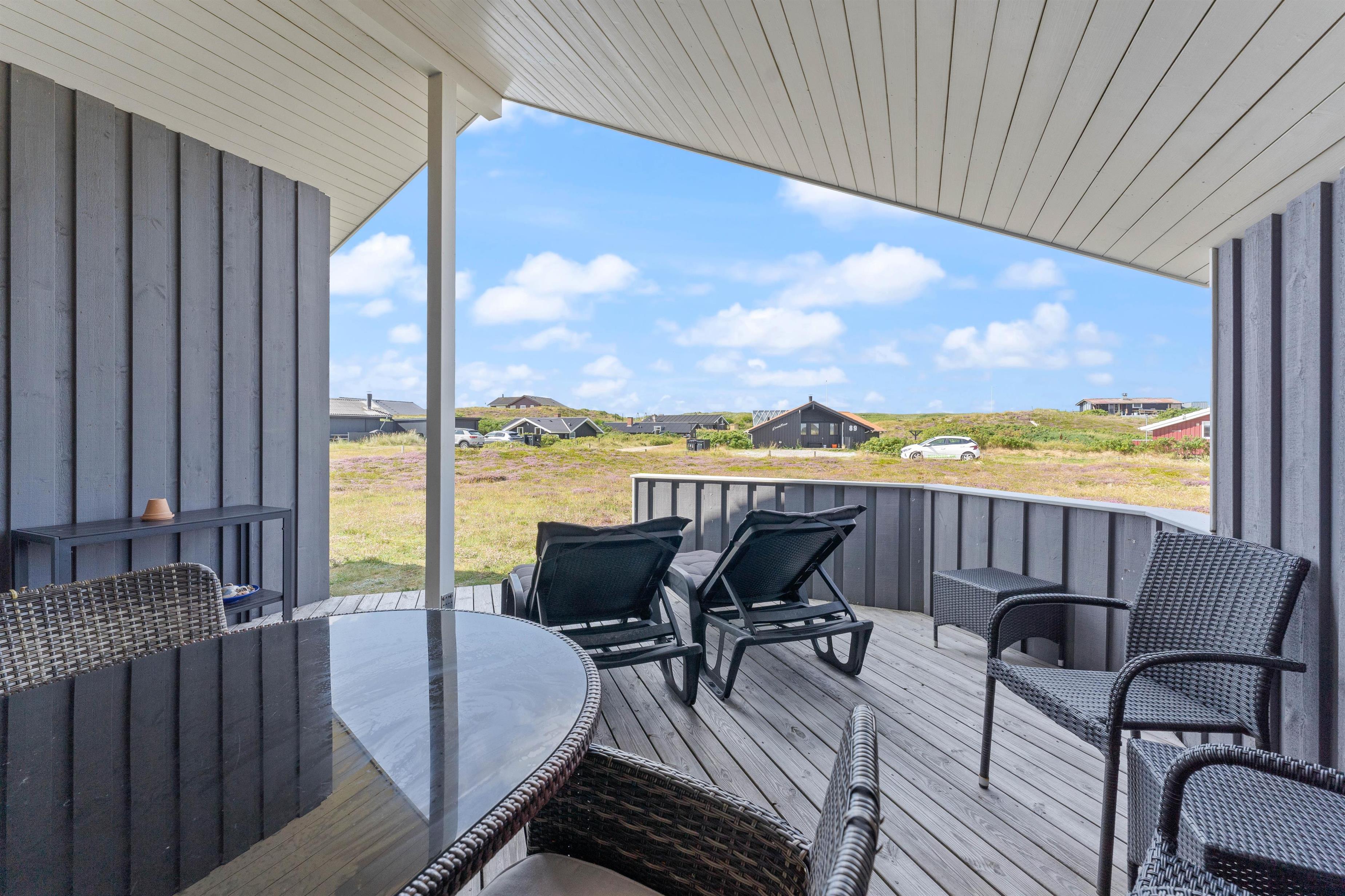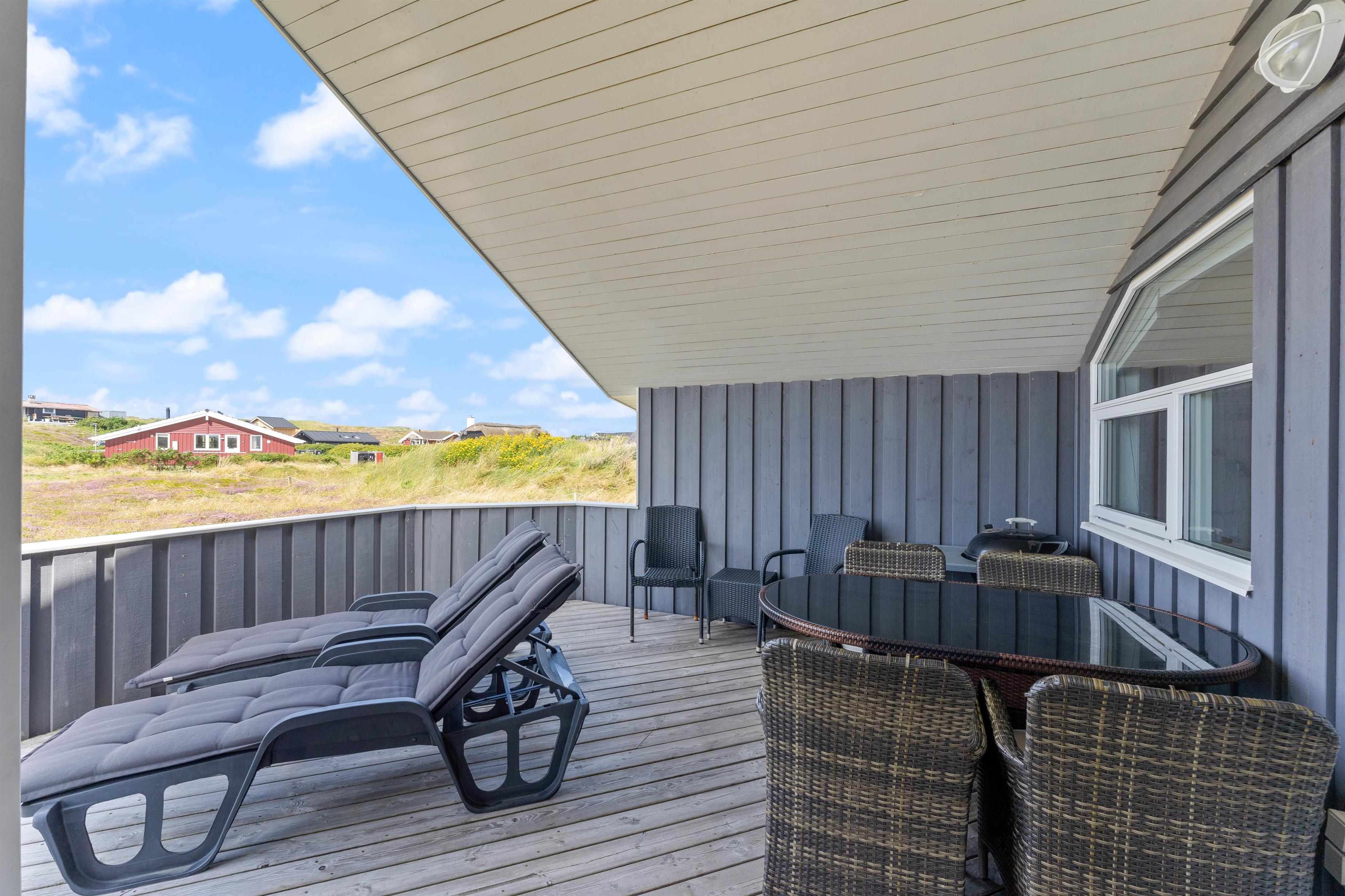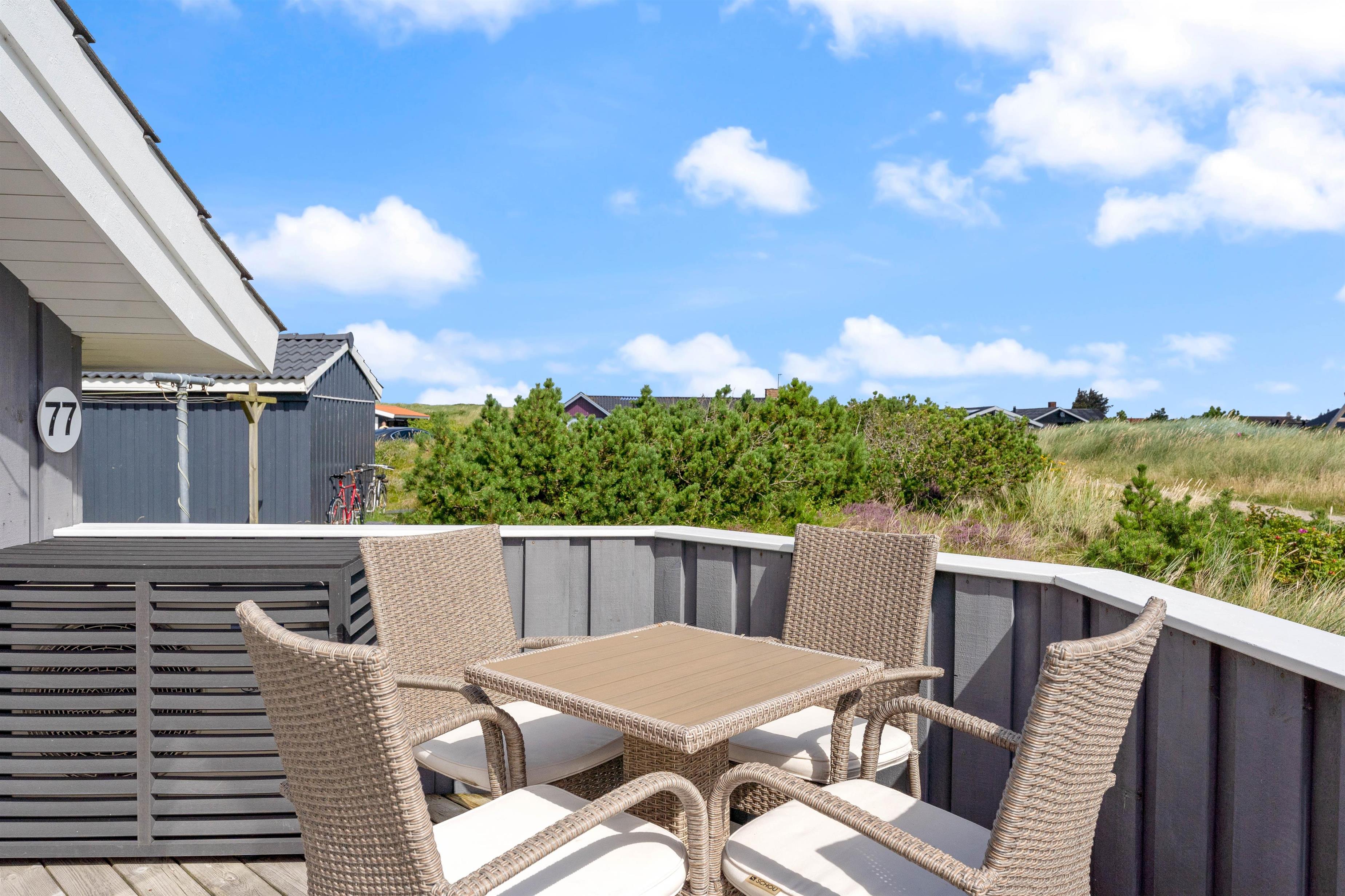 Fra stuen kommer I ud på den gode terrasse, hvor I kan sidde og nyde den friske luft i stort set alt slags vejr, eftersom der både er overdækning og afskærmning. Til de mindste feriegæster er der sat et gyngestativ op.