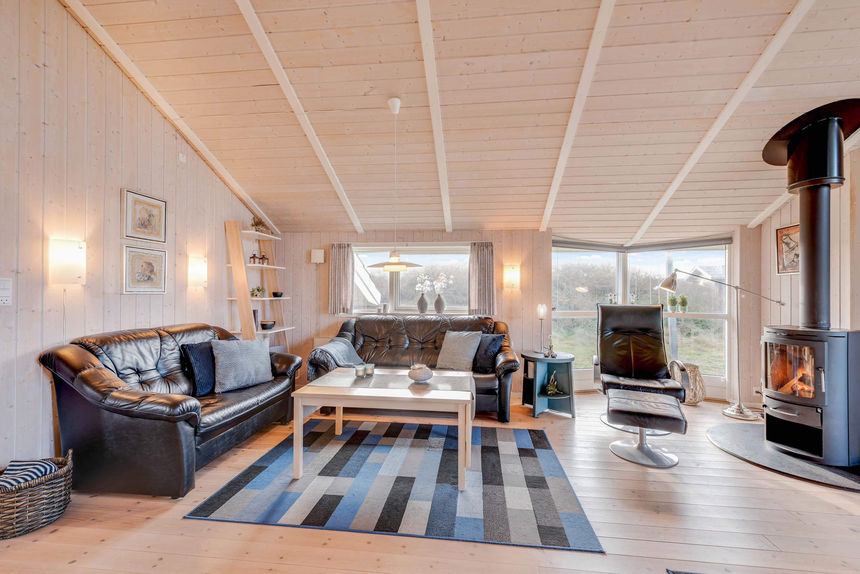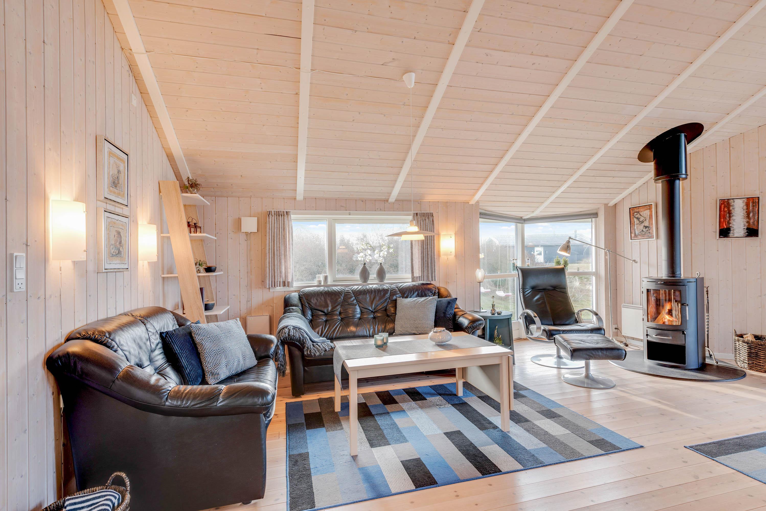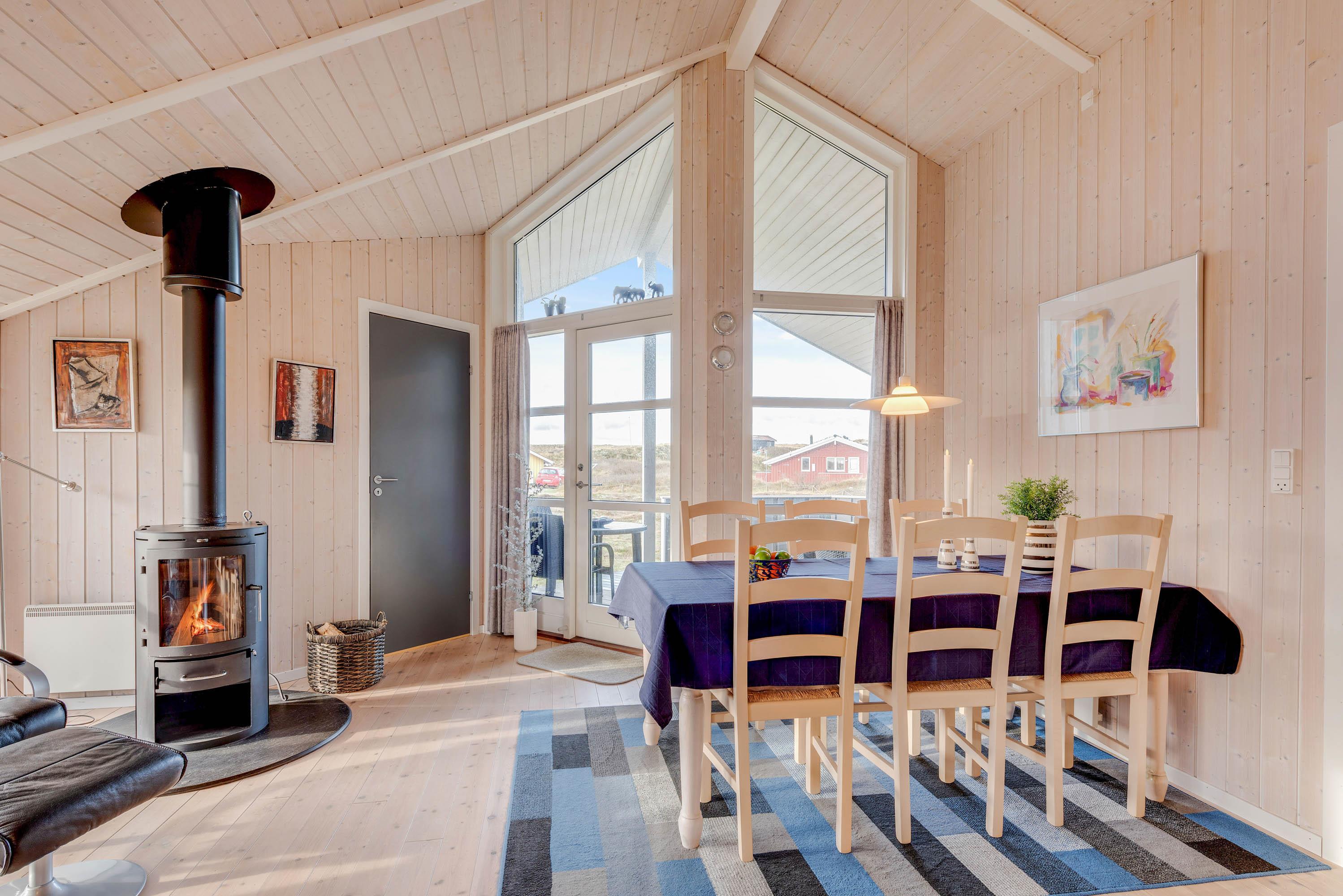 Husets hjerte er det åbne opholdsrum med stue og spiseafdeling, som ligger i åben forbindelse til det veludstyrede køkken. Her er rammerne sat for en masse hyggelige feriestunder med de nærmeste, og med den knitrende brændeovn i baggrunden bliver dagene kun endnu hyggeligere.