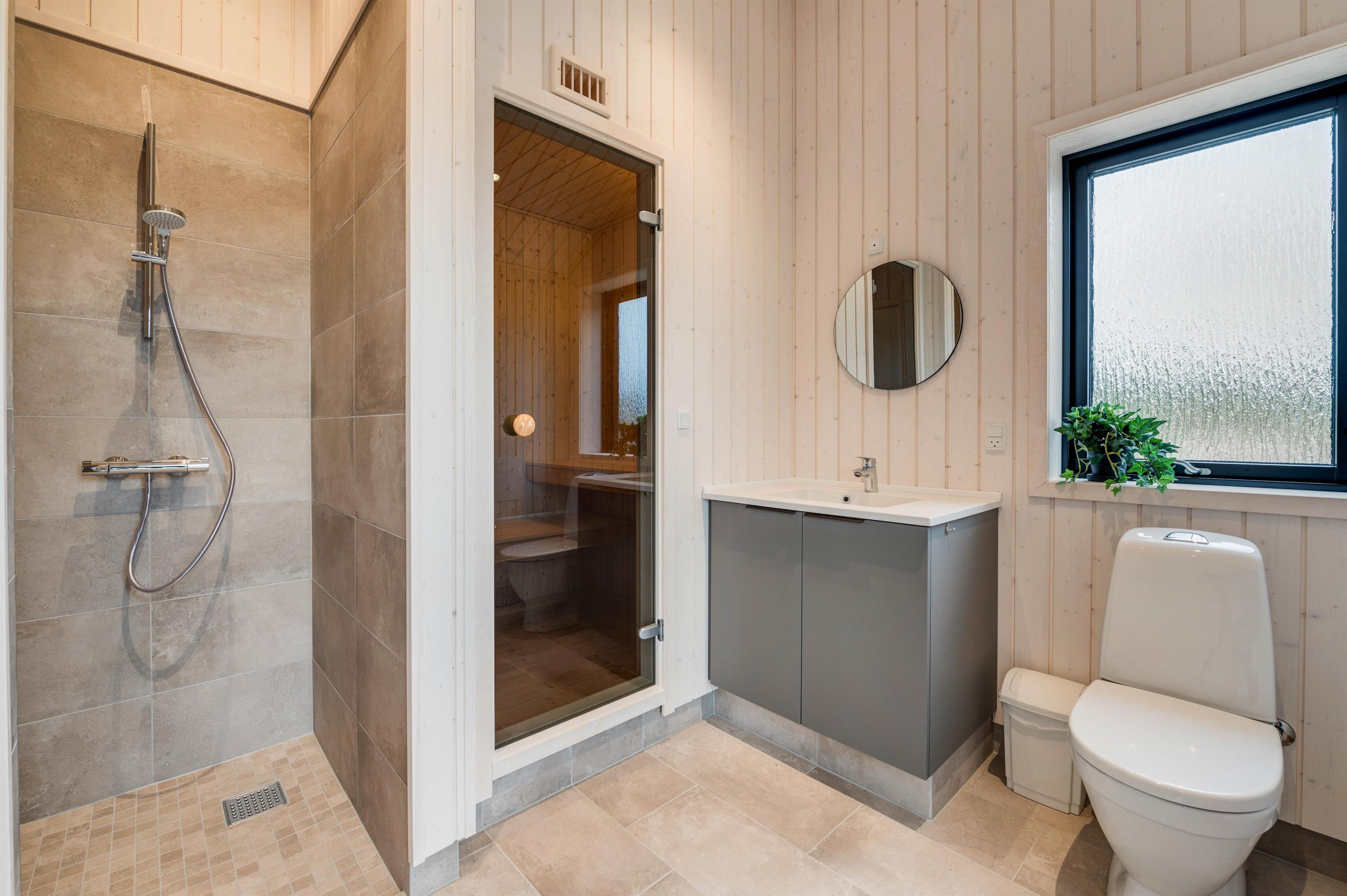 Badeværelset er med skøn gulvvarme, rigtigt dejligt til de lidt koldere morgener, når de bare fødder træder derind. I det lyse og lækre badeværelse er også feriehusets sauna, så tænd op i den og smut ind og få kroppen gennem varmet efter en dejlig gåtur i de smukke omgivelser. Ren balsam for krop og sjæl med lidt selvforkælelse!