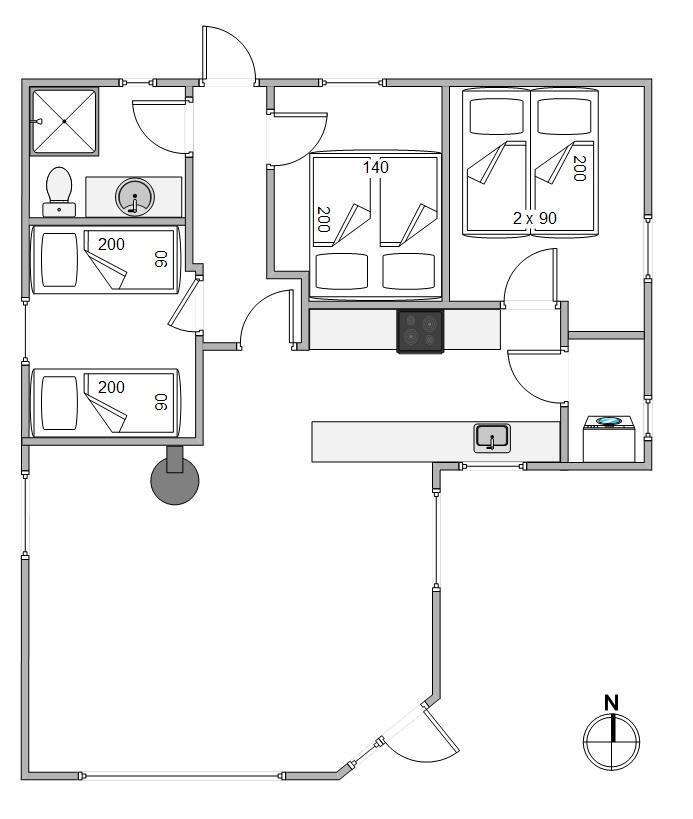Feriehuset har 3 soveværelser, hvoraf et er indrettet med en dobbeltseng og et med 2 enkeltsenge. På det sidste værelse finder I 1 enkeltseng. Her kan I samle energi til morgendagens aktiviteter.