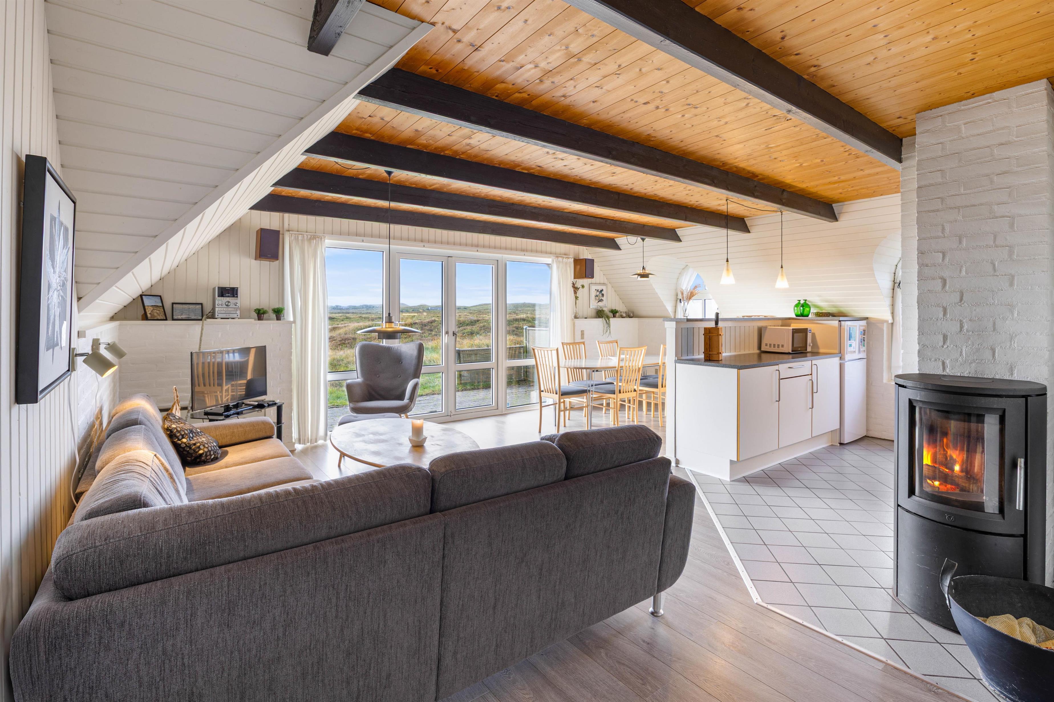 Et dejligt hus, hvor I kan nyde ferien sammen i hyggelige rammer – også sammen med jeres hunde. Feriehusets hjerterum er alrummet, der forener stue og køkken i ét. Her er plads til hygge og samvær med familie og venner, og ikke mindst en smuk udsigt udover klitlandskabet. Tag plads i sofaen, spil brætspil med familien, læs en god bog og nyd en kop kaffe. På de køligere aftener kan I tænde op i brændeovnen, der sørger for den rette feriestemning.
