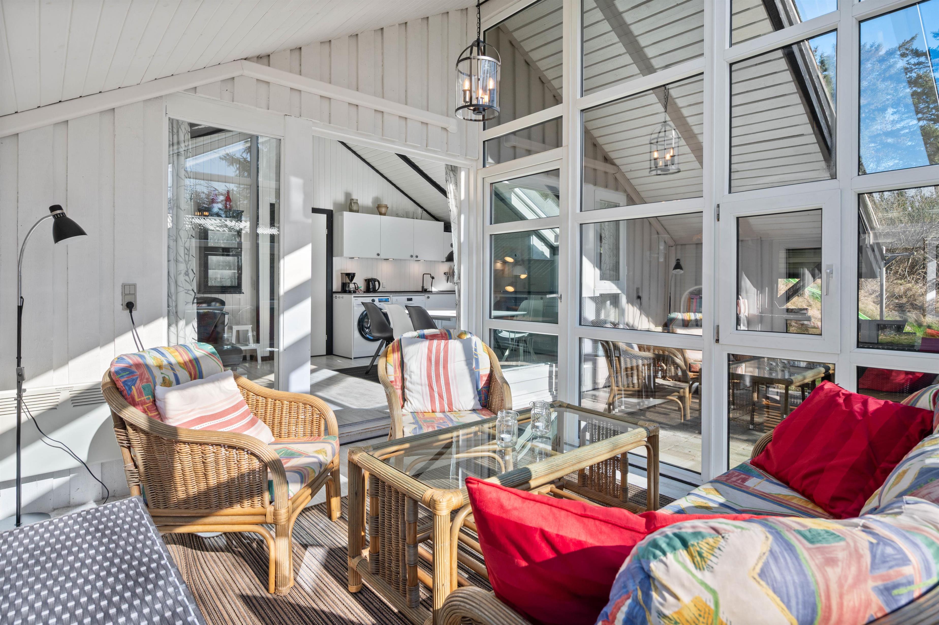 Terrassen er placeret mod syd og er delvist overdækket og afskærmet, hvilket gør den ideel til grillaftener. Sommerhusgrunden er omgivet af træer, som giver en dejlig ro, duft og feriestemning. Her kan I spille boldspil eller lade alle deltage i et vikingespil. Vesterhavet er kun en frisk gåtur væk fra huset, og her er naturligvis gode muligheder for lange og skønne traveture med både børn og hund.
