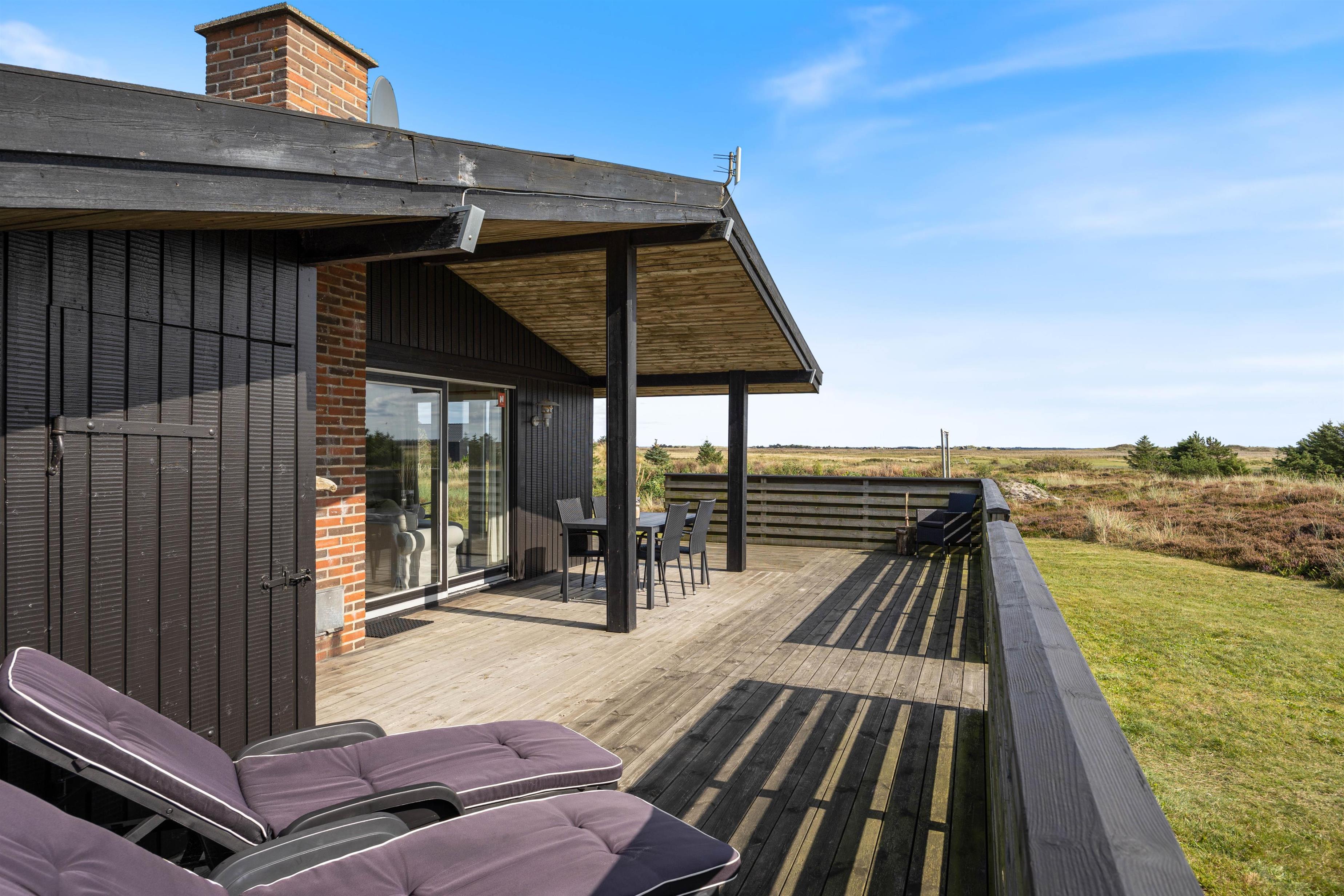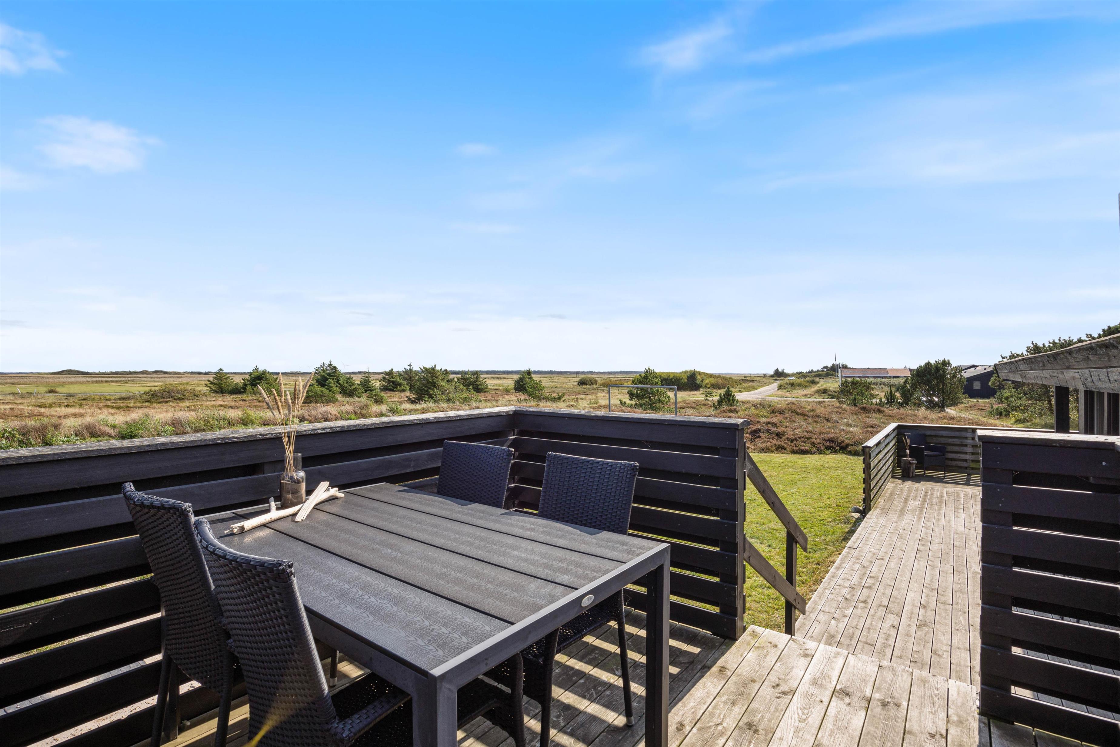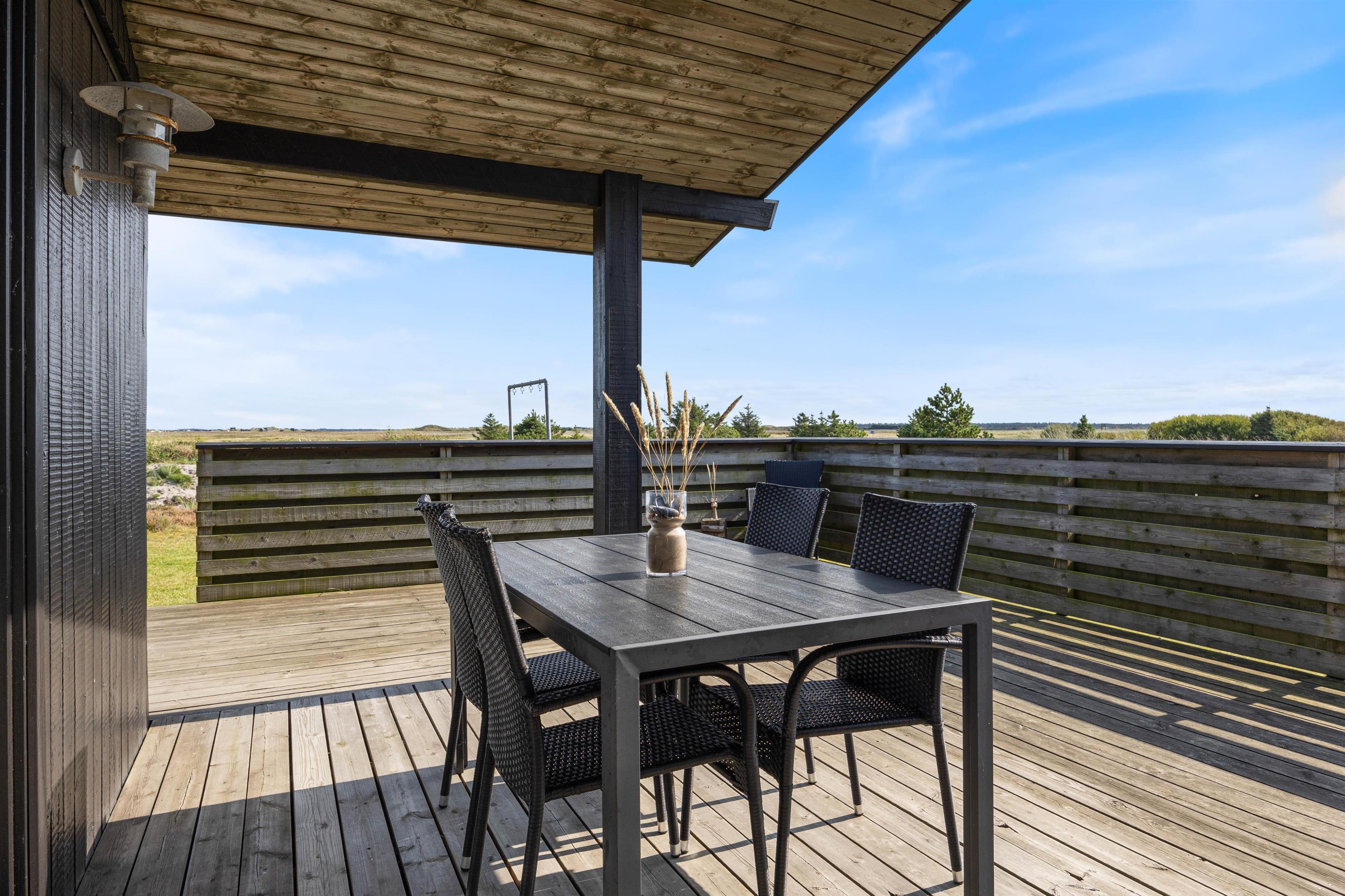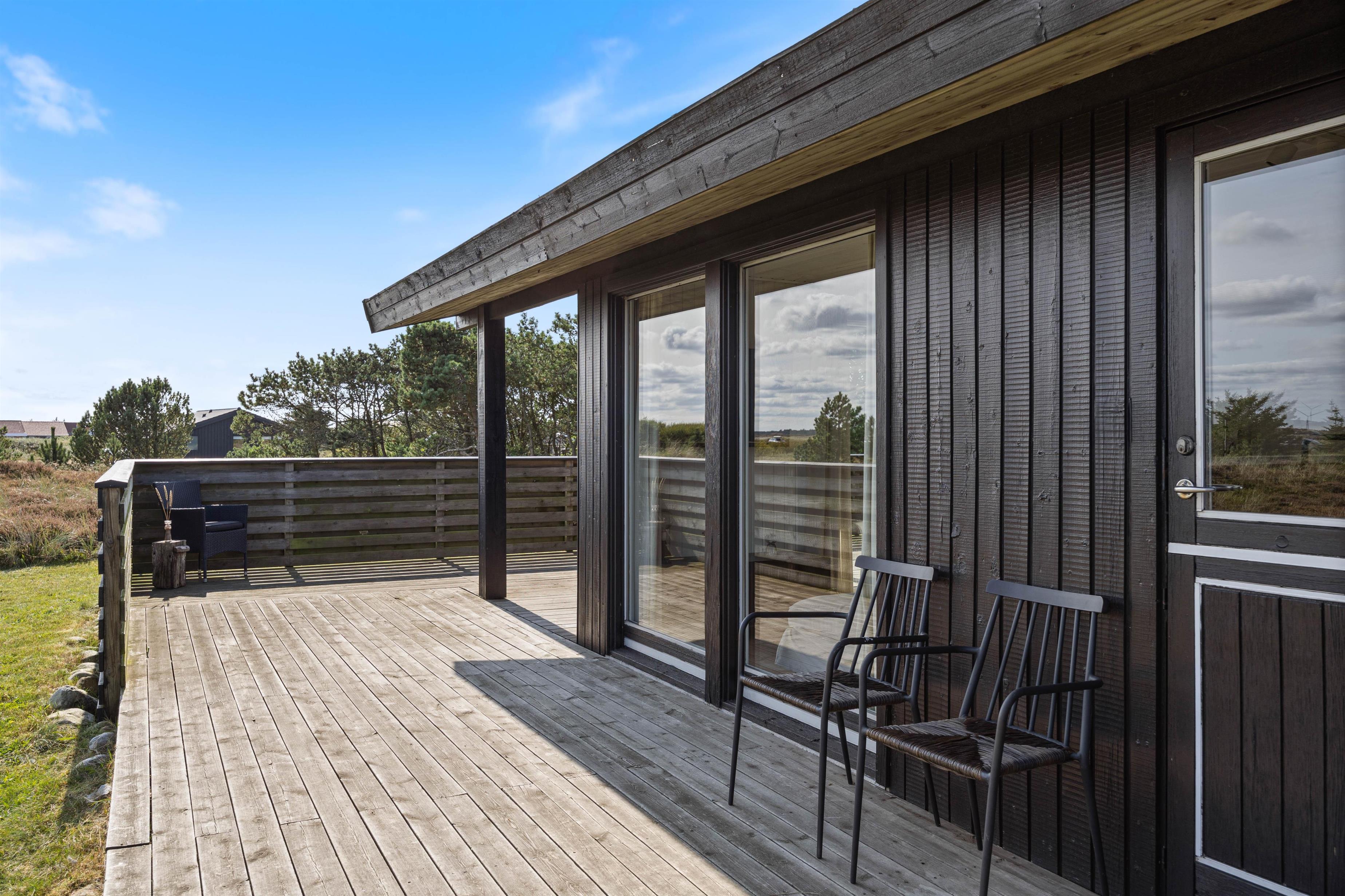 Fra alrummet har I udgang til sommerhusets terrasse, der strækker sig fra øst- til sydsiden af sommerhuset. Den sydlige del er delvist overdækket, så her kan I sidde i ly, hvis der skulle komme en lille regnbyge på en ellers lun sommerdag. På østsiden fører en trappe jer op til en lille, hævet terrasse, hvorfra udsigten til heden bestemt er værd at nyde.