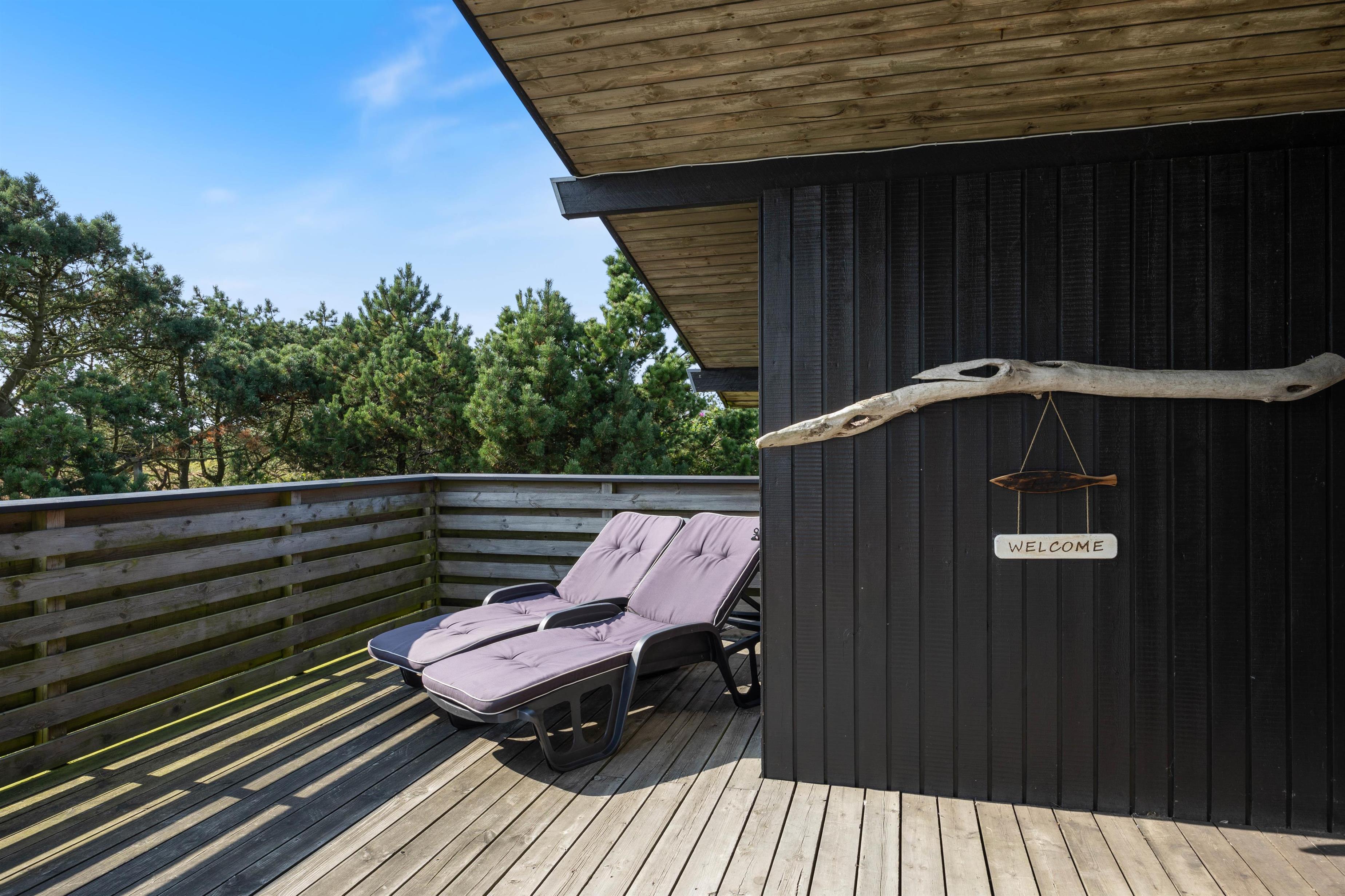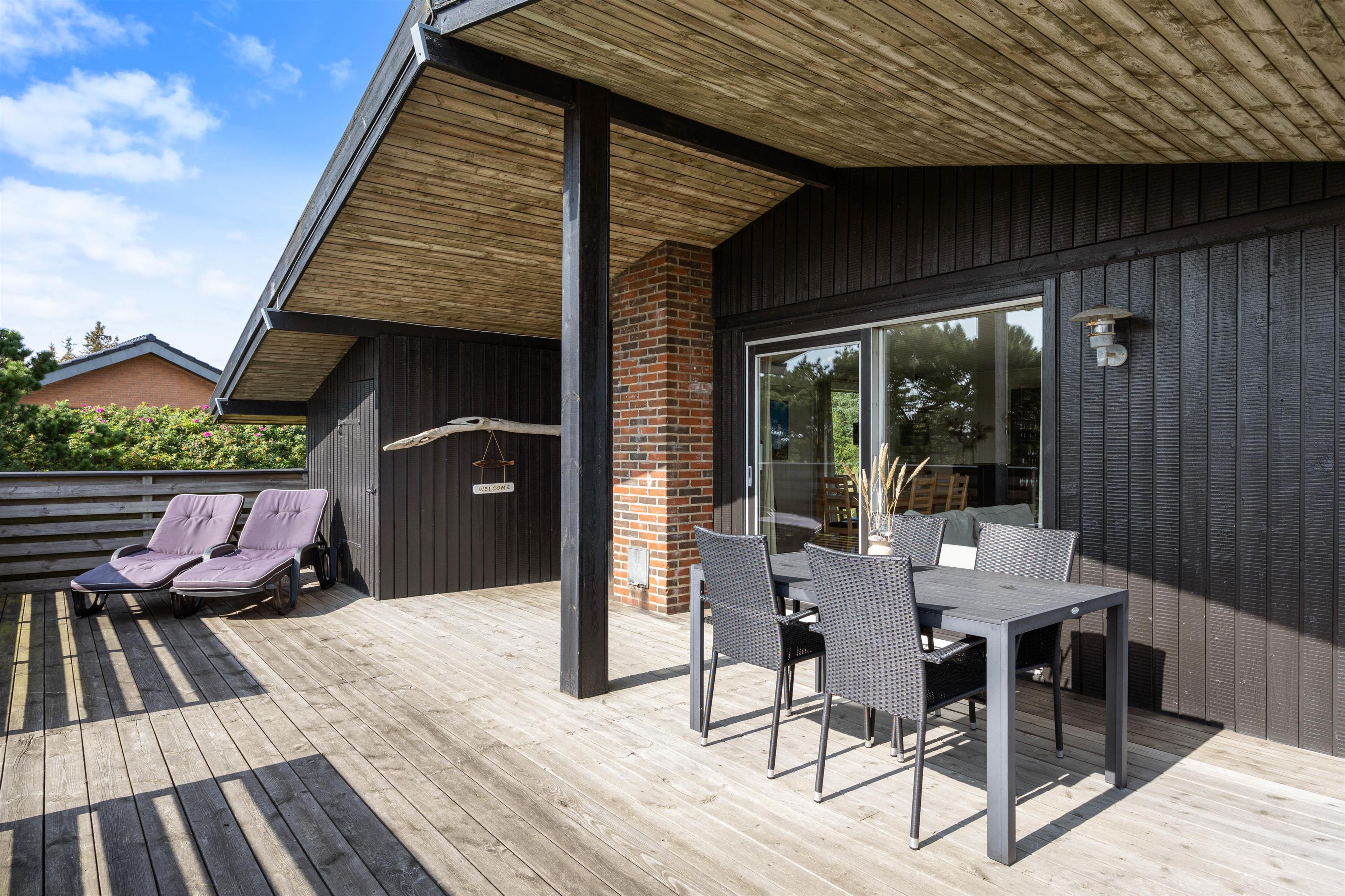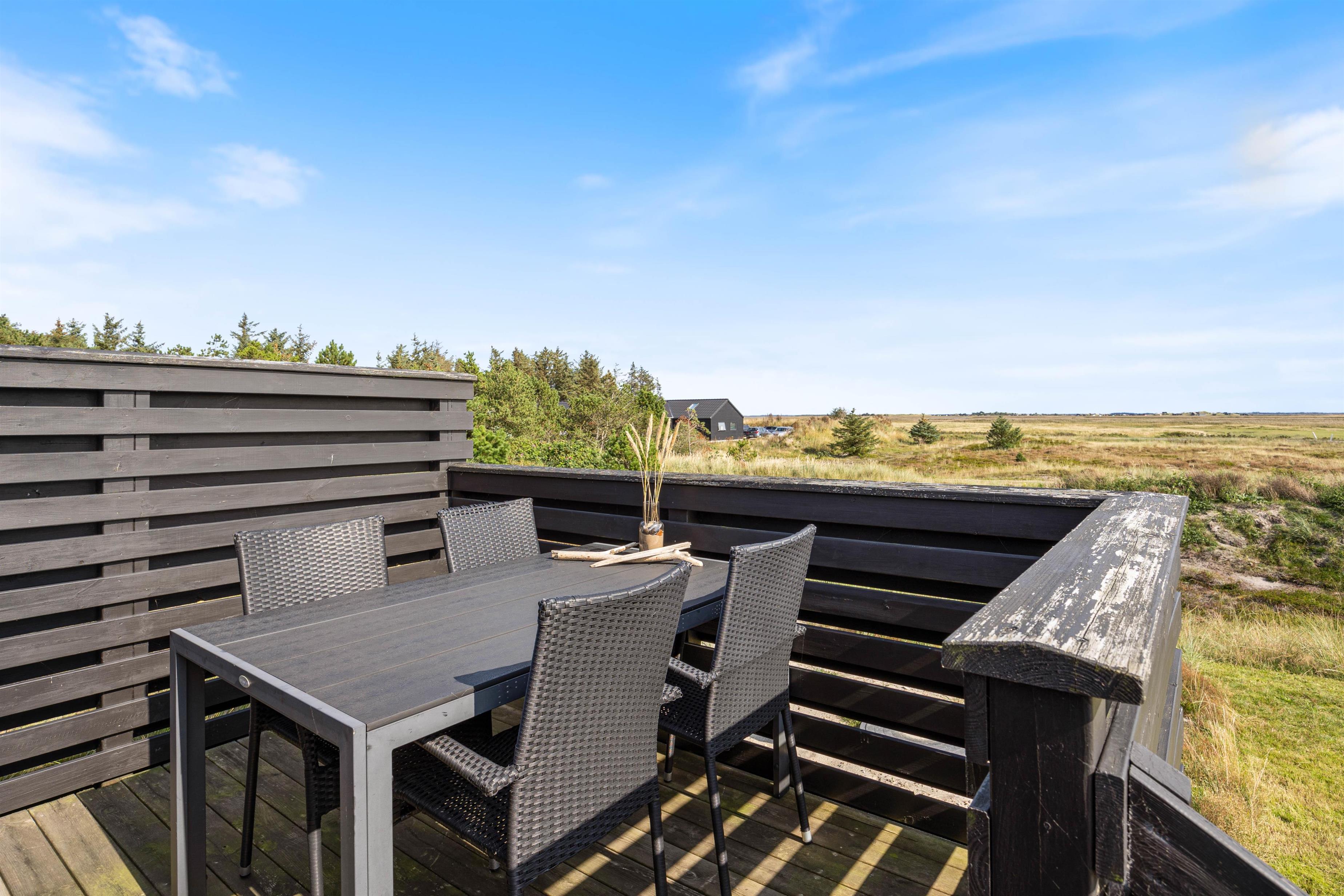 Fra alrummet har I udgang til sommerhusets terrasse, der strækker sig fra øst- til sydsiden af sommerhuset. Den sydlige del er delvist overdækket, så her kan I sidde i ly, hvis der skulle komme en lille regnbyge på en ellers lun sommerdag. På østsiden fører en trappe jer op til en lille, hævet terrasse, hvorfra udsigten til heden bestemt er værd at nyde.