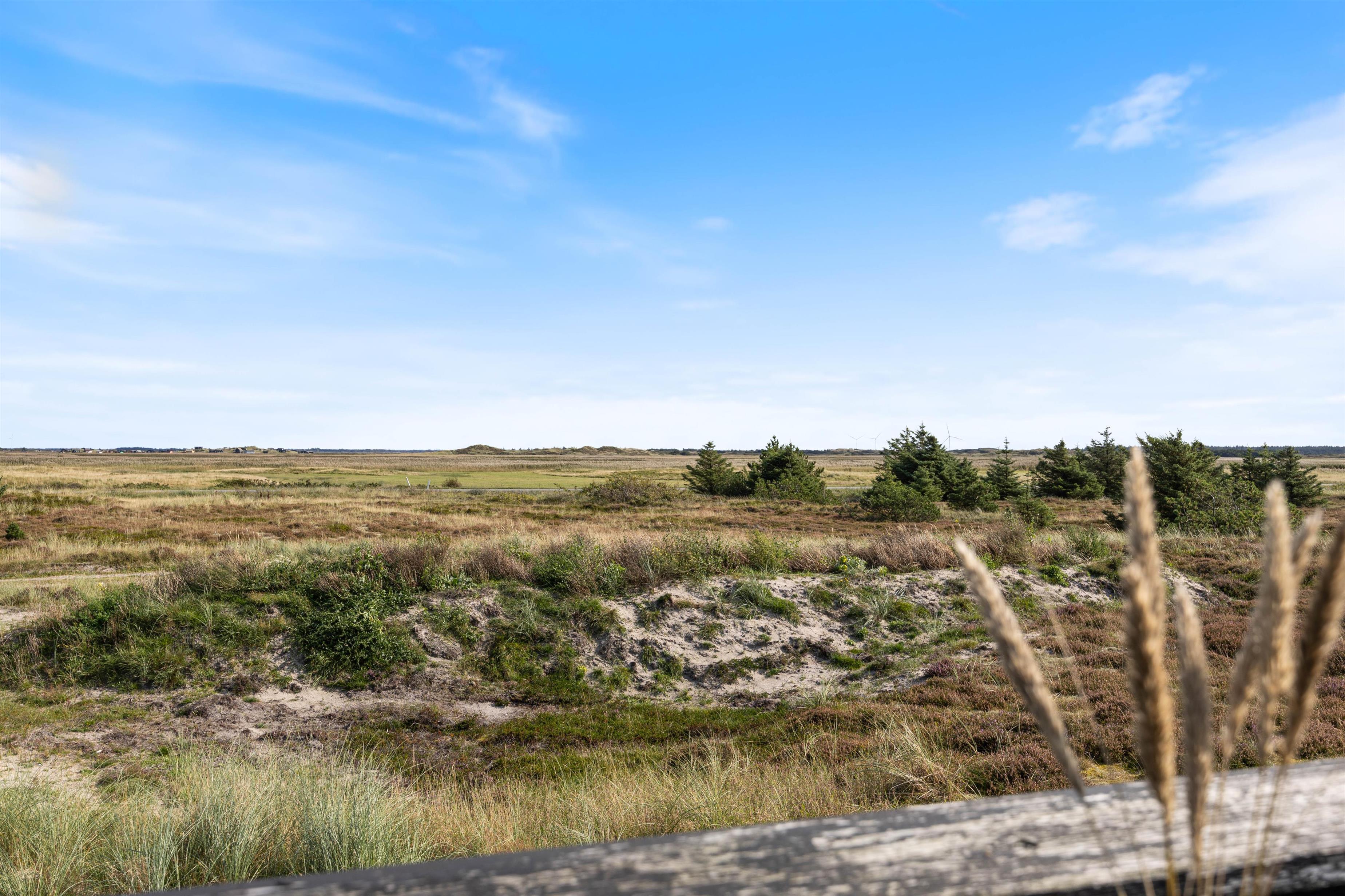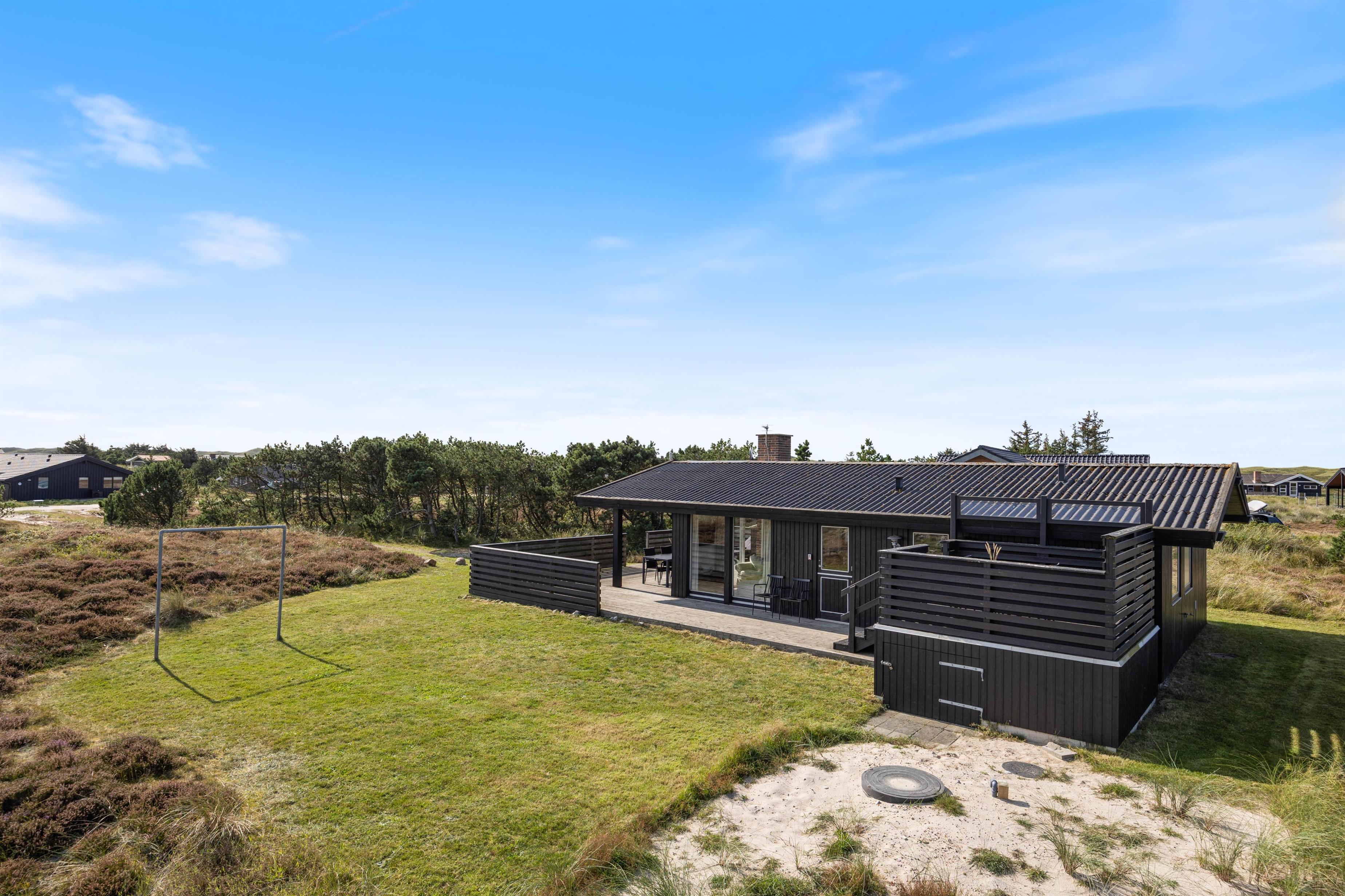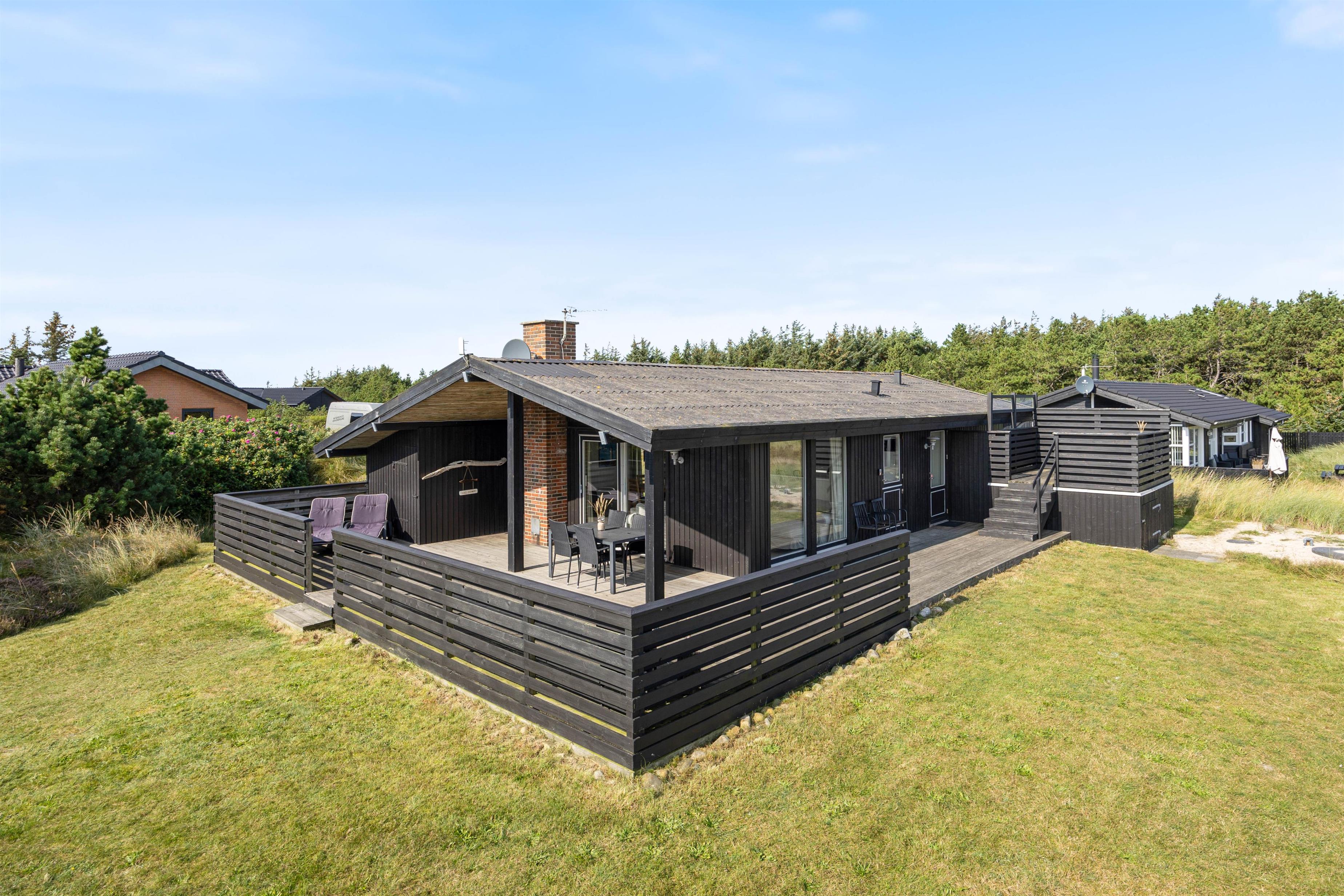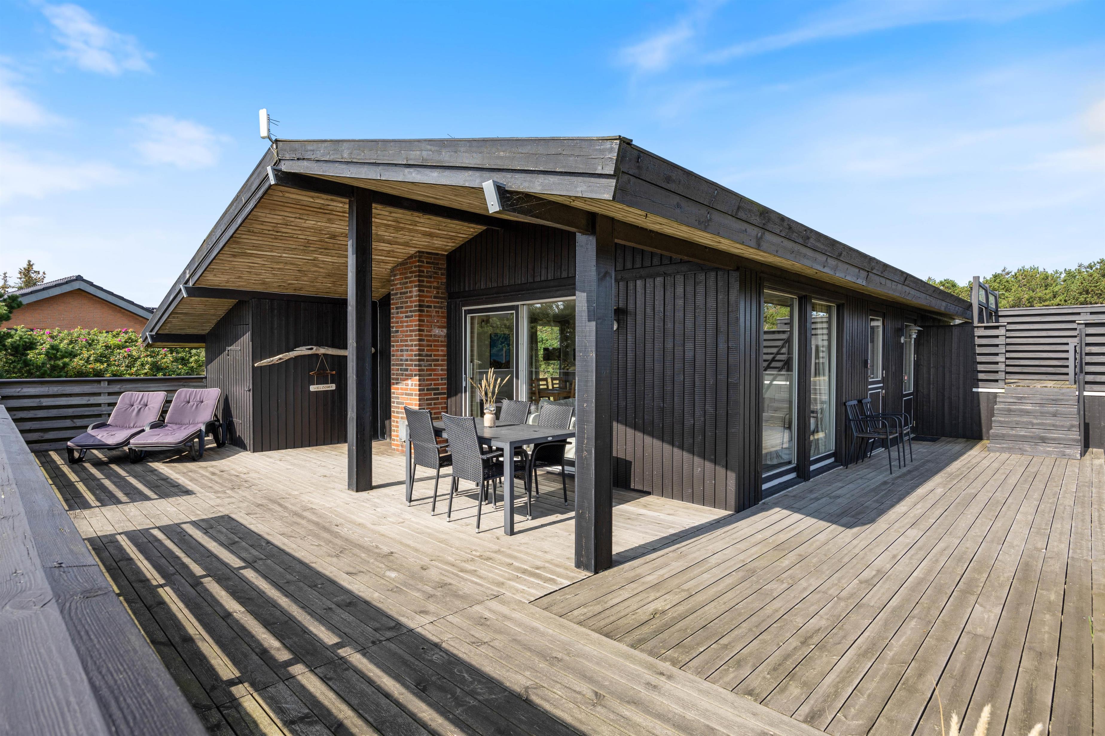Fra alrummet har I udgang til sommerhusets terrasse, der strækker sig fra øst- til sydsiden af sommerhuset. Den sydlige del er delvist overdækket, så her kan I sidde i ly, hvis der skulle komme en lille regnbyge på en ellers lun sommerdag. På østsiden fører en trappe jer op til en lille, hævet terrasse, hvorfra udsigten til heden bestemt er værd at nyde.