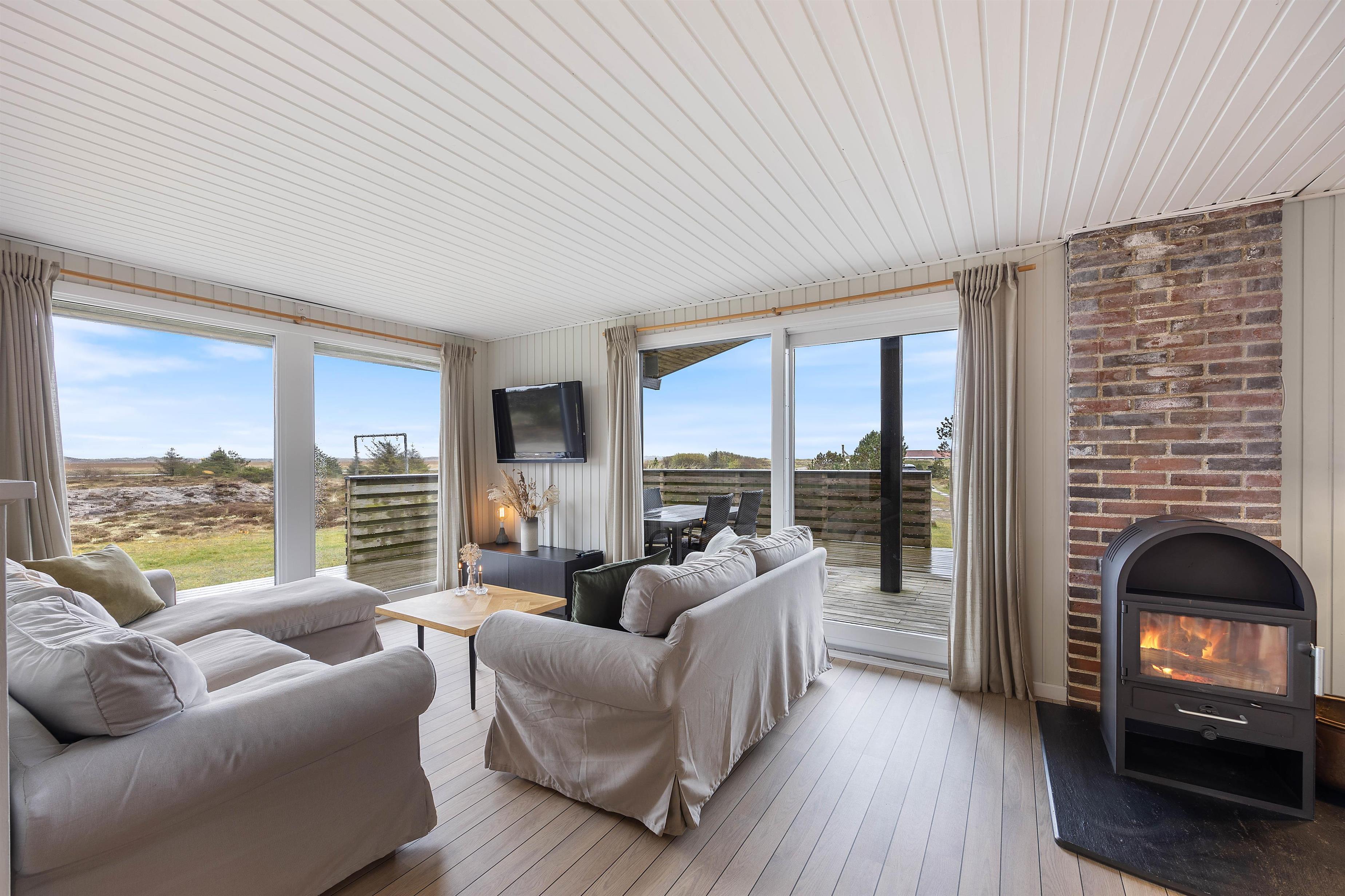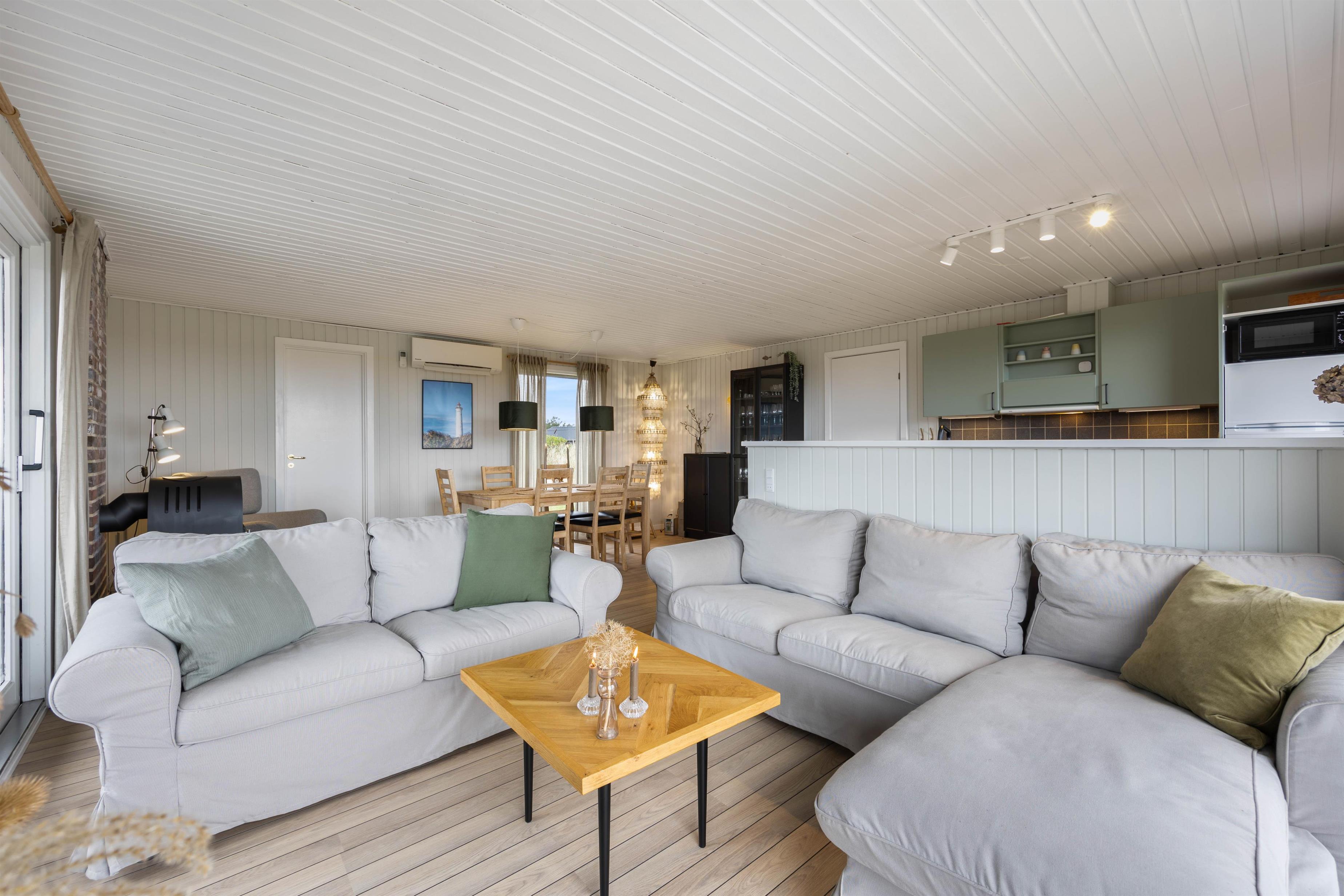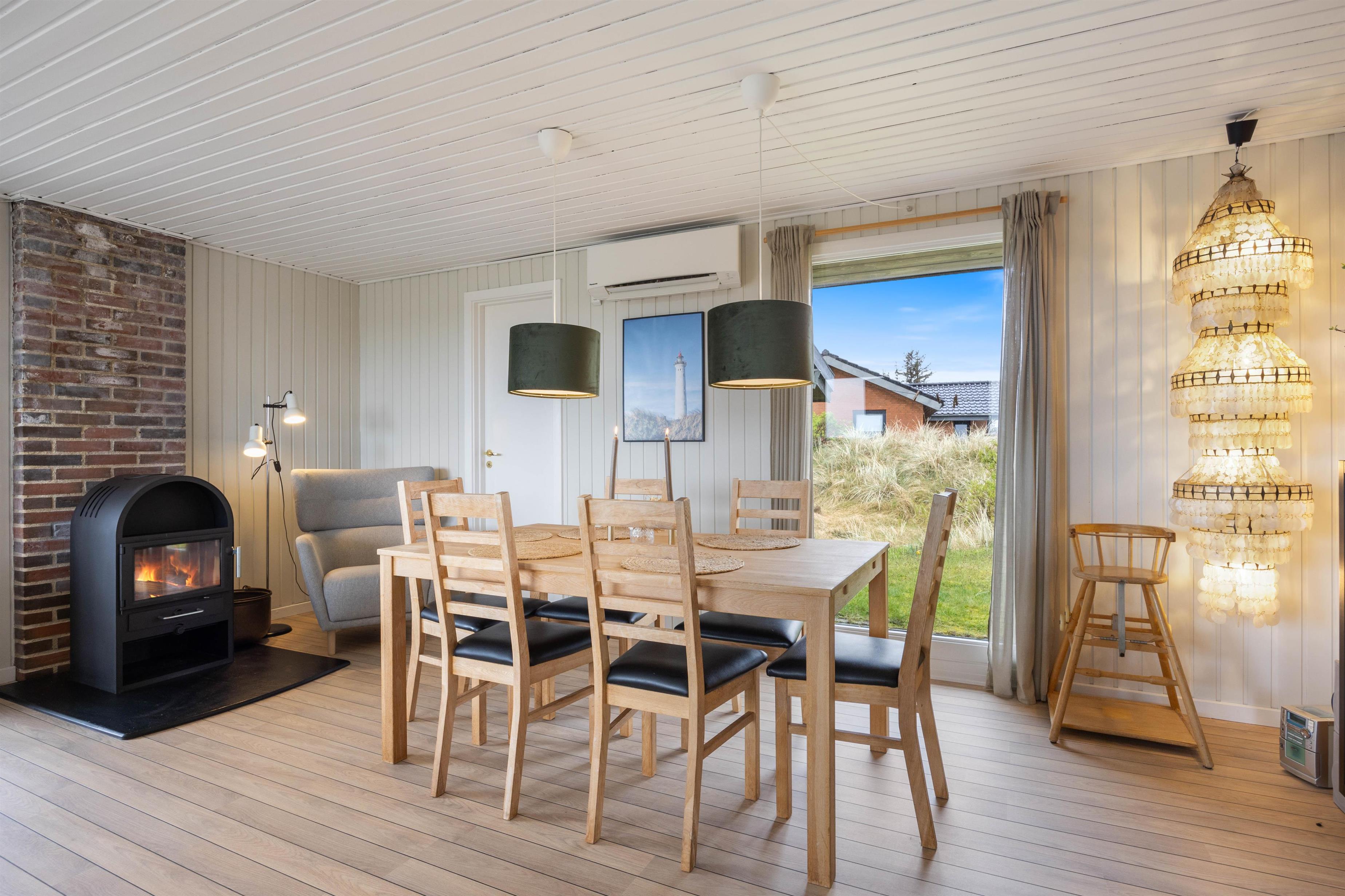 Alrummet vil være samlingspunktet i løbet af jeres ferie, og her kan I nyde mange hyggelige stunder med familien. Tænd op i brændeovnen og nyd den fantastiske udsigt til det omkringliggende hede-areal, der udfolder sig gennem de store vinduespartier. Til en hyggelig filmaften kan I streame en god film gennem sommerhusets Chromecast. Som supplement til brændeovnen kan I med fordel benytte jer af den energibesparende varmepumpe til at holde en behagelig temperatur i rummet.