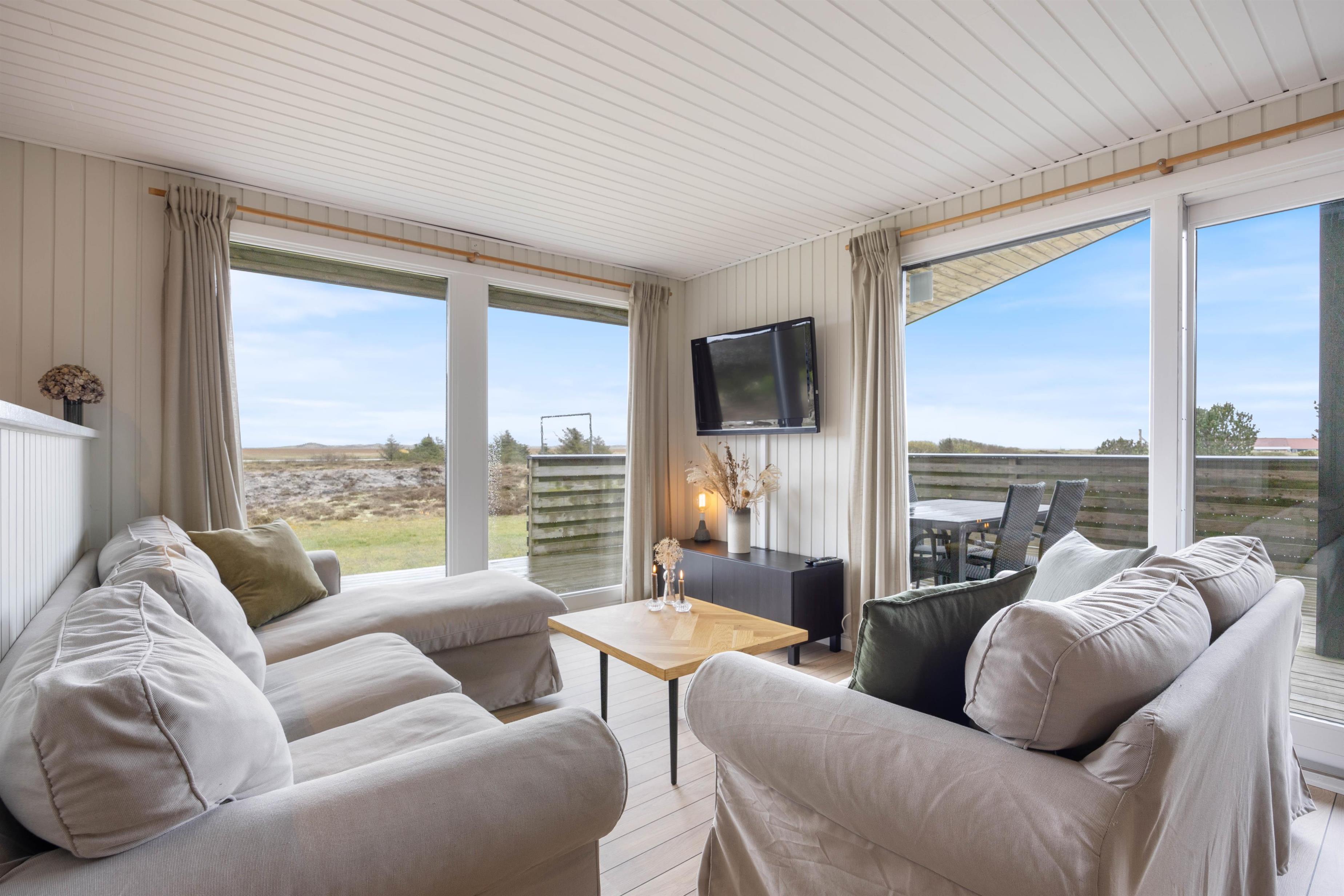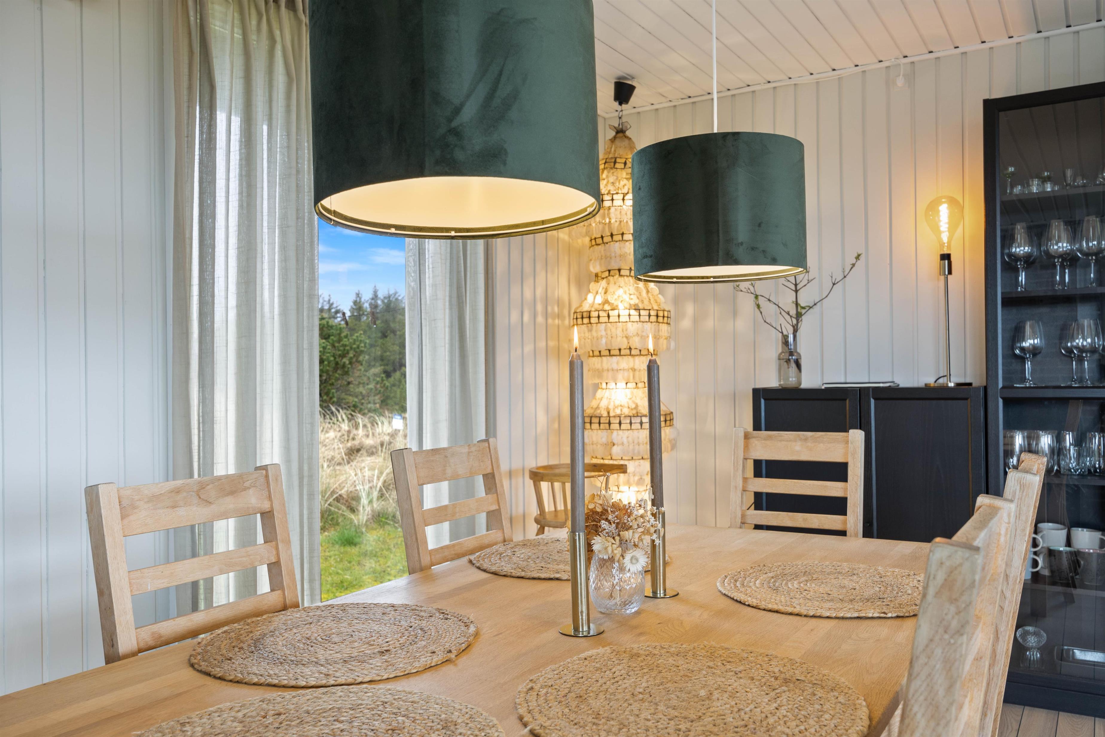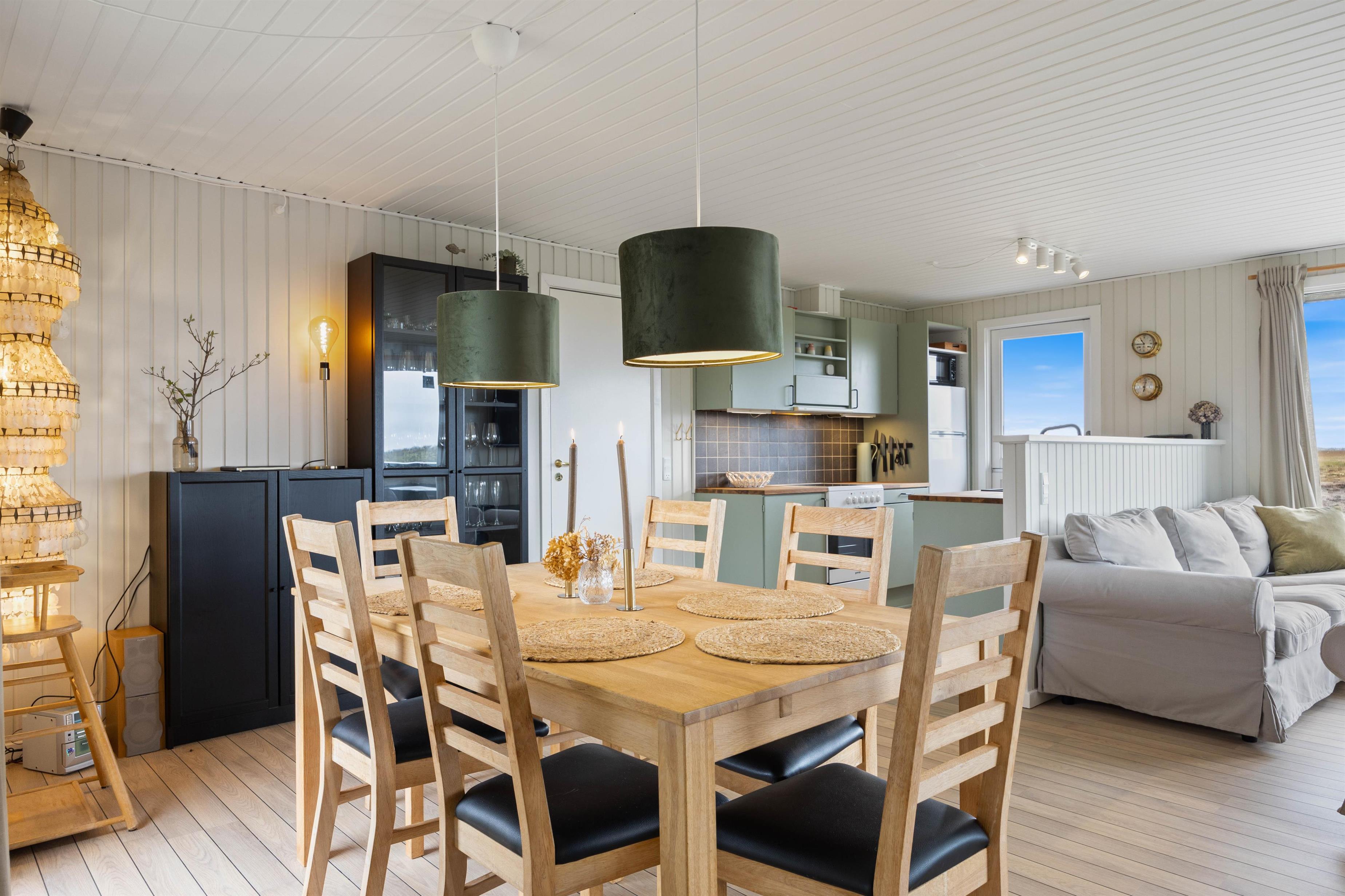 Alrummet vil være samlingspunktet i løbet af jeres ferie, og her kan I nyde mange hyggelige stunder med familien. Tænd op i brændeovnen og nyd den fantastiske udsigt til det omkringliggende hede-areal, der udfolder sig gennem de store vinduespartier. Til en hyggelig filmaften kan I streame en god film gennem sommerhusets Chromecast. Som supplement til brændeovnen kan I med fordel benytte jer af den energibesparende varmepumpe til at holde en behagelig temperatur i rummet.