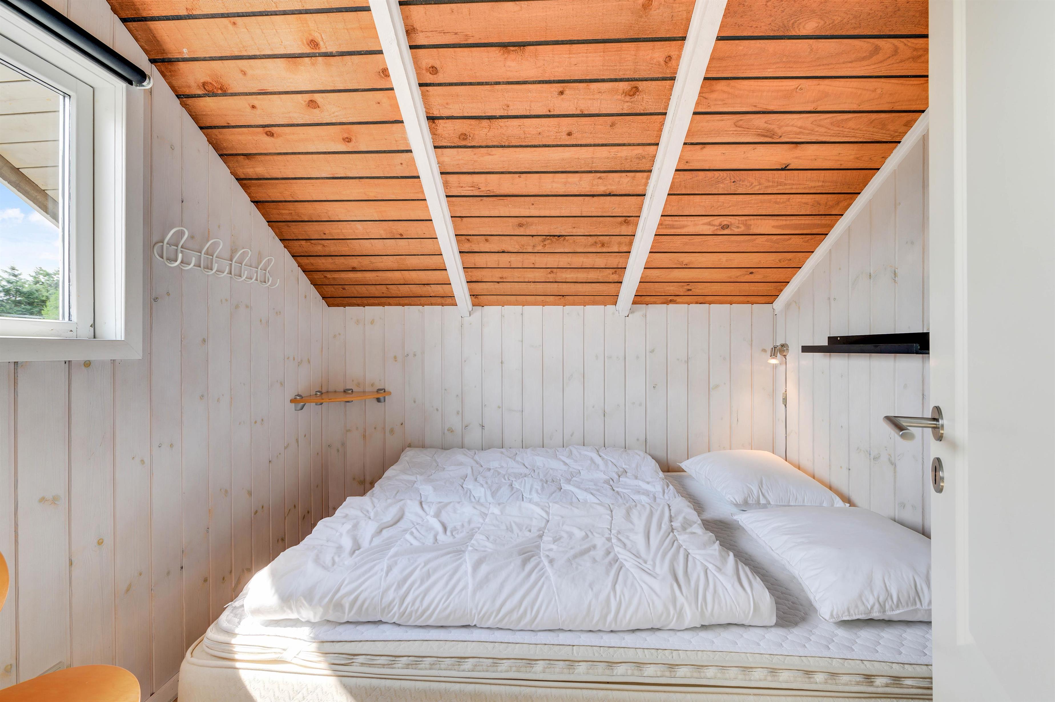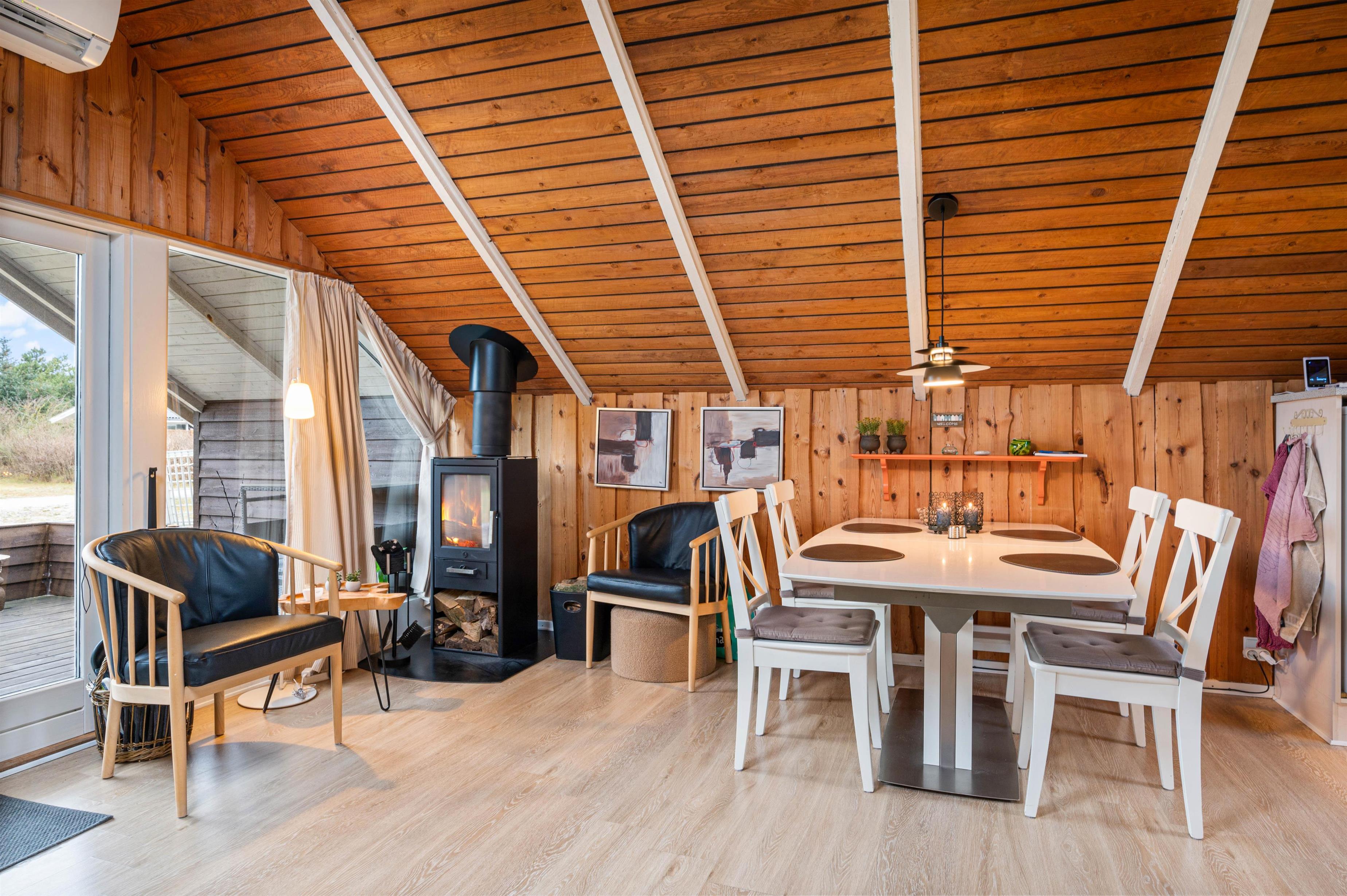 Sommerhusets køkken ligger i direkte forbindelse med spiseplads og stue, som indbyder til mange hyggelige stunder i godt selskab. Det vestvendte vinduesparti i opholdsrummet skaber et godt lysindfald, som gør rummet lyst og indbydende. Træloftet er åbent til kip og sammen med de hvide bjælker, skabes der en rigtig hyggelig feriestemning i rummet.