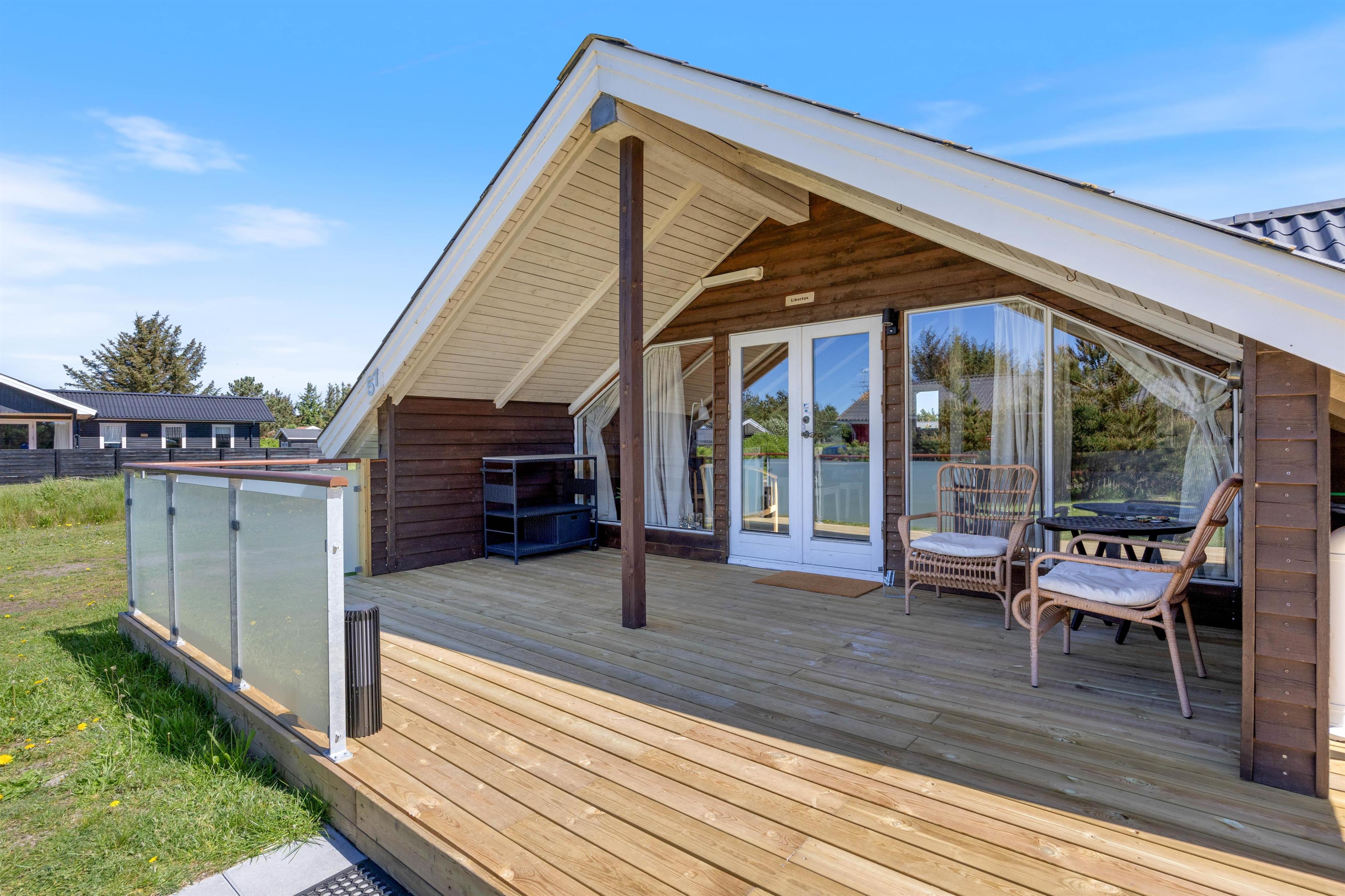 Fra opholdsrummet kan I træde direkte ud på den store, vestvendte træterrasse, som også strækker sig til sommerhusets sydside. Grillen og de komfortable havemøbler står klar til en hyggelig grillmiddag på en lun sommeraften. Terrassen er delvist overdækket og afskærmet, så I kan sidde i læ for regn og vind.